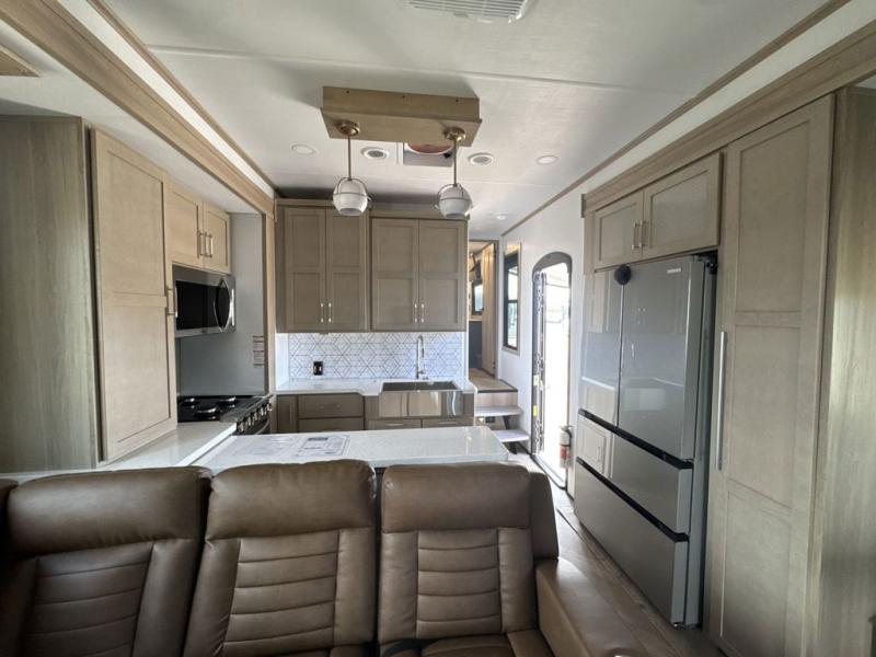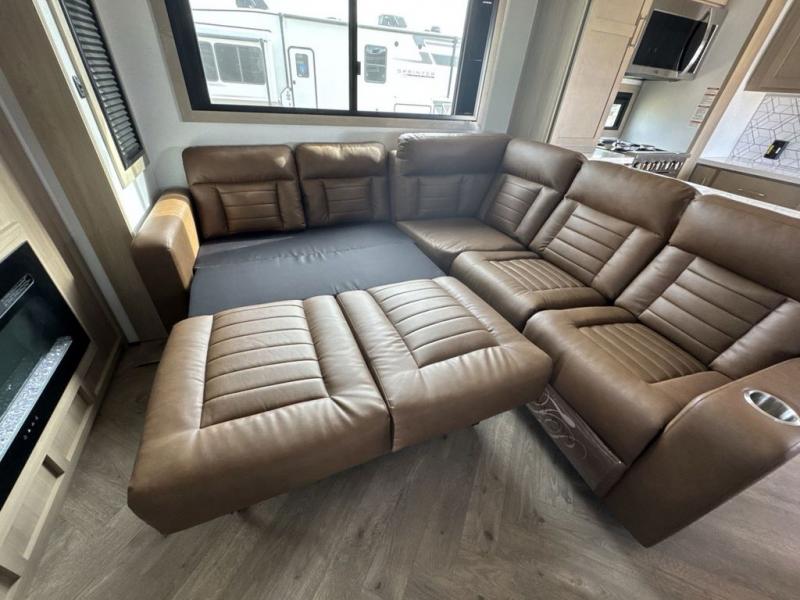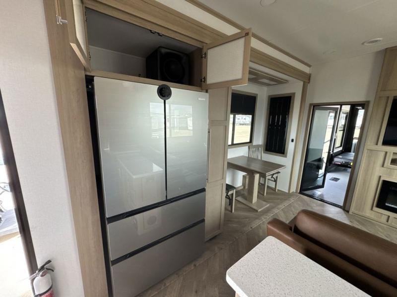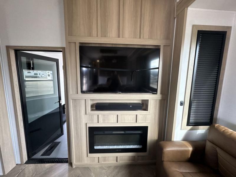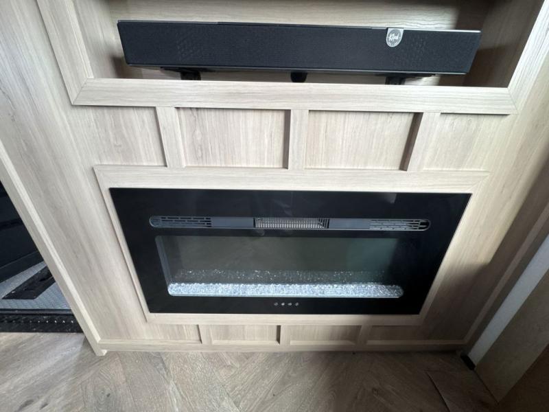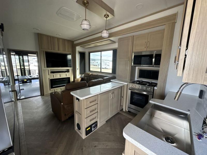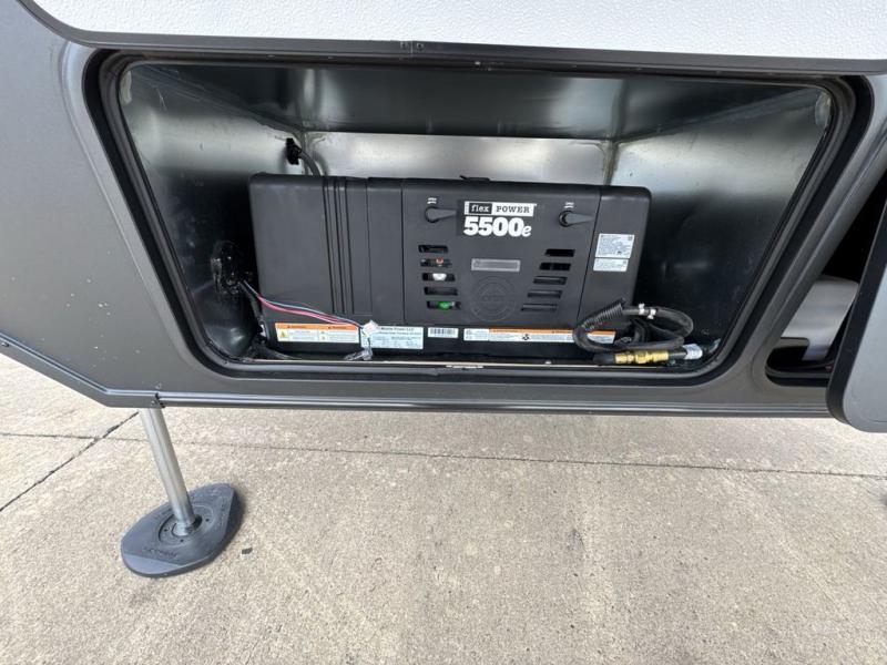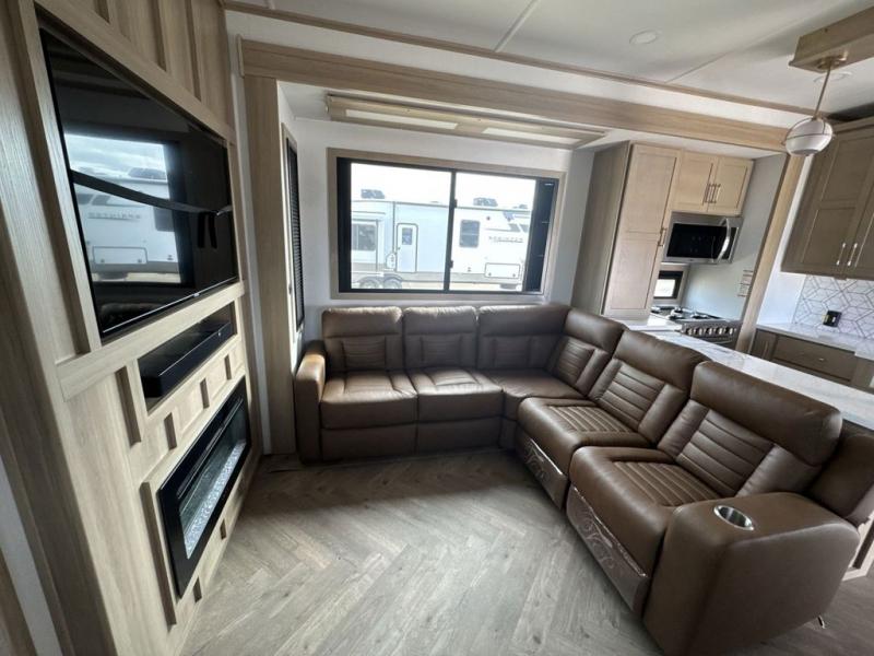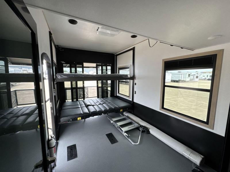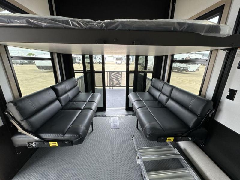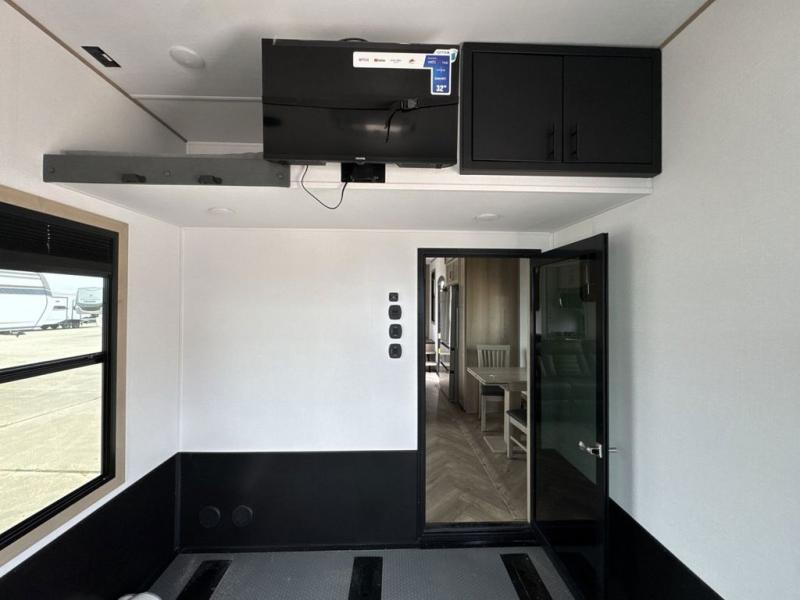 The whole family will love camping in this fifth wheel toy hauler! The front private bedroom has a king bed slide for more interior space, a Smart LED TV, a front large wardrobe, plus washer and dryer prep. Freshen up each morning in the full bathroom with the fiberglass one-piece shower then head to the kitchen to fry up some eggs on the four-burner range and bake some cinnamon rolls in the 24" stainless steel oven. Grab a cold cup of orange juice from the 20-cu. ft. 12-volt refrigerator and enjoy it along with the eggs at the dinette table or in the 15' garage on one of the dual opposing sofas with cupholders. The L-shaped hide-a-bed sofa is conveniently across from the entertainment center with a 50" Smart LED TV and fireplace. As you head into the 15' garage area, you will notice a loft with a twin bed, a queen bed above the opposing sofas, Adjust-A-Track frame welded tie downs, and one of the dual entry doors to the unit!