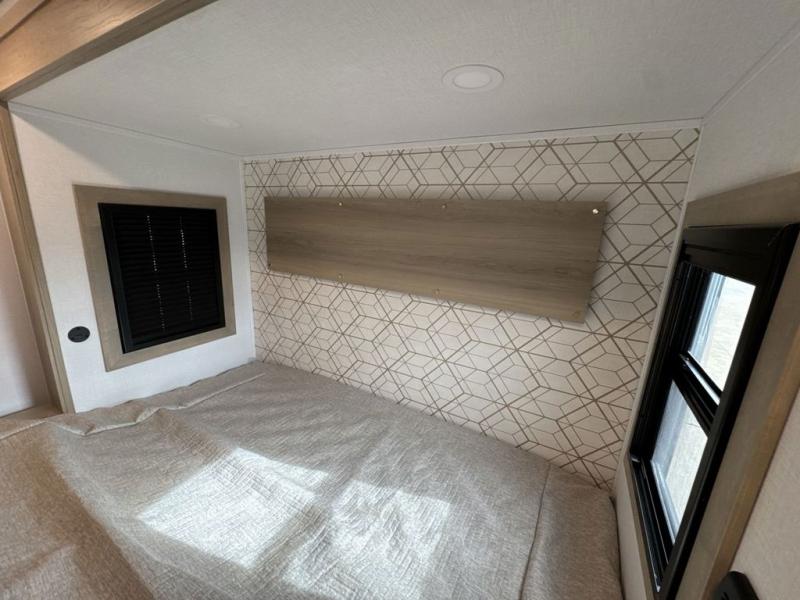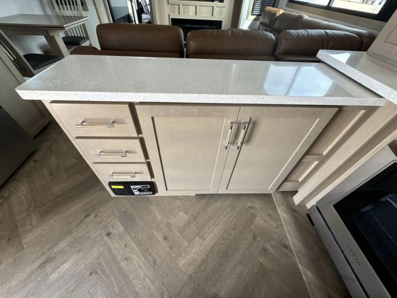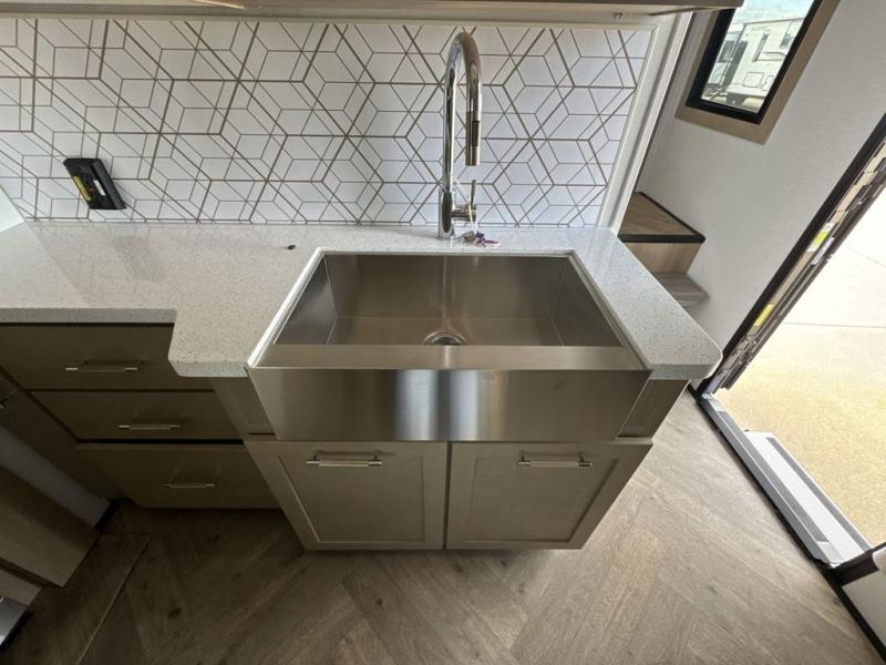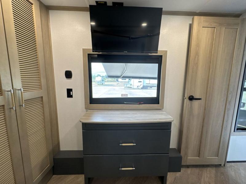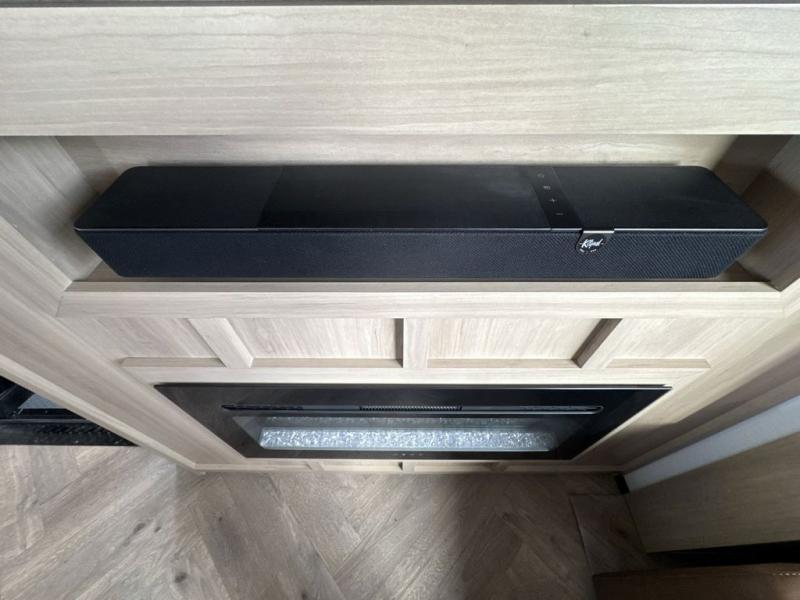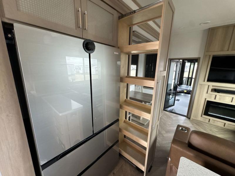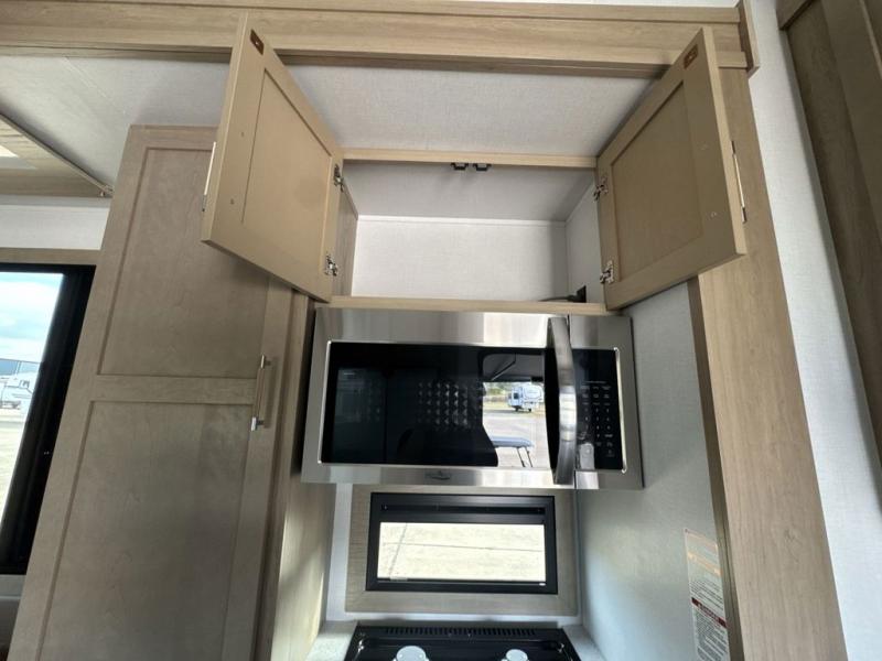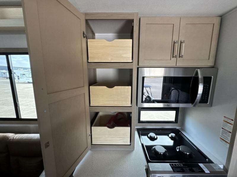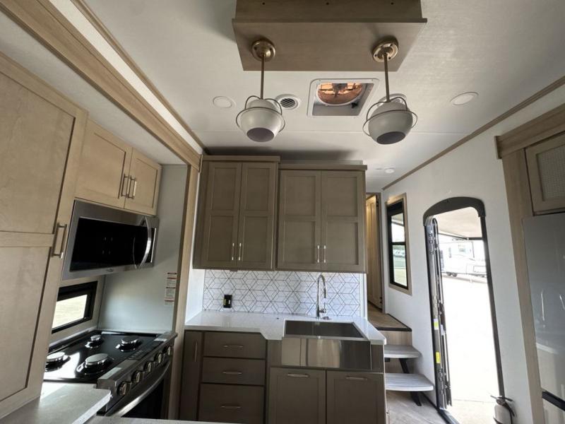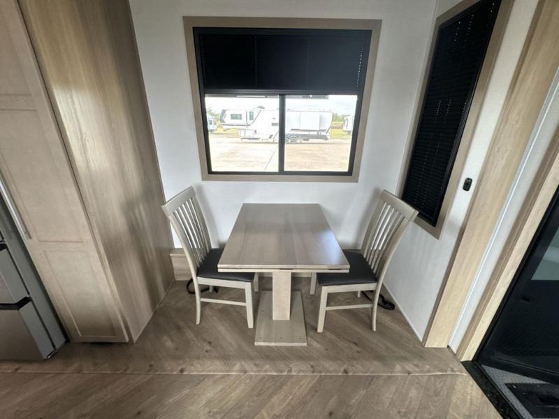 The whole family will love camping in this fifth wheel toy hauler! The front private bedroom has a king bed slide for more interior space, a Smart LED TV, a front large wardrobe, plus washer and dryer prep. Freshen up each morning in the full bathroom with the fiberglass one-piece shower then head to the kitchen to fry up some eggs on the four-burner range and bake some cinnamon rolls in the 24" stainless steel oven. Grab a cold cup of orange juice from the 20-cu. ft. 12-volt refrigerator and enjoy it along with the eggs at the dinette table or in the 15' garage on one of the dual opposing sofas with cupholders. The L-shaped hide-a-bed sofa is conveniently across from the entertainment center with a 50" Smart LED TV and fireplace. As you head into the 15' garage area, you will notice a loft with a twin bed, a queen bed above the opposing sofas, Adjust-A-Track frame welded tie downs, and one of the dual entry doors to the unit!