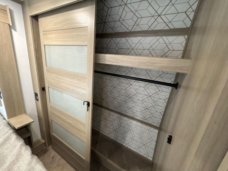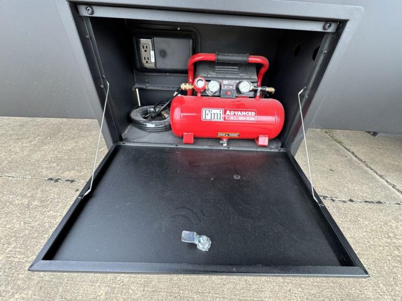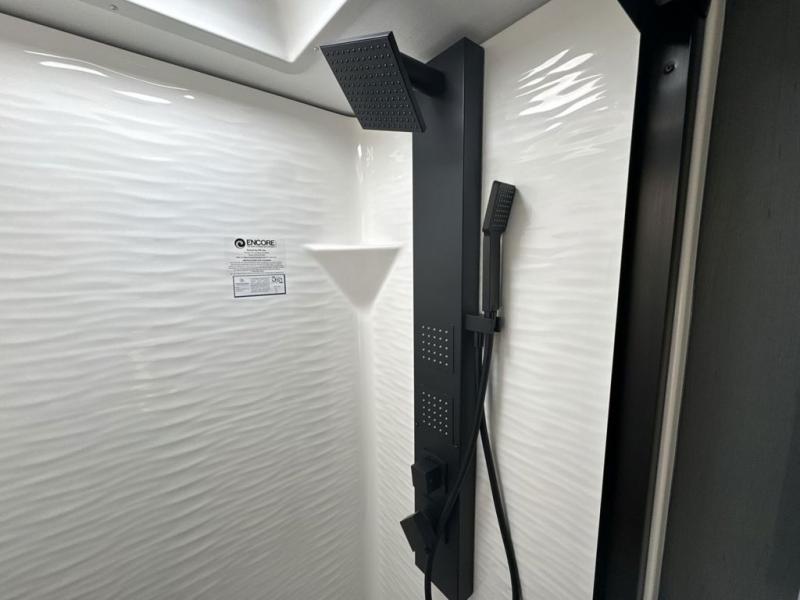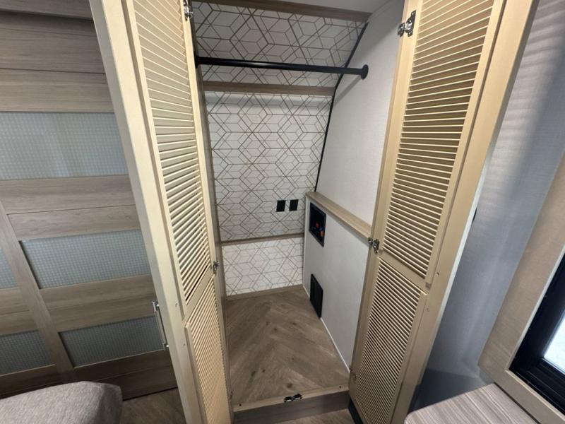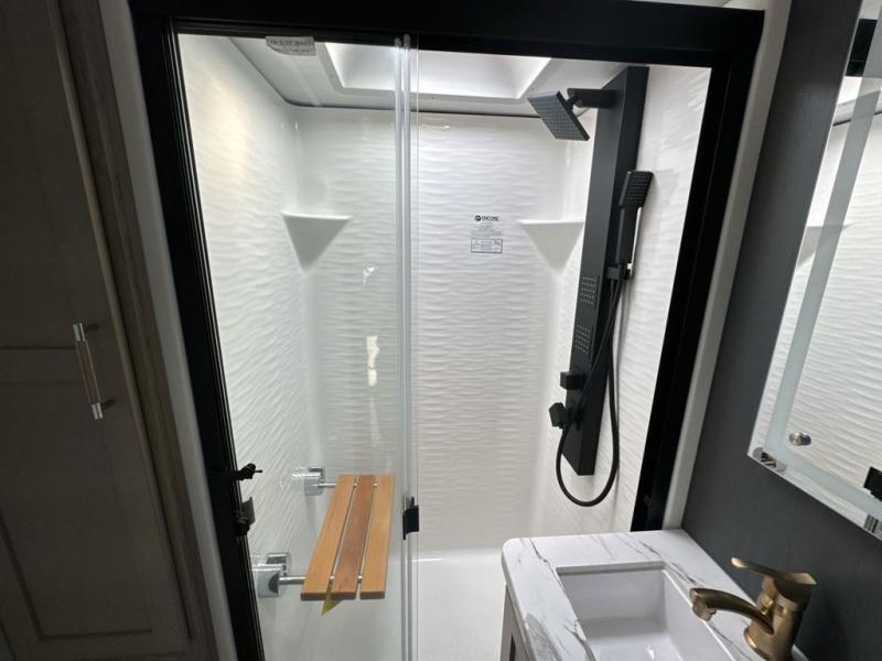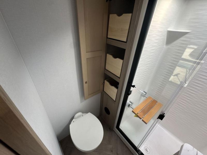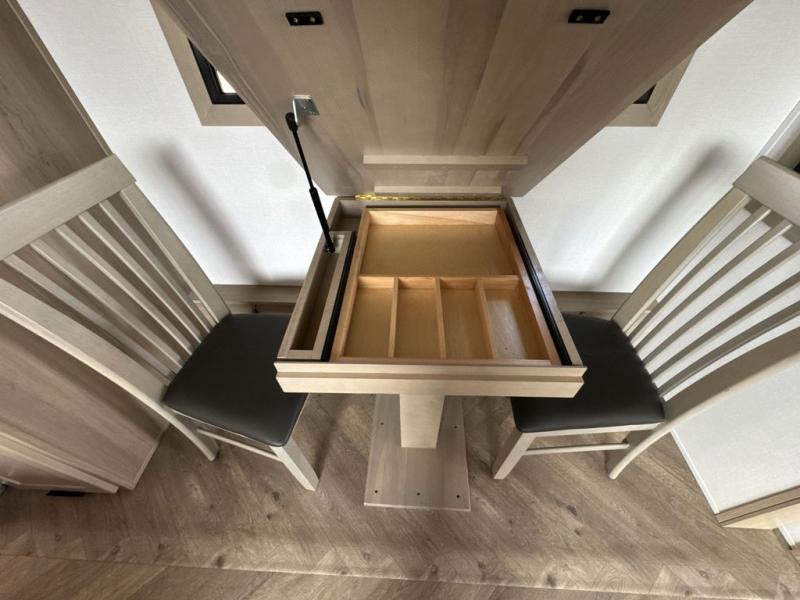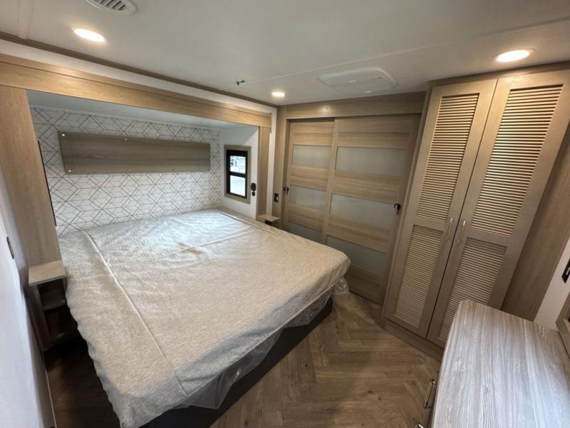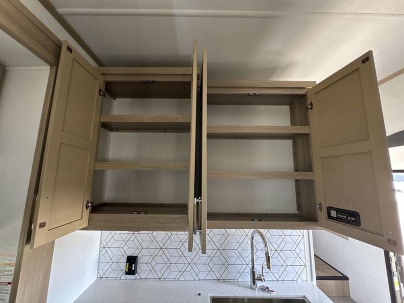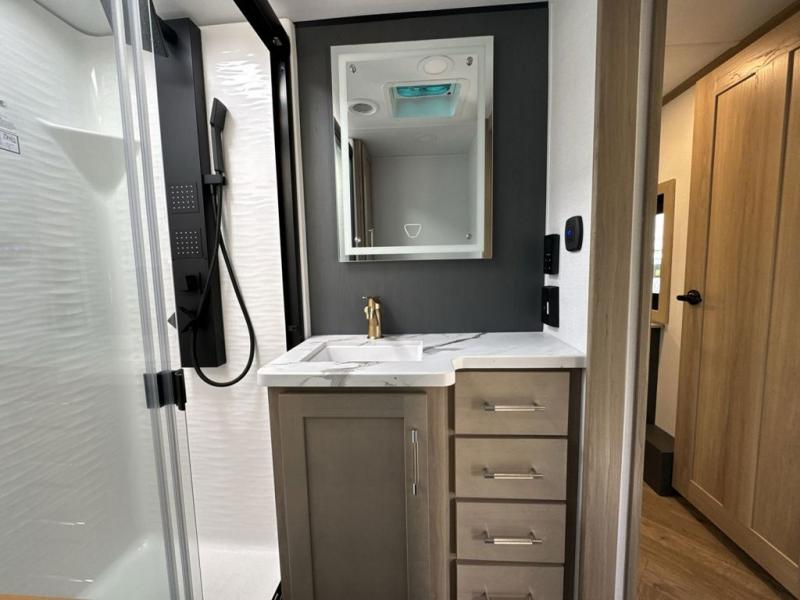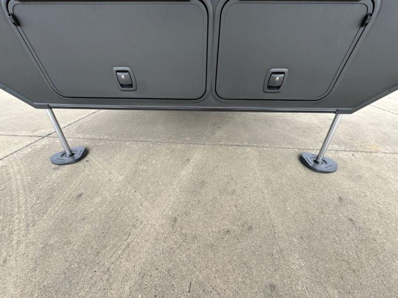 The whole family will love camping in this fifth wheel toy hauler! The front private bedroom has a king bed slide for more interior space, a Smart LED TV, a front large wardrobe, plus washer and dryer prep. Freshen up each morning in the full bathroom with the fiberglass one-piece shower then head to the kitchen to fry up some eggs on the four-burner range and bake some cinnamon rolls in the 24" stainless steel oven. Grab a cold cup of orange juice from the 20-cu. ft. 12-volt refrigerator and enjoy it along with the eggs at the dinette table or in the 15' garage on one of the dual opposing sofas with cupholders. The L-shaped hide-a-bed sofa is conveniently across from the entertainment center with a 50" Smart LED TV and fireplace. As you head into the 15' garage area, you will notice a loft with a twin bed, a queen bed above the opposing sofas, Adjust-A-Track frame welded tie downs, and one of the dual entry doors to the unit!