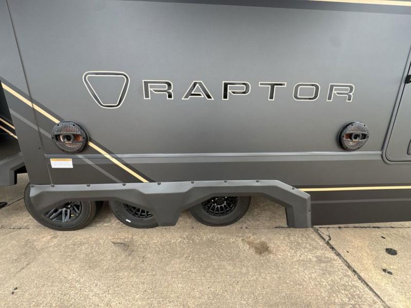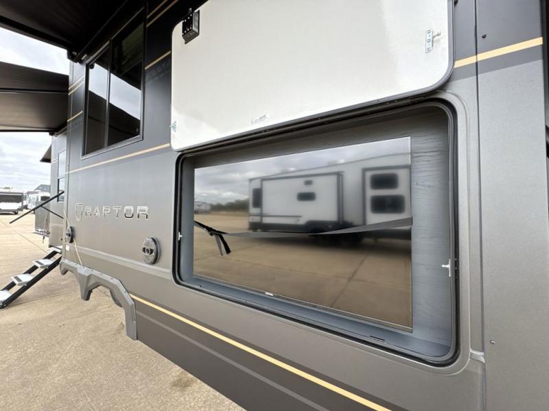 Experience a breath of fresh air with one of these Keystone RV Raptor fifth wheel toy haulers! Their rugged construction consists of a one-piece Alpha Super Flex TPO roof membrane, Dyna Span floor decking, and 5,000 lb. frame-welded tie- downs to keep your toys in place as you travel. Some unexpected conveniences you will appreciate include an Omni-Chill A/C system to keep you cool on those hot summer days, a Furrion backup camera, MaxTurn™ technology with a Helux™ pin box, and a Generation 3 iN-Command smart automation system with Global Connect to make life easier. There is also designer style vinyl flooring throughout, along with new ceiling treatment with LED accent lighting, beach wood and white cabinetry, and many more interior comforts!