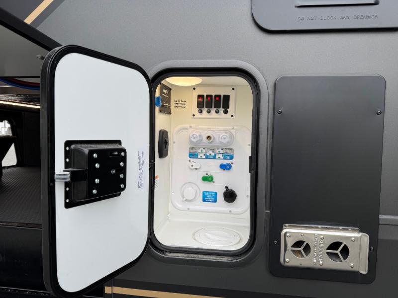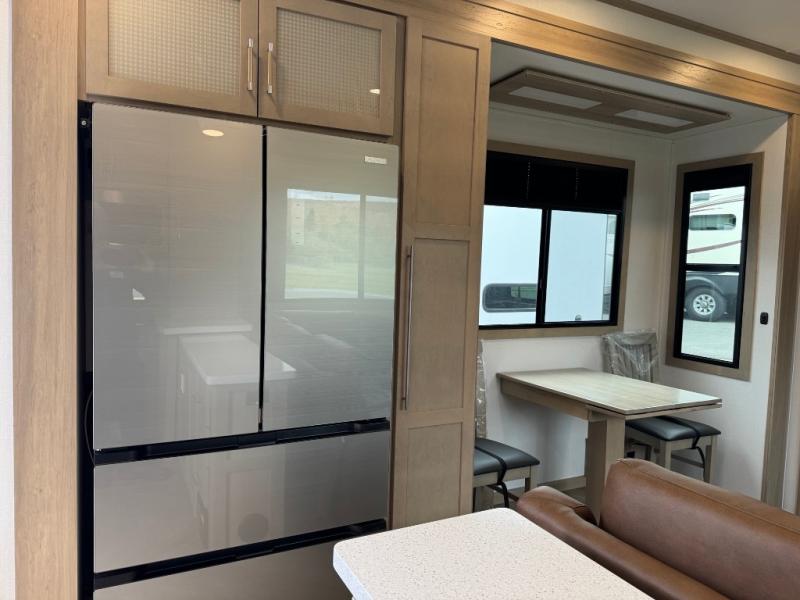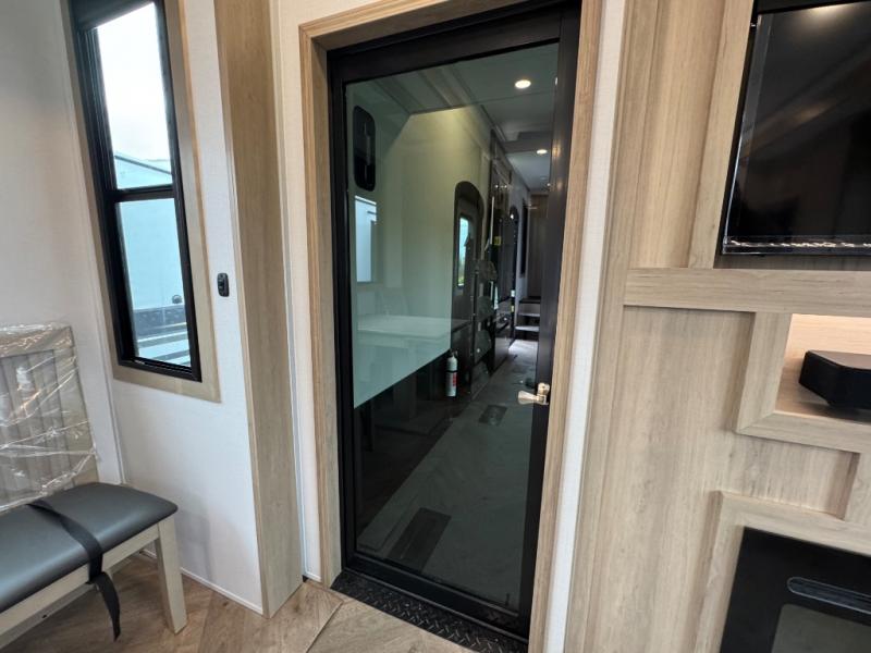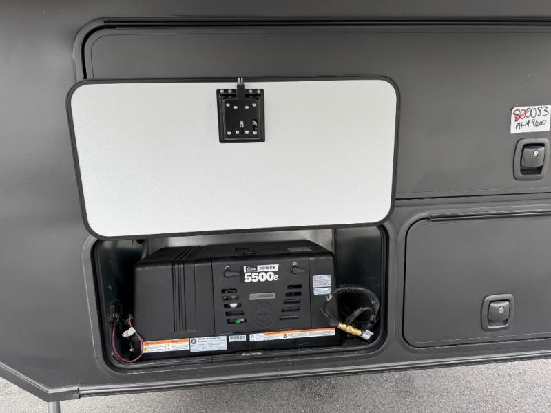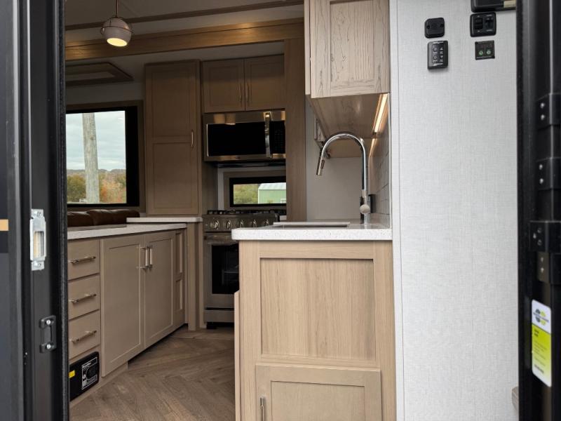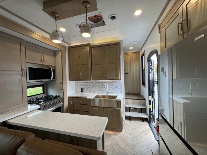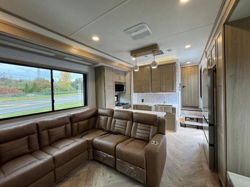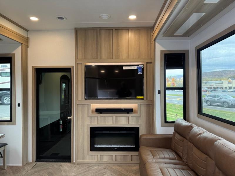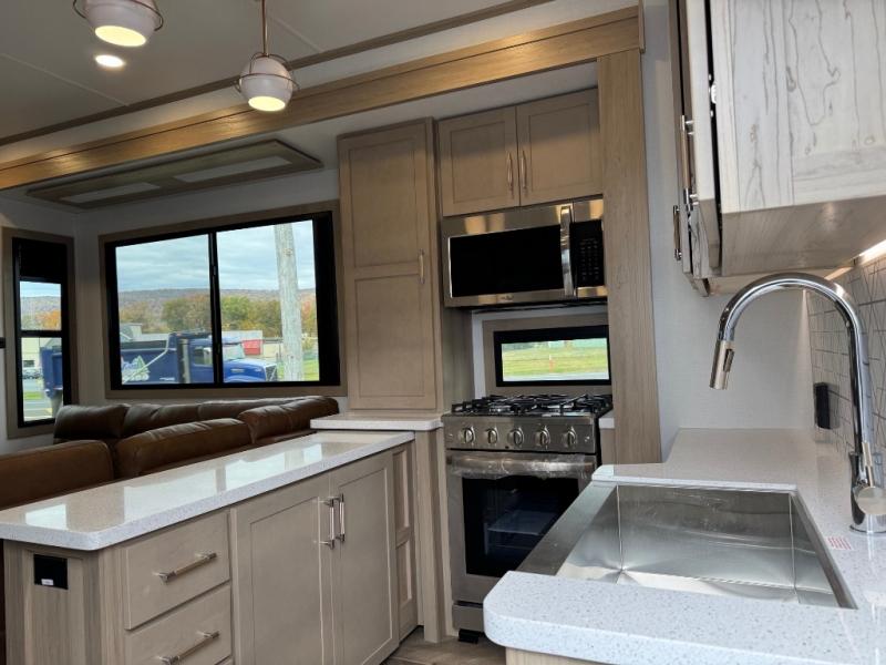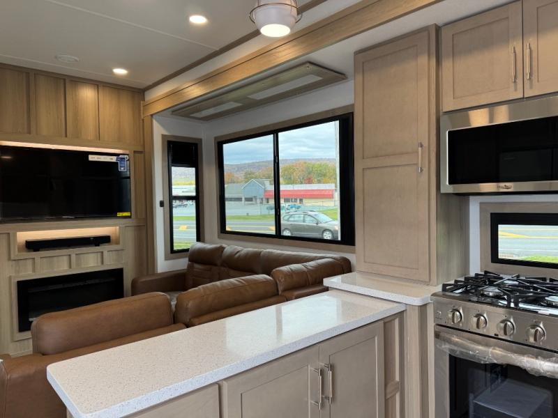 The whole family will love camping in this fifth wheel toy hauler! The front private bedroom has a king bed slide for more interior space, a Smart LED TV, a front large wardrobe, plus washer and dryer prep. Freshen up each morning in the full bathroom with the fiberglass one-piece shower then head to the kitchen to fry up some eggs on the four-burner range and bake some cinnamon rolls in the 24" stainless steel oven. Grab a cold cup of orange juice from the 20-cu. ft. 12-volt refrigerator and enjoy it along with the eggs at the dinette table or in the 15' garage on one of the dual opposing sofas with cupholders. The L-shaped hide-a-bed sofa is conveniently across from the entertainment center with a 50" Smart LED TV and fireplace. As you head into the 15' garage area, you will notice a loft with a twin bed, a queen bed above the opposing sofas, Adjust-A-Track frame welded tie downs, and one of the dual entry doors to the unit!