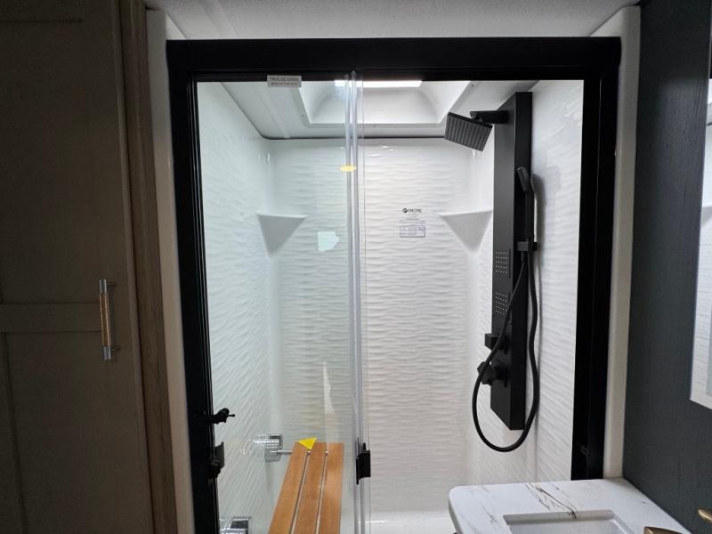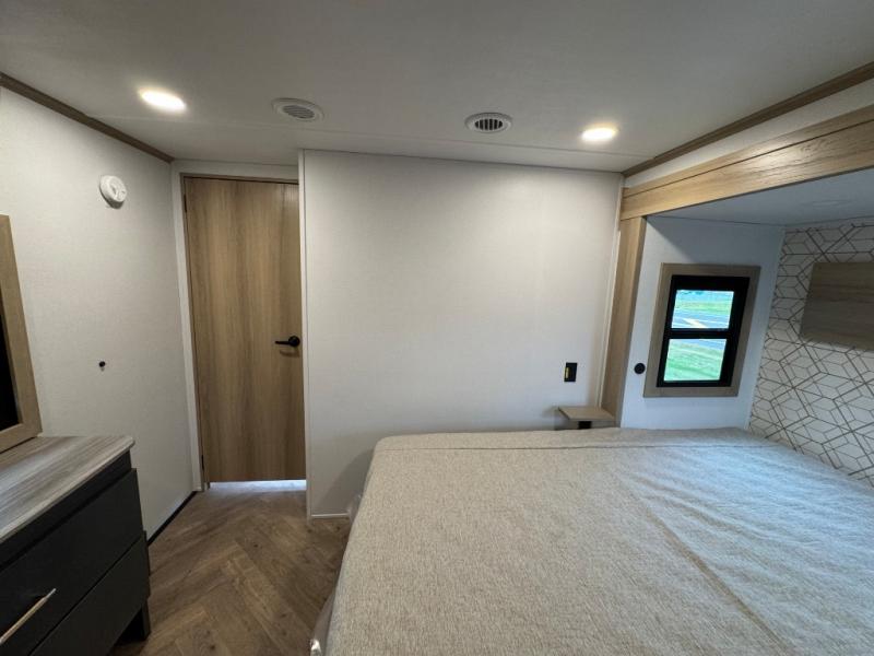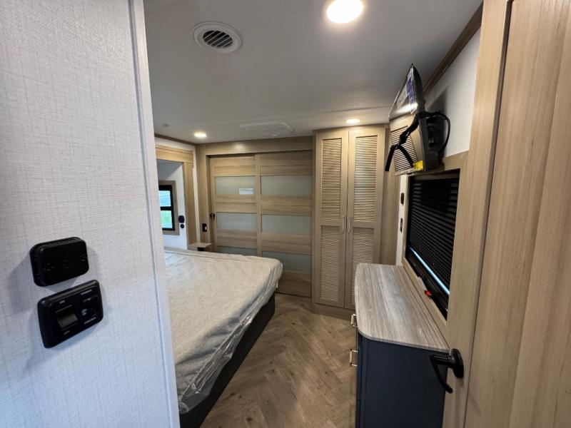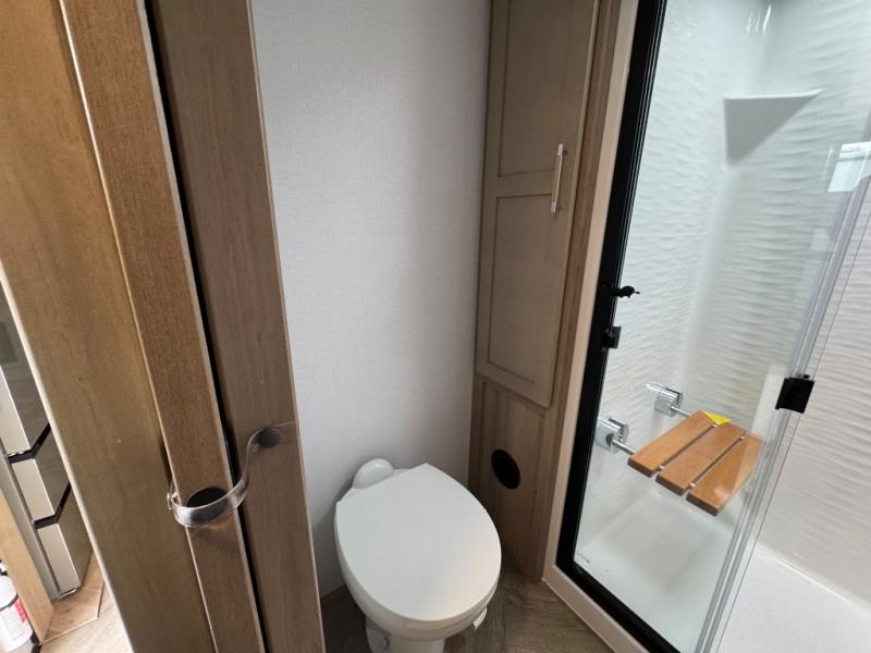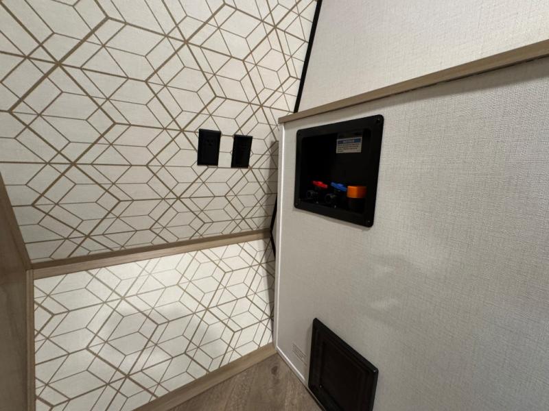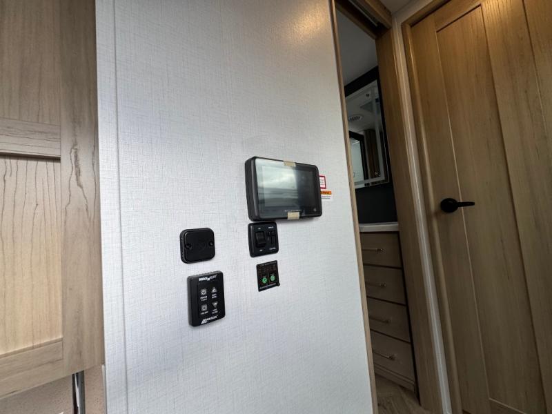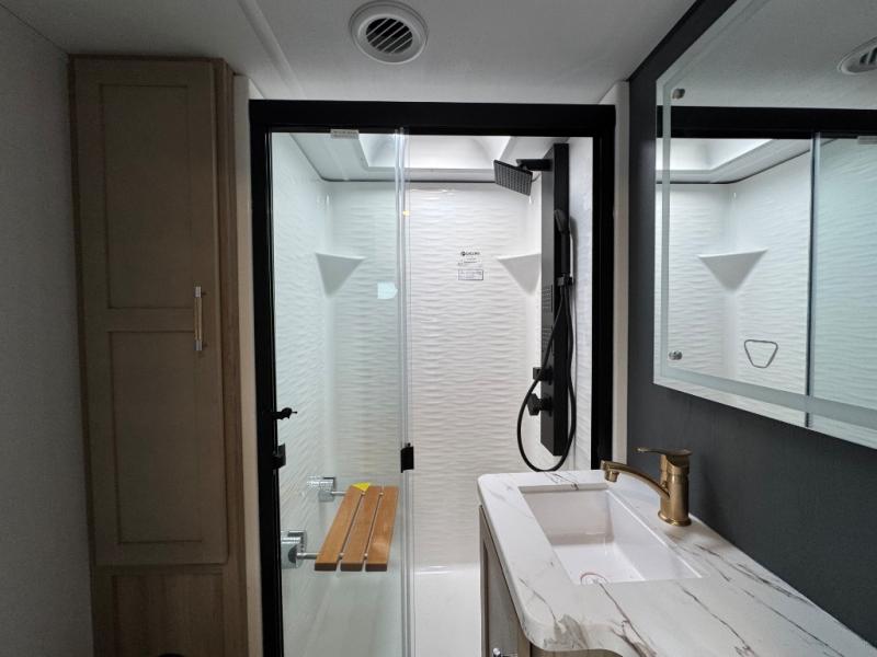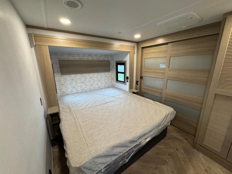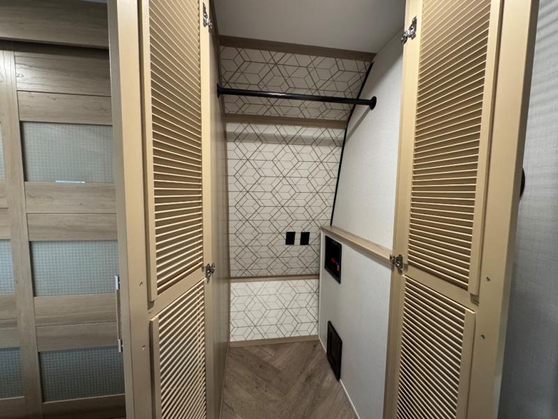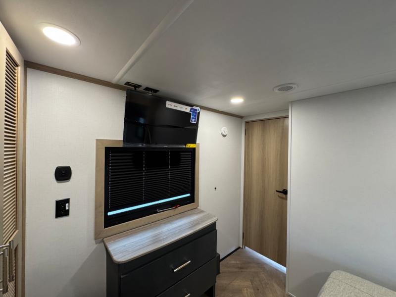 The whole family will love camping in this fifth wheel toy hauler! The front private bedroom has a king bed slide for more interior space, a Smart LED TV, a front large wardrobe, plus washer and dryer prep. Freshen up each morning in the full bathroom with the fiberglass one-piece shower then head to the kitchen to fry up some eggs on the four-burner range and bake some cinnamon rolls in the 24" stainless steel oven. Grab a cold cup of orange juice from the 20-cu. ft. 12-volt refrigerator and enjoy it along with the eggs at the dinette table or in the 15' garage on one of the dual opposing sofas with cupholders. The L-shaped hide-a-bed sofa is conveniently across from the entertainment center with a 50" Smart LED TV and fireplace. As you head into the 15' garage area, you will notice a loft with a twin bed, a queen bed above the opposing sofas, Adjust-A-Track frame welded tie downs, and one of the dual entry doors to the unit!