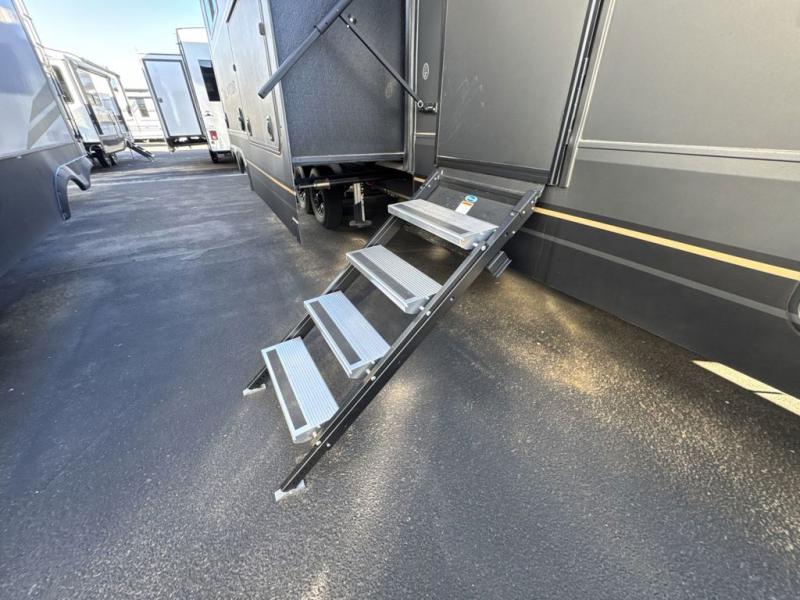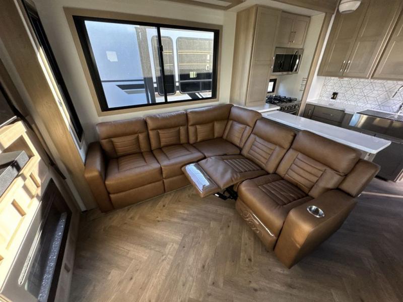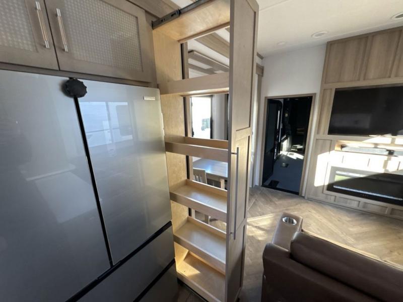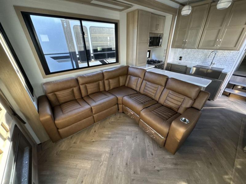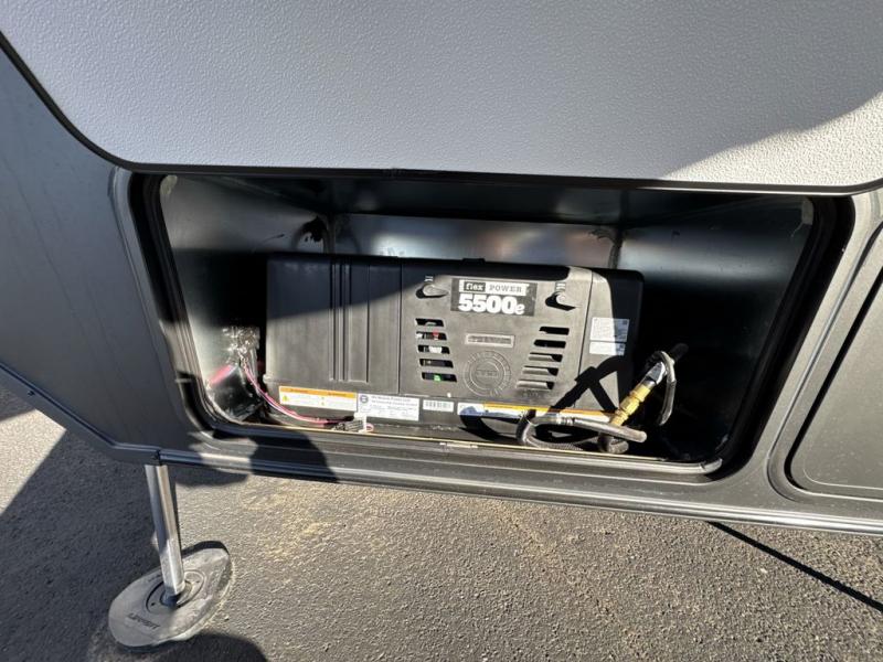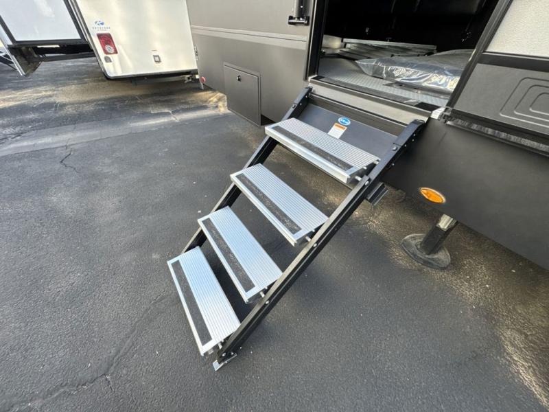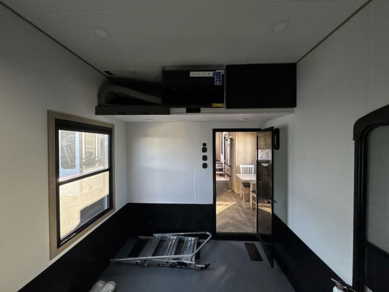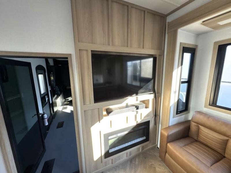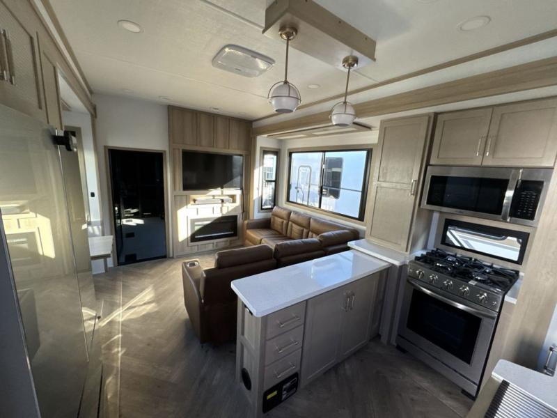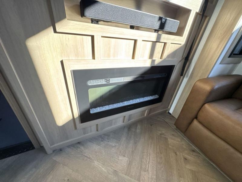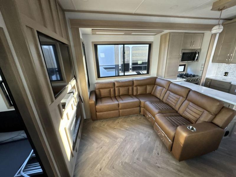 The whole family will love camping in this fifth wheel toy hauler! The front private bedroom has a king bed slide for more interior space, a Smart LED TV, a front large wardrobe, plus washer and dryer prep. Freshen up each morning in the full bathroom with the fiberglass one-piece shower then head to the kitchen to fry up some eggs on the four-burner range and bake some cinnamon rolls in the 24" stainless steel oven. Grab a cold cup of orange juice from the 20-cu. ft. 12-volt refrigerator and enjoy it along with the eggs at the dinette table or in the 15' garage on one of the dual opposing sofas with cupholders. The L-shaped hide-a-bed sofa is conveniently across from the entertainment center with a 50" Smart LED TV and fireplace. As you head into the 15' garage area, you will notice a loft with a twin bed, a queen bed above the opposing sofas, Adjust-A-Track frame welded tie downs, and one of the dual entry doors to the unit!