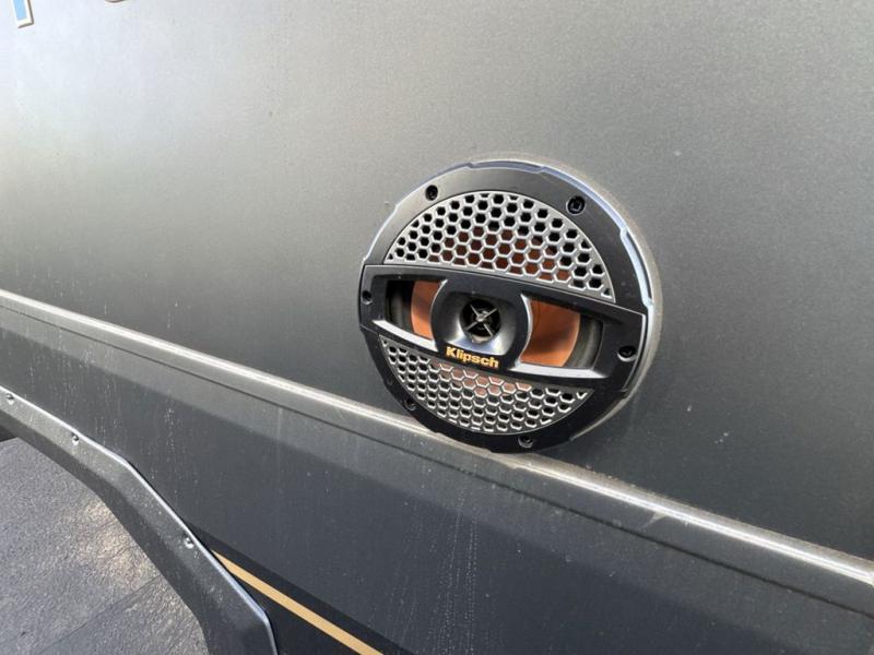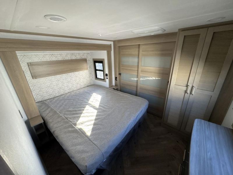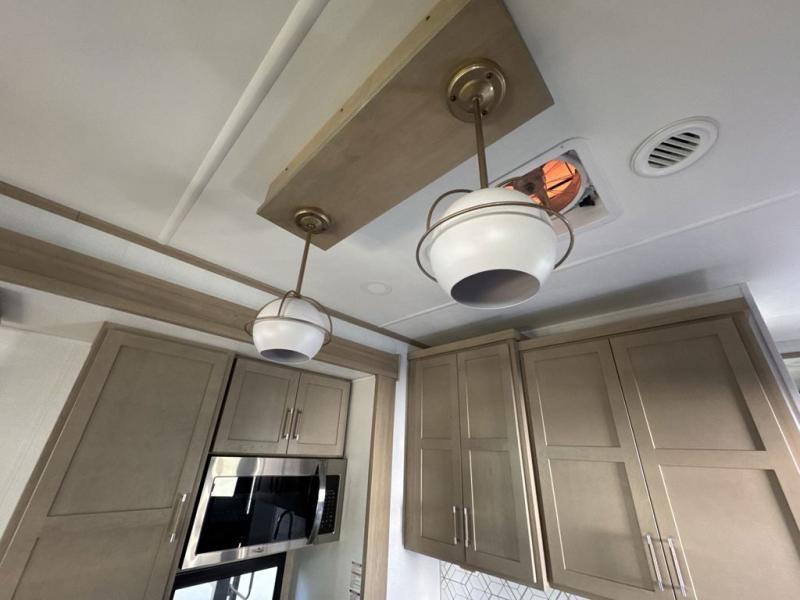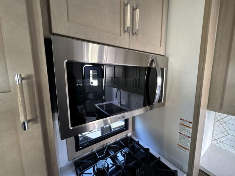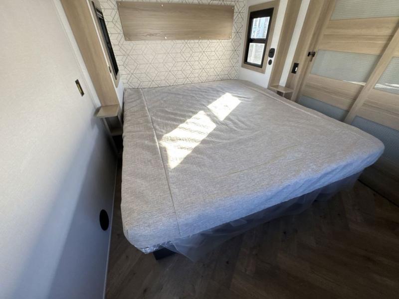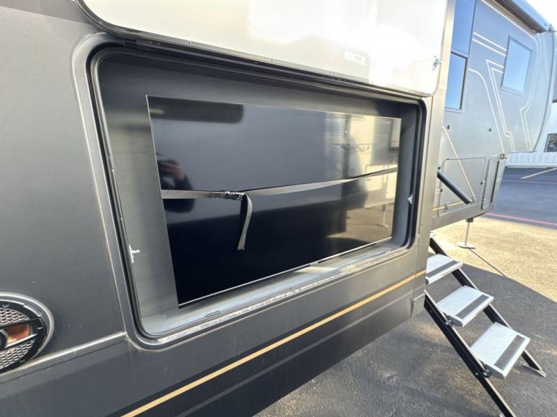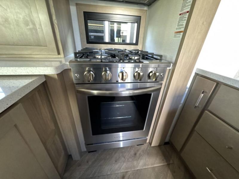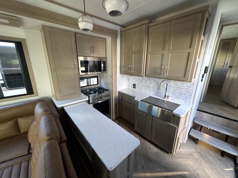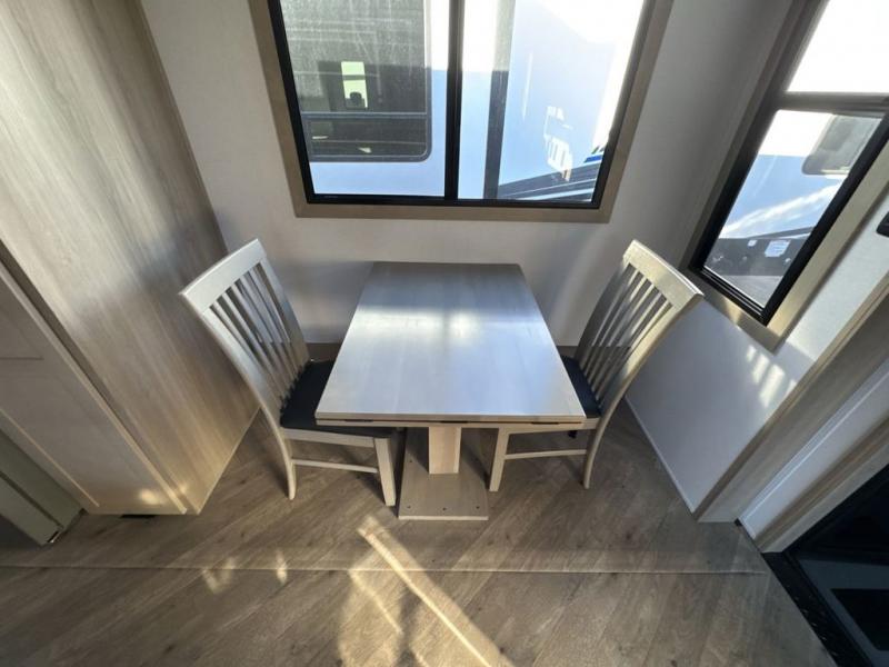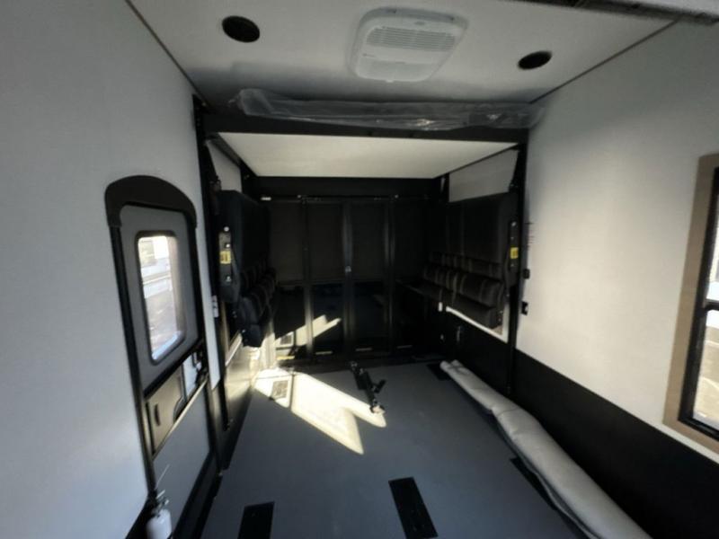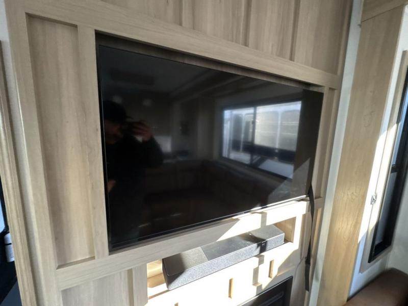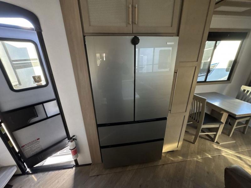 The whole family will love camping in this fifth wheel toy hauler! The front private bedroom has a king bed slide for more interior space, a Smart LED TV, a front large wardrobe, plus washer and dryer prep. Freshen up each morning in the full bathroom with the fiberglass one-piece shower then head to the kitchen to fry up some eggs on the four-burner range and bake some cinnamon rolls in the 24" stainless steel oven. Grab a cold cup of orange juice from the 20-cu. ft. 12-volt refrigerator and enjoy it along with the eggs at the dinette table or in the 15' garage on one of the dual opposing sofas with cupholders. The L-shaped hide-a-bed sofa is conveniently across from the entertainment center with a 50" Smart LED TV and fireplace. As you head into the 15' garage area, you will notice a loft with a twin bed, a queen bed above the opposing sofas, Adjust-A-Track frame welded tie downs, and one of the dual entry doors to the unit!