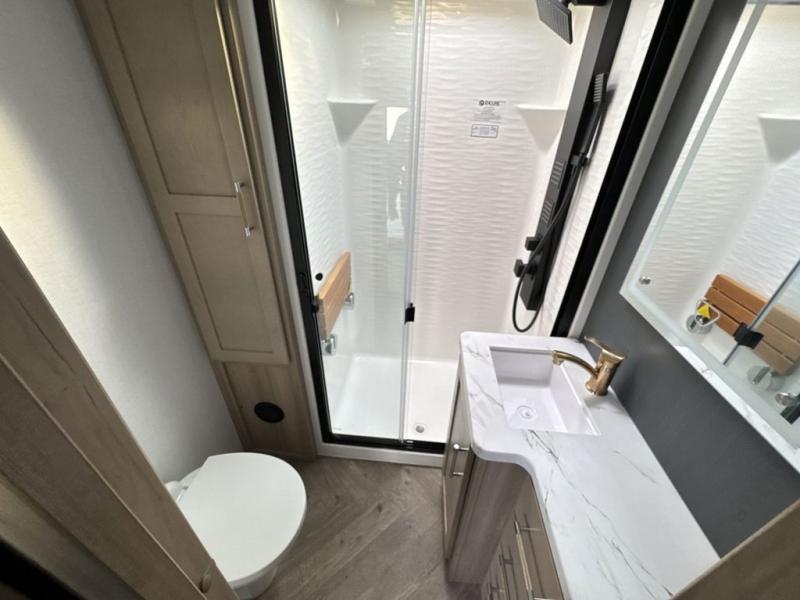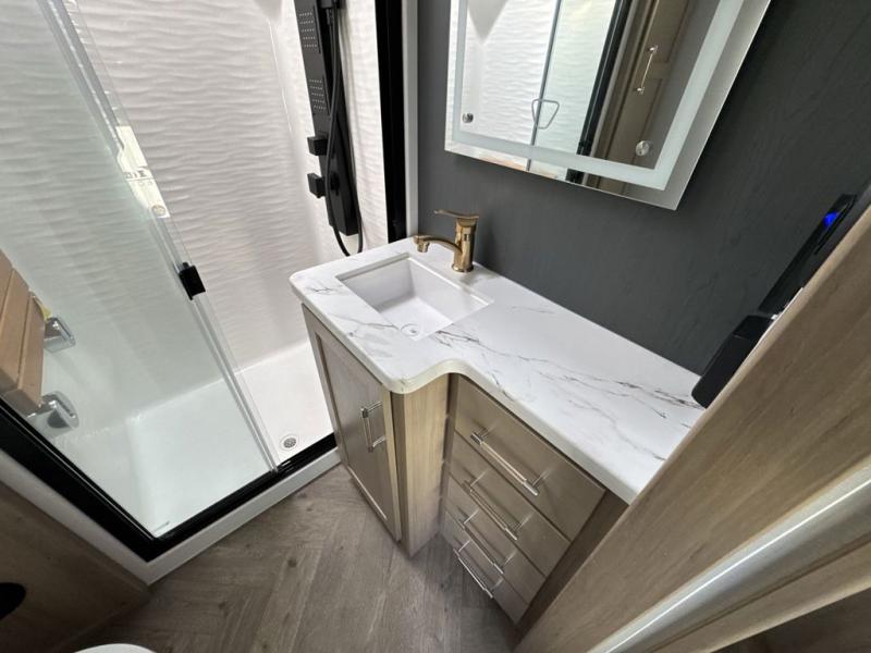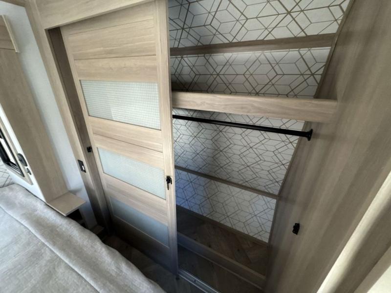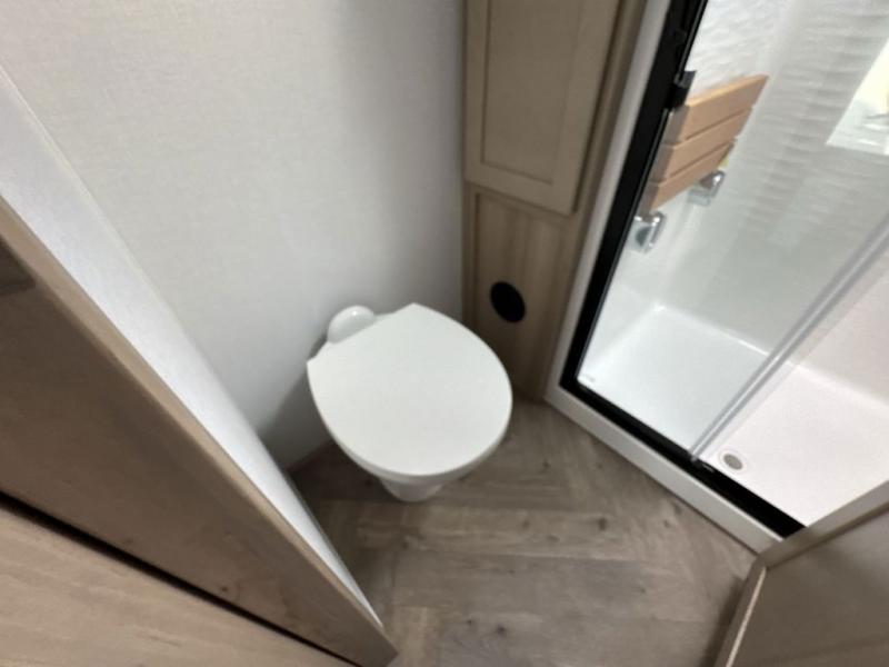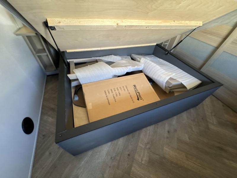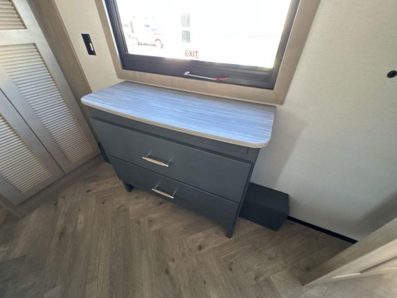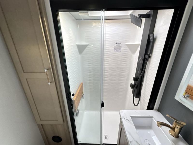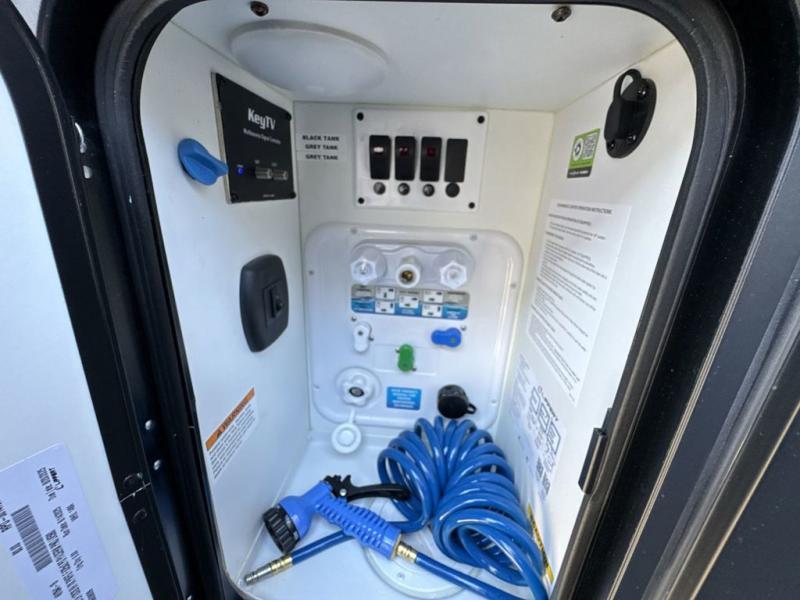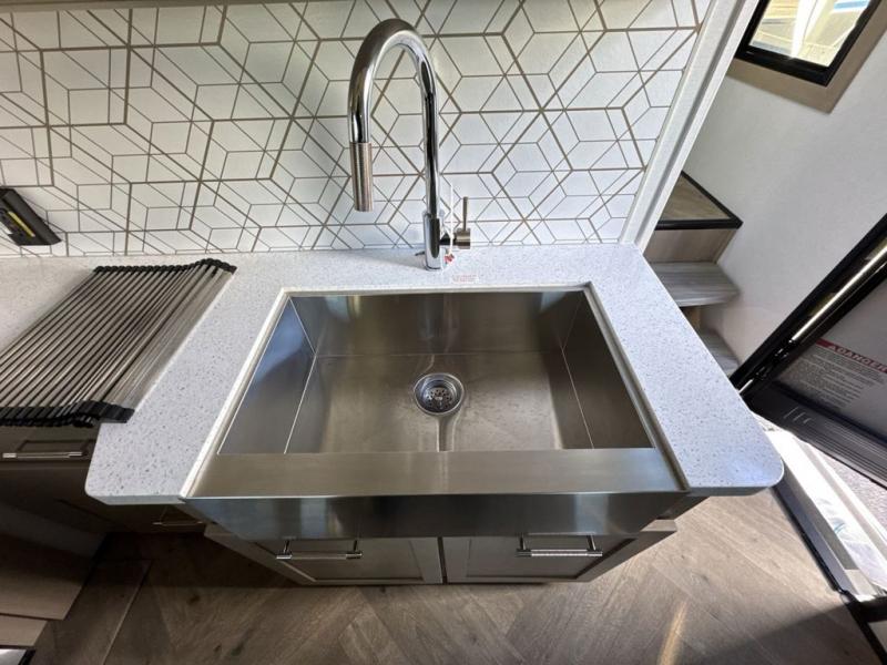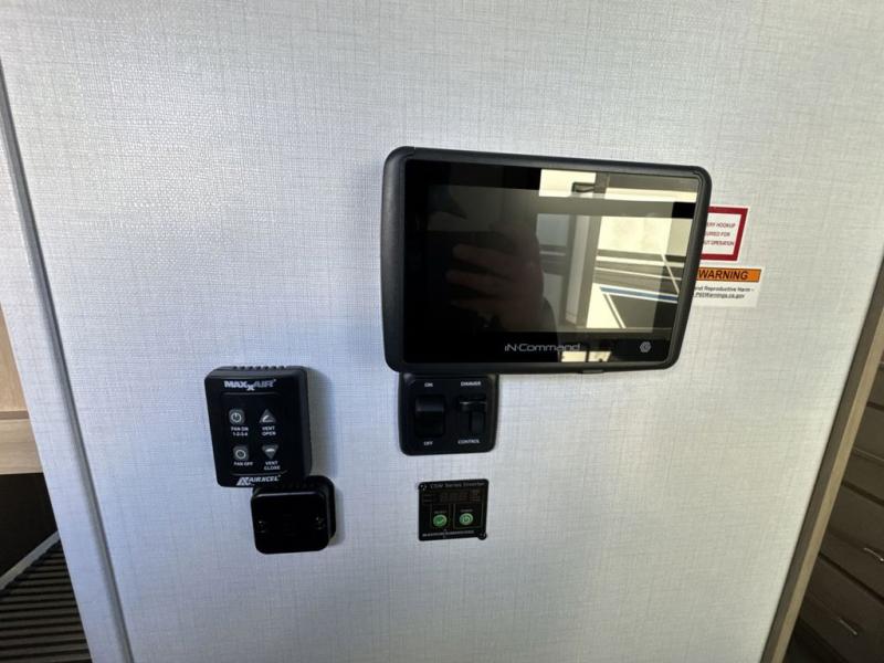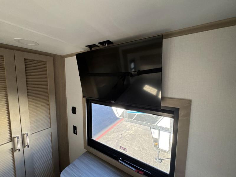 The whole family will love camping in this fifth wheel toy hauler! The front private bedroom has a king bed slide for more interior space, a Smart LED TV, a front large wardrobe, plus washer and dryer prep. Freshen up each morning in the full bathroom with the fiberglass one-piece shower then head to the kitchen to fry up some eggs on the four-burner range and bake some cinnamon rolls in the 24" stainless steel oven. Grab a cold cup of orange juice from the 20-cu. ft. 12-volt refrigerator and enjoy it along with the eggs at the dinette table or in the 15' garage on one of the dual opposing sofas with cupholders. The L-shaped hide-a-bed sofa is conveniently across from the entertainment center with a 50" Smart LED TV and fireplace. As you head into the 15' garage area, you will notice a loft with a twin bed, a queen bed above the opposing sofas, Adjust-A-Track frame welded tie downs, and one of the dual entry doors to the unit!