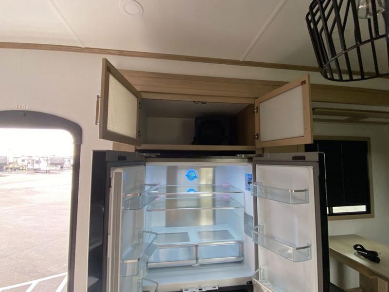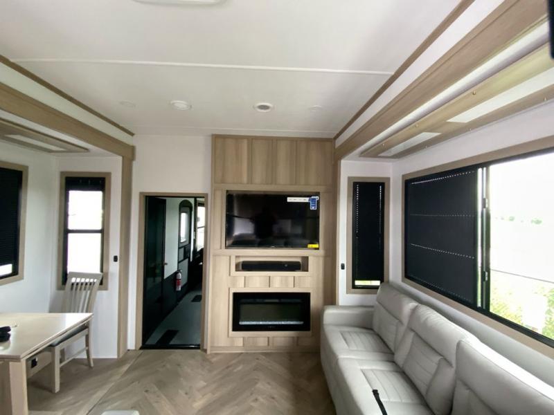 The whole family will love camping in this fifth wheel toy hauler! The front private bedroom has a king bed slide for more interior space, a Smart LED TV, a front large wardrobe, plus washer and dryer prep. Freshen up each morning in the full bathroom with the fiberglass one-piece shower then head to the kitchen to fry up some eggs on the four-burner range and bake some cinnamon rolls in the 24" stainless steel oven. Grab a cold cup of orange juice from the 20-cu. ft. 12-volt refrigerator and enjoy it along with the eggs at the dinette table or in the 15' garage on one of the dual opposing sofas with cupholders. The L-shaped hide-a-bed sofa is conveniently across from the entertainment center with a 50" Smart LED TV and fireplace. As you head into the 15' garage area, you will notice a loft with a twin bed, a queen bed above the opposing sofas, Adjust-A-Track frame welded tie downs, and one of the dual entry doors to the unit!
