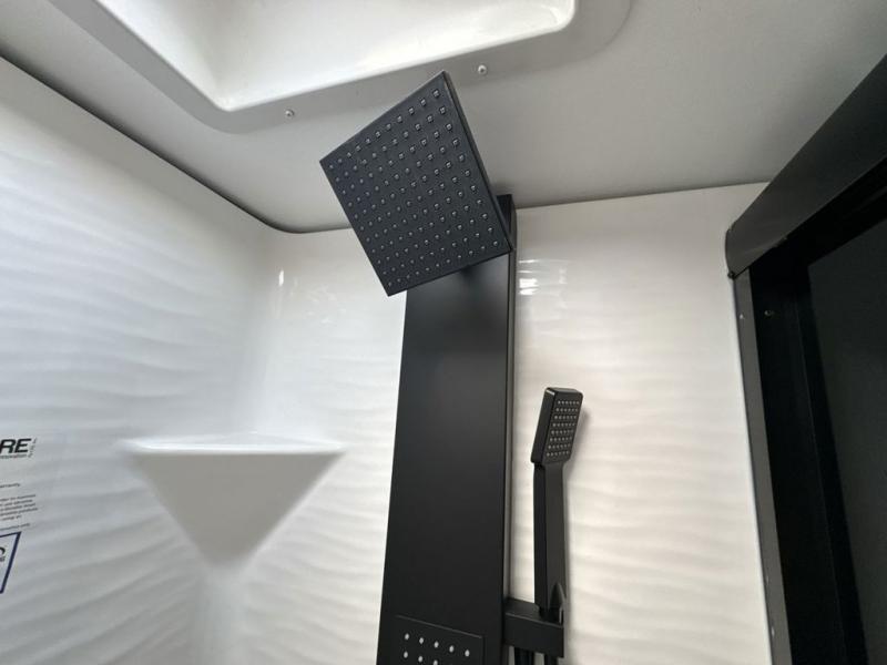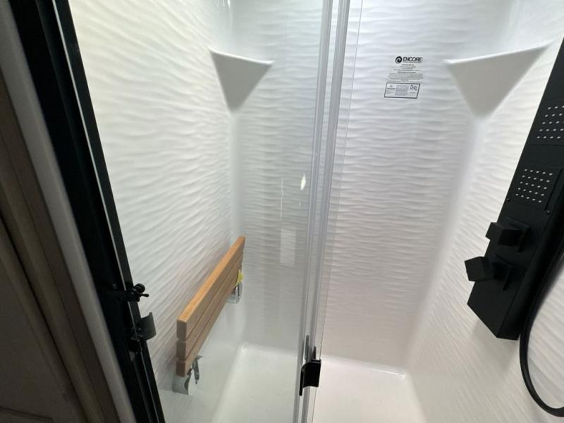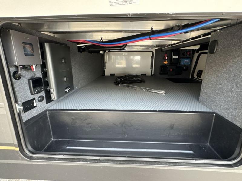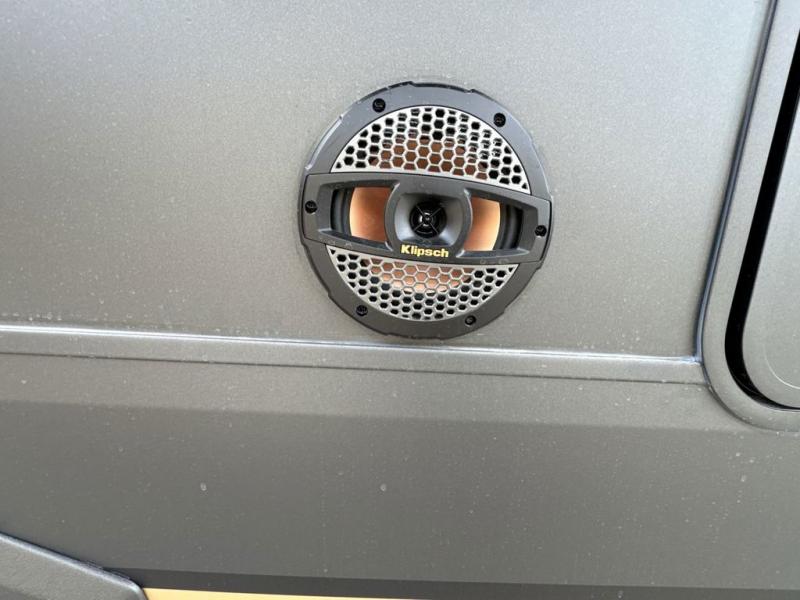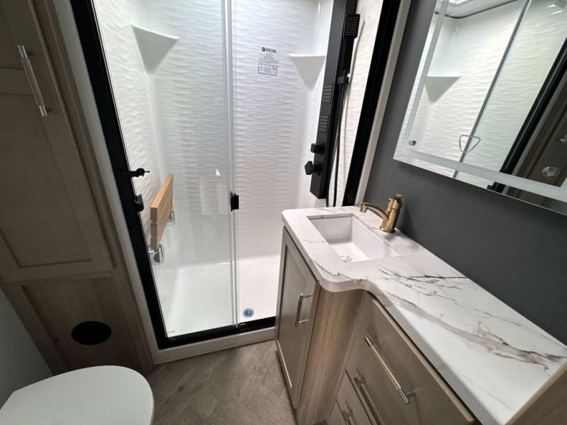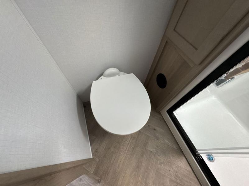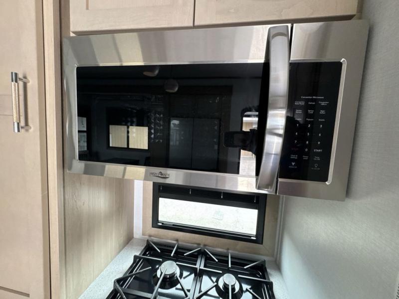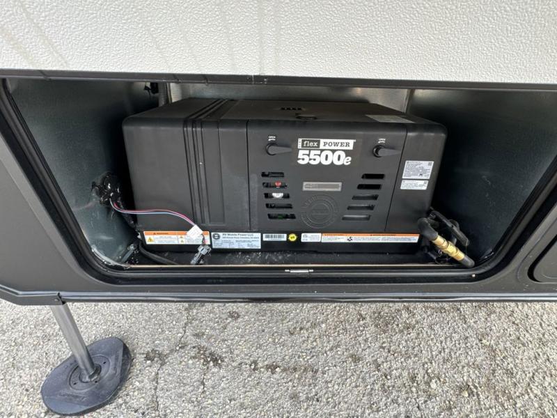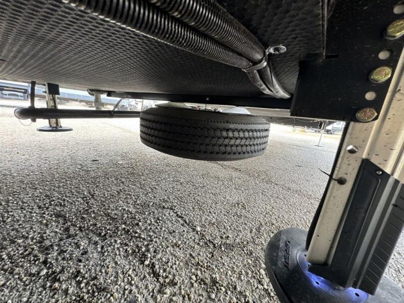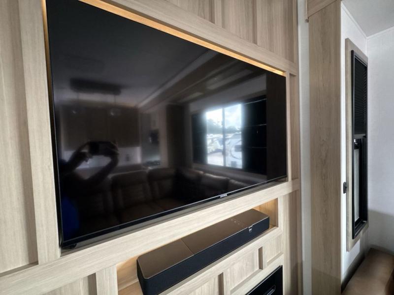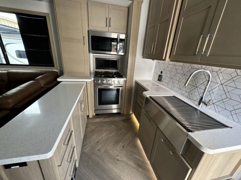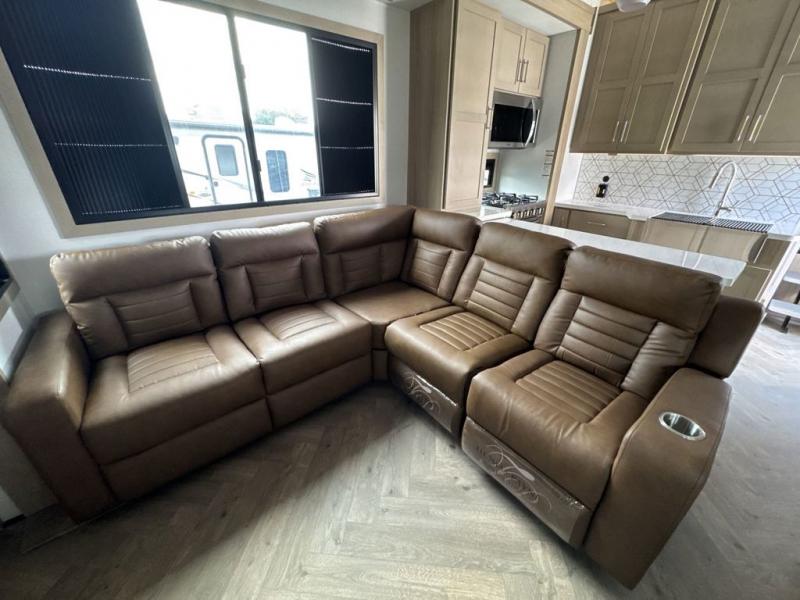 The whole family will love camping in this fifth wheel toy hauler! The front private bedroom has a king bed slide for more interior space, a Smart LED TV, a front large wardrobe, plus washer and dryer prep. Freshen up each morning in the full bathroom with the fiberglass one-piece shower then head to the kitchen to fry up some eggs on the four-burner range and bake some cinnamon rolls in the 24" stainless steel oven. Grab a cold cup of orange juice from the 20-cu. ft. 12-volt refrigerator and enjoy it along with the eggs at the dinette table or in the 15' garage on one of the dual opposing sofas with cupholders. The L-shaped hide-a-bed sofa is conveniently across from the entertainment center with a 50" Smart LED TV and fireplace. As you head into the 15' garage area, you will notice a loft with a twin bed, a queen bed above the opposing sofas, Adjust-A-Track frame welded tie downs, and one of the dual entry doors to the unit!