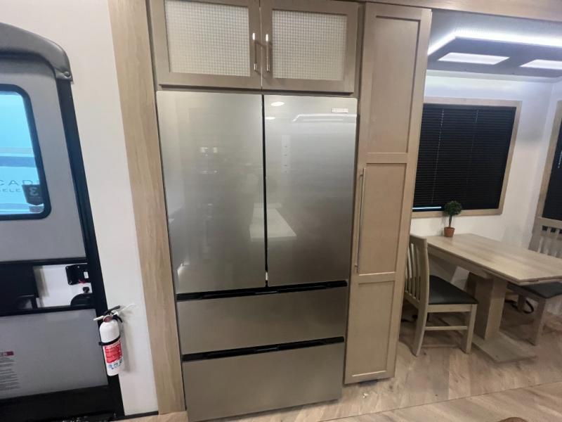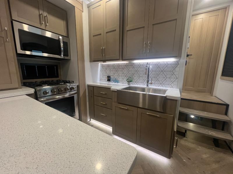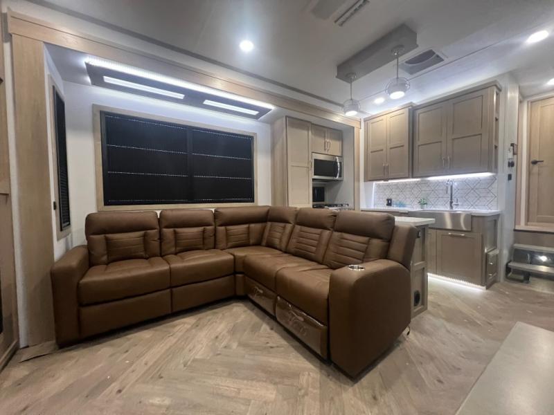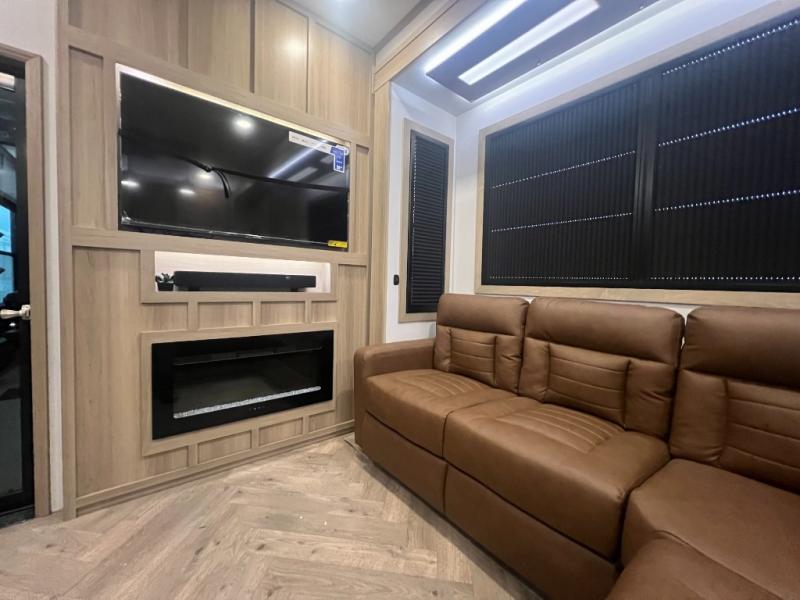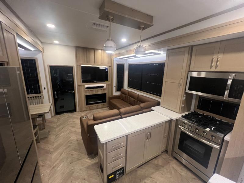 The whole family will love camping in this fifth wheel toy hauler! The front private bedroom has a king bed slide for more interior space, a Smart LED TV, a front large wardrobe, plus washer and dryer prep. Freshen up each morning in the full bathroom with the fiberglass one-piece shower then head to the kitchen to fry up some eggs on the four-burner range and bake some cinnamon rolls in the 24" stainless steel oven. Grab a cold cup of orange juice from the 20-cu. ft. 12-volt refrigerator and enjoy it along with the eggs at the dinette table or in the 15' garage on one of the dual opposing sofas with cupholders. The L-shaped hide-a-bed sofa is conveniently across from the entertainment center with a 50" Smart LED TV and fireplace. As you head into the 15' garage area, you will notice a loft with a twin bed, a queen bed above the opposing sofas, Adjust-A-Track frame welded tie downs, and one of the dual entry doors to the unit!