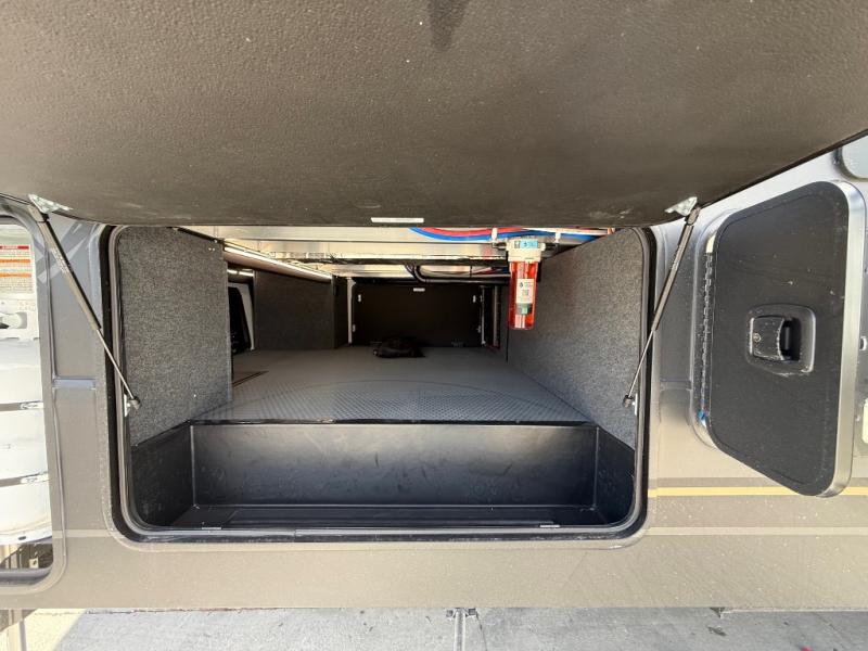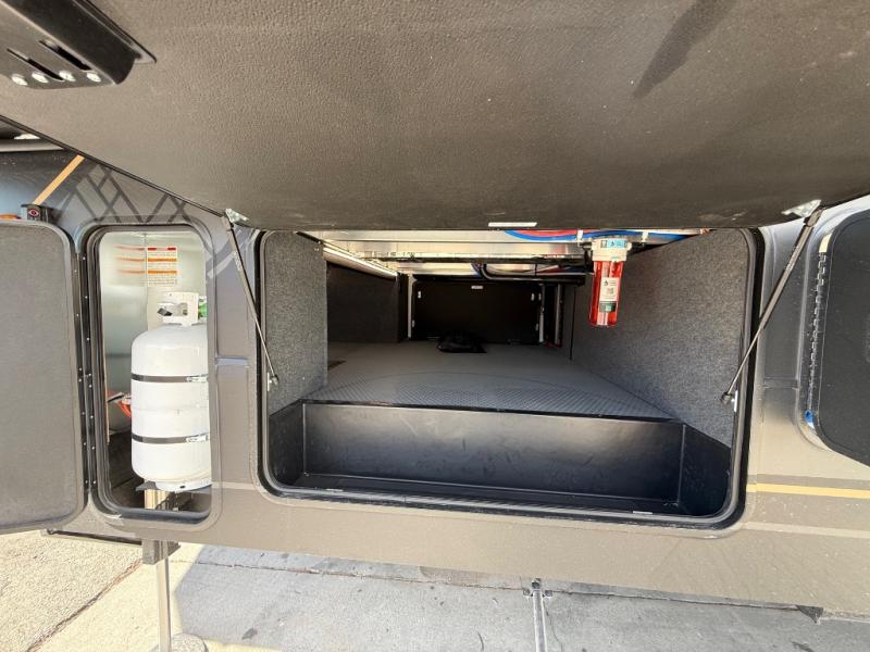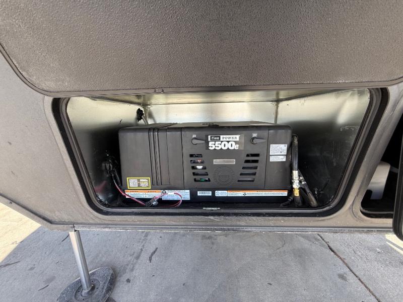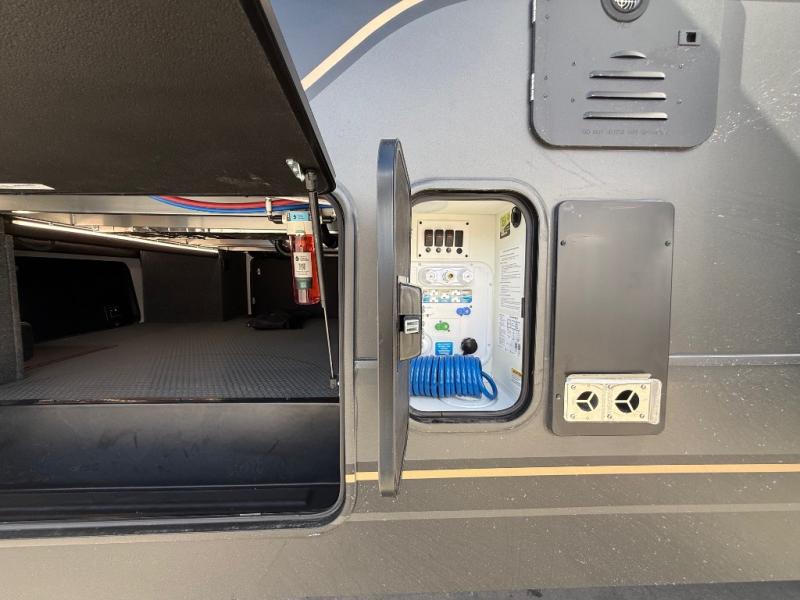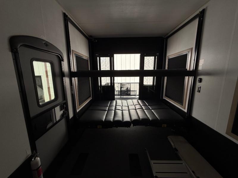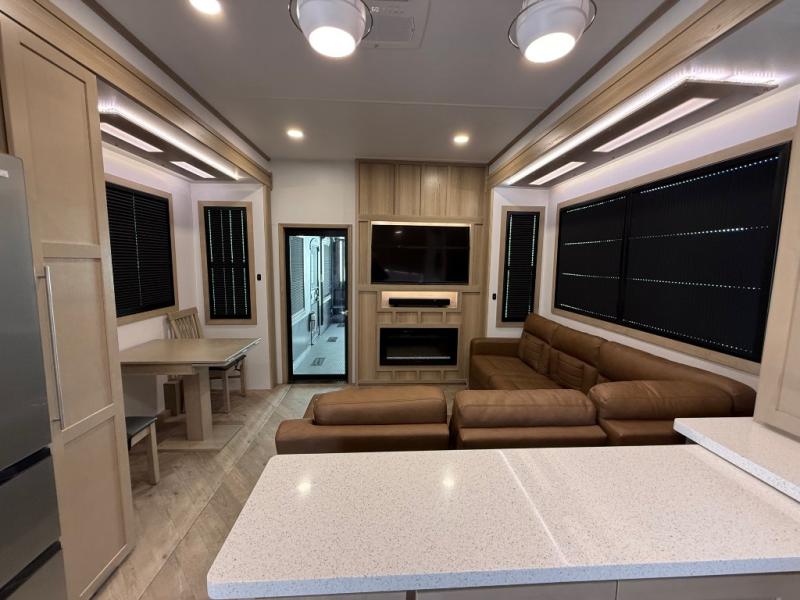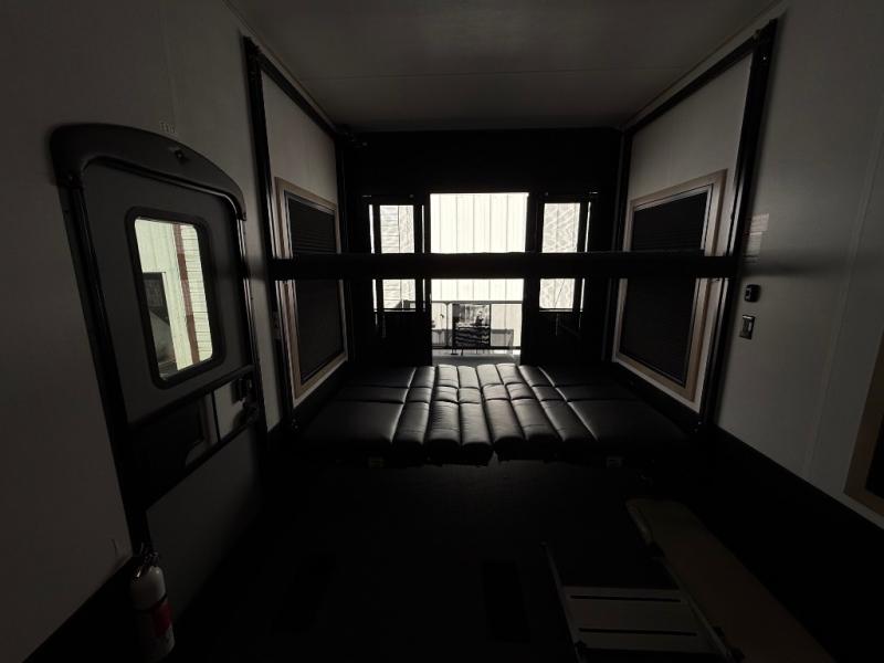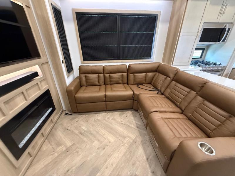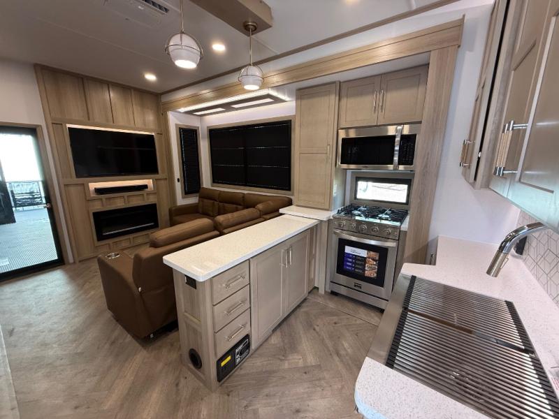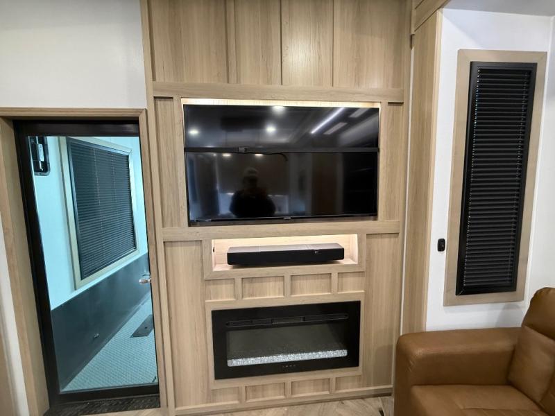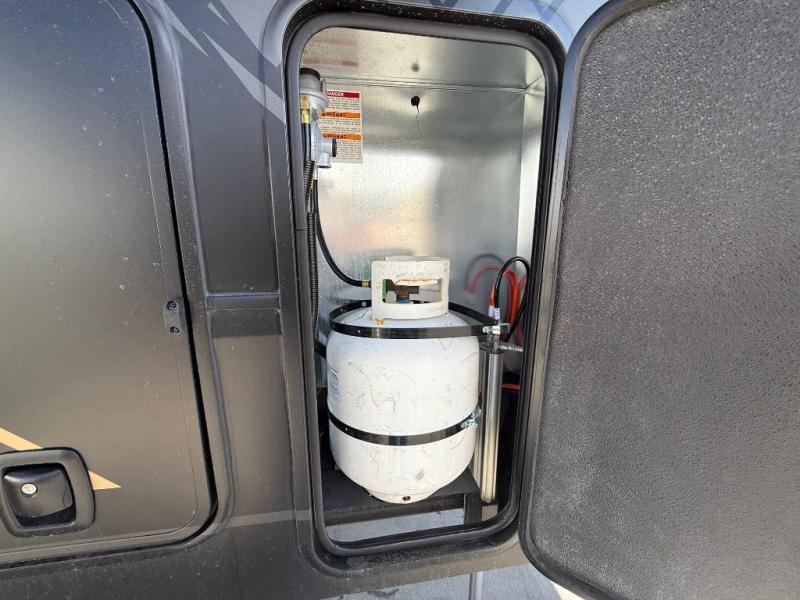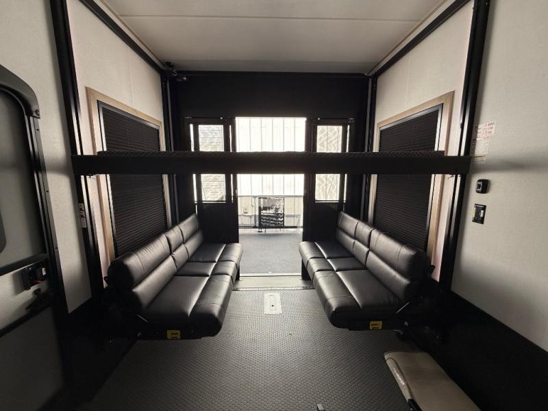 The whole family will love camping in this fifth wheel toy hauler! The front private bedroom has a king bed slide for more interior space, a Smart LED TV, a front large wardrobe, plus washer and dryer prep. Freshen up each morning in the full bathroom with the fiberglass one-piece shower then head to the kitchen to fry up some eggs on the four-burner range and bake some cinnamon rolls in the 24" stainless steel oven. Grab a cold cup of orange juice from the 20-cu. ft. 12-volt refrigerator and enjoy it along with the eggs at the dinette table or in the 15' garage on one of the dual opposing sofas with cupholders. The L-shaped hide-a-bed sofa is conveniently across from the entertainment center with a 50" Smart LED TV and fireplace. As you head into the 15' garage area, you will notice a loft with a twin bed, a queen bed above the opposing sofas, Adjust-A-Track frame welded tie downs, and one of the dual entry doors to the unit!
