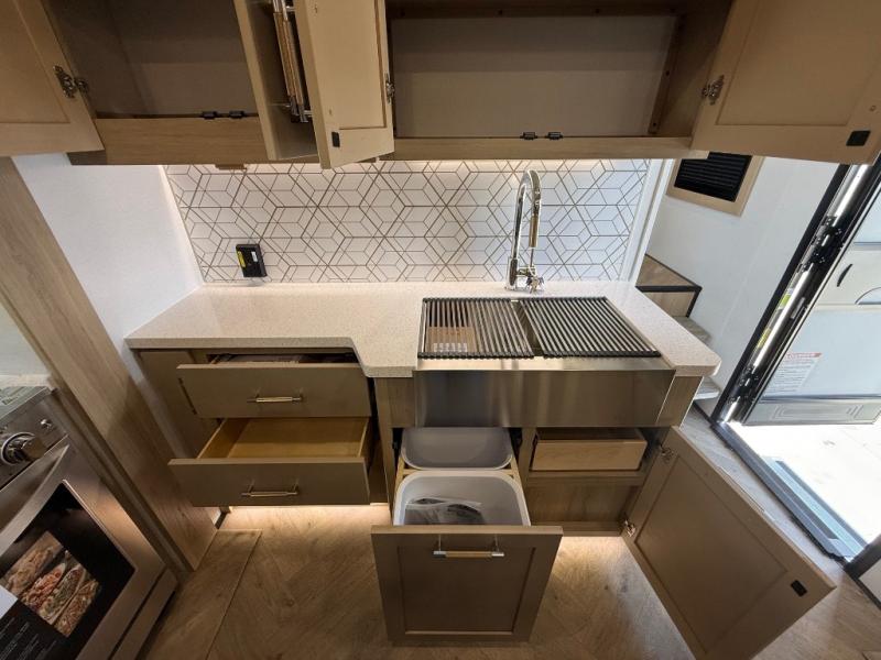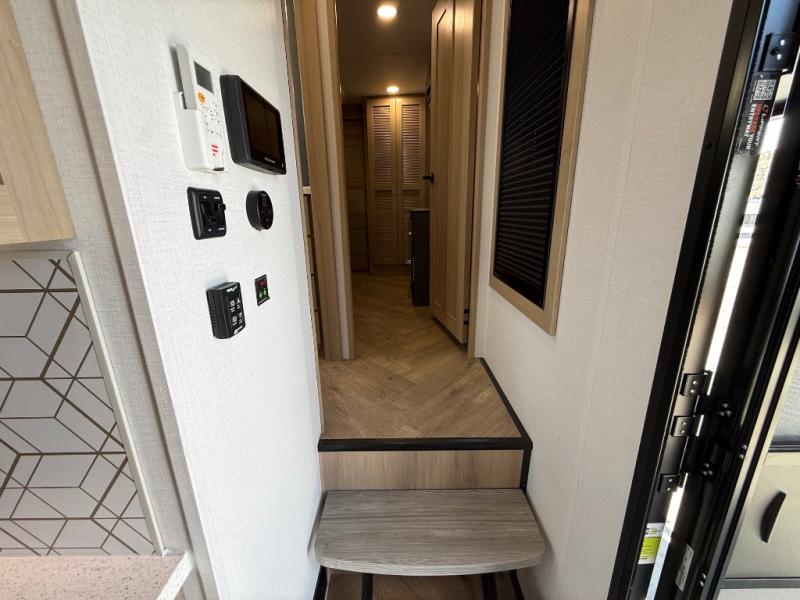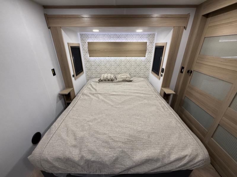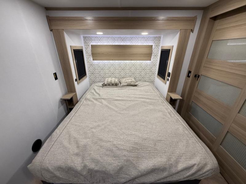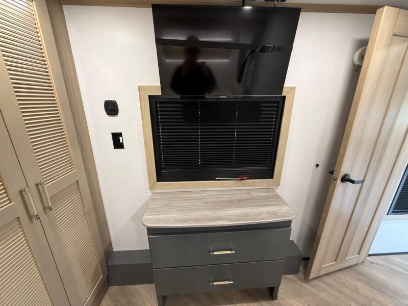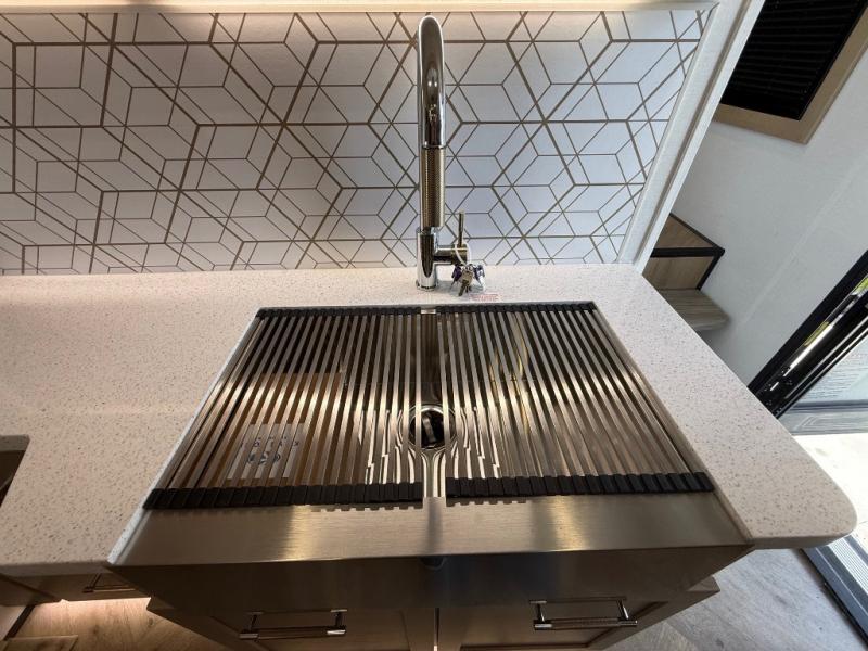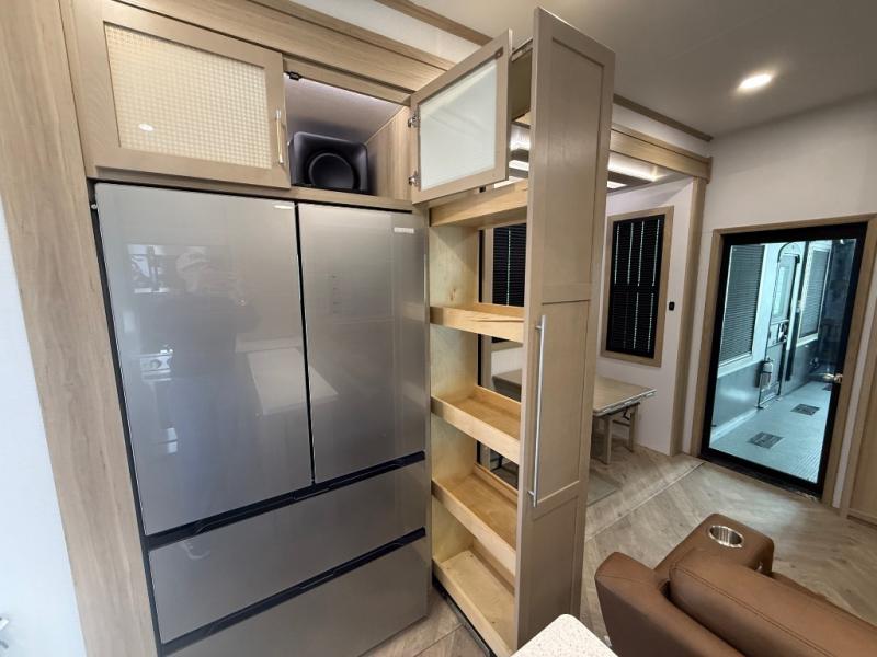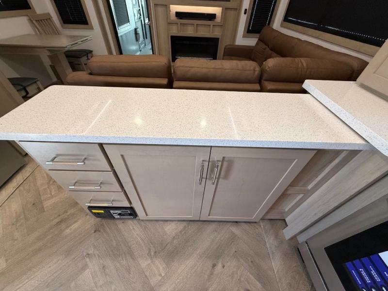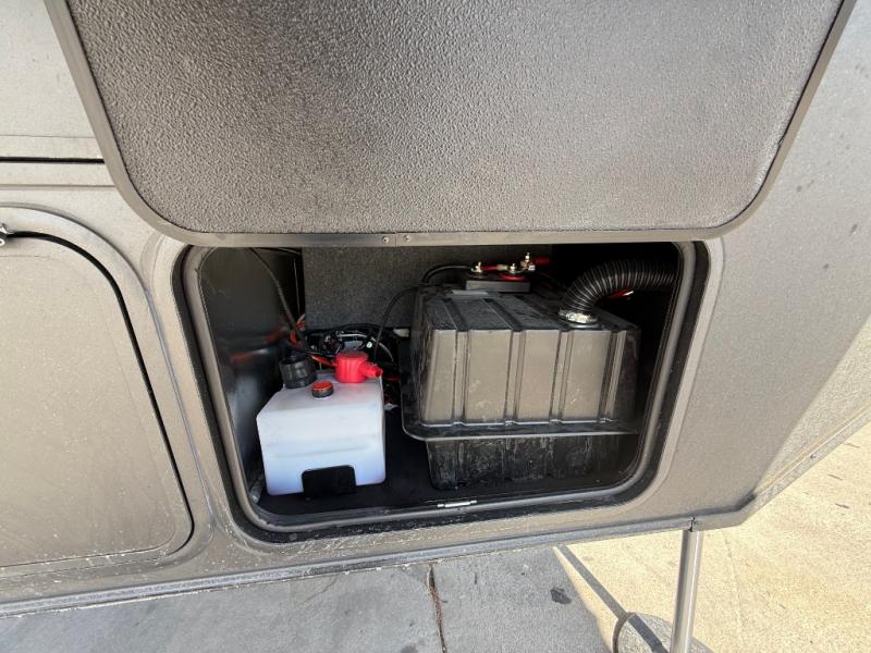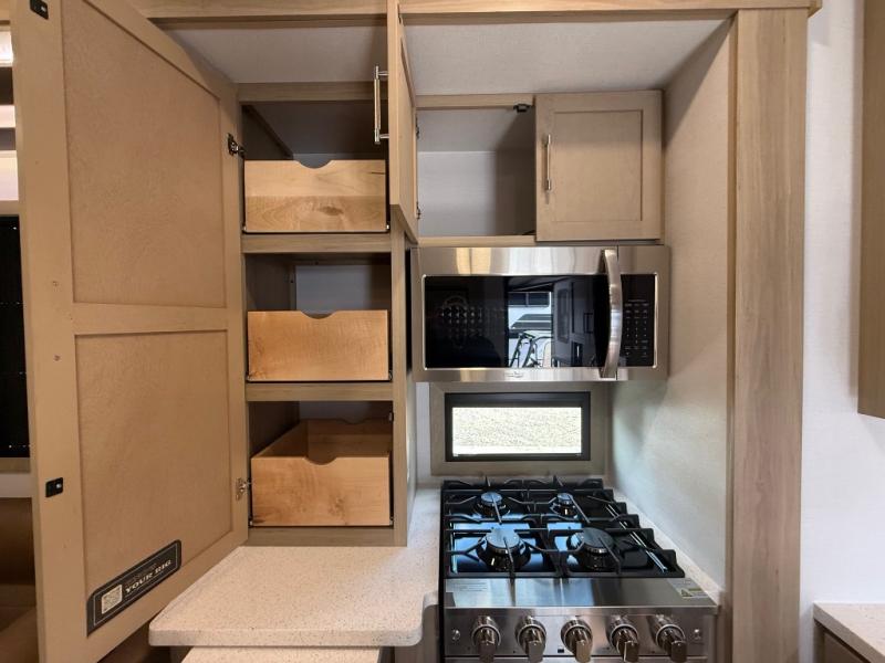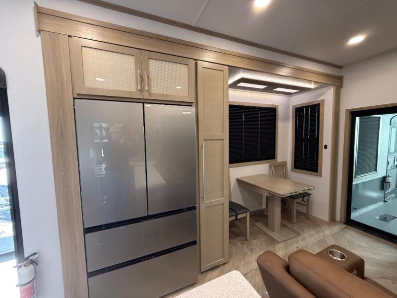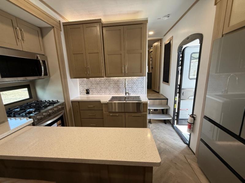 The whole family will love camping in this fifth wheel toy hauler! The front private bedroom has a king bed slide for more interior space, a Smart LED TV, a front large wardrobe, plus washer and dryer prep. Freshen up each morning in the full bathroom with the fiberglass one-piece shower then head to the kitchen to fry up some eggs on the four-burner range and bake some cinnamon rolls in the 24" stainless steel oven. Grab a cold cup of orange juice from the 20-cu. ft. 12-volt refrigerator and enjoy it along with the eggs at the dinette table or in the 15' garage on one of the dual opposing sofas with cupholders. The L-shaped hide-a-bed sofa is conveniently across from the entertainment center with a 50" Smart LED TV and fireplace. As you head into the 15' garage area, you will notice a loft with a twin bed, a queen bed above the opposing sofas, Adjust-A-Track frame welded tie downs, and one of the dual entry doors to the unit!