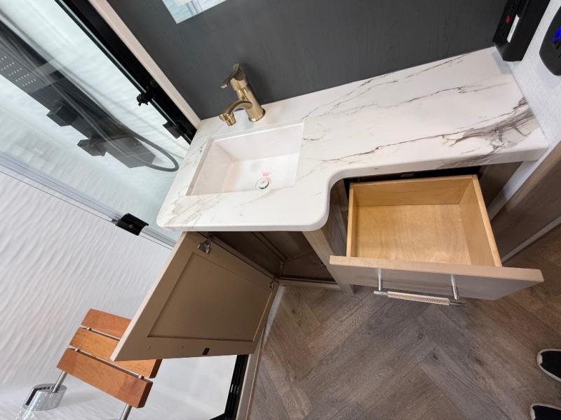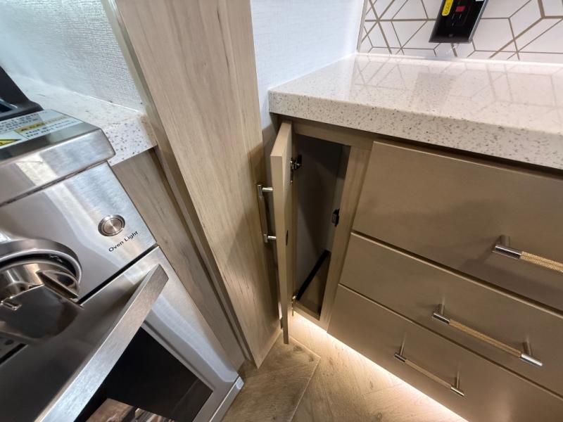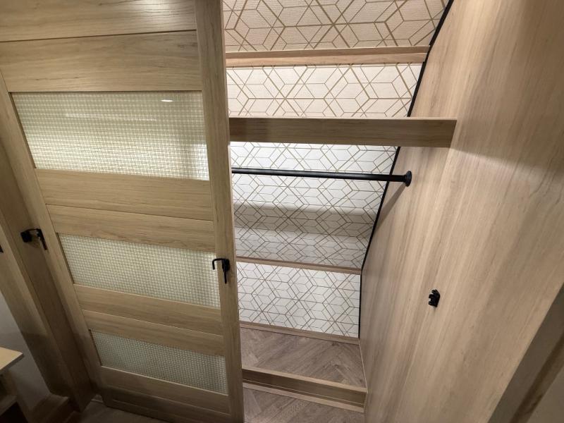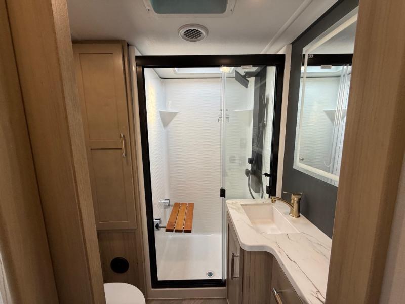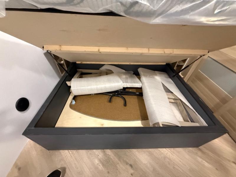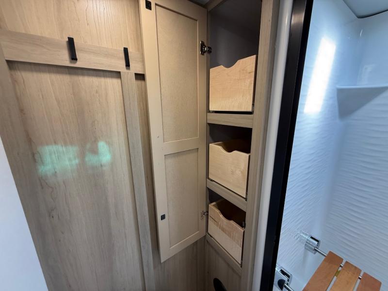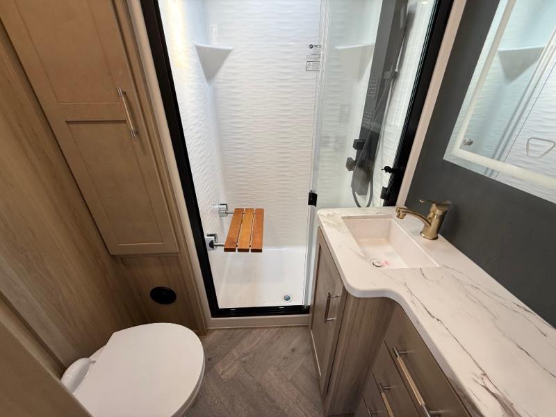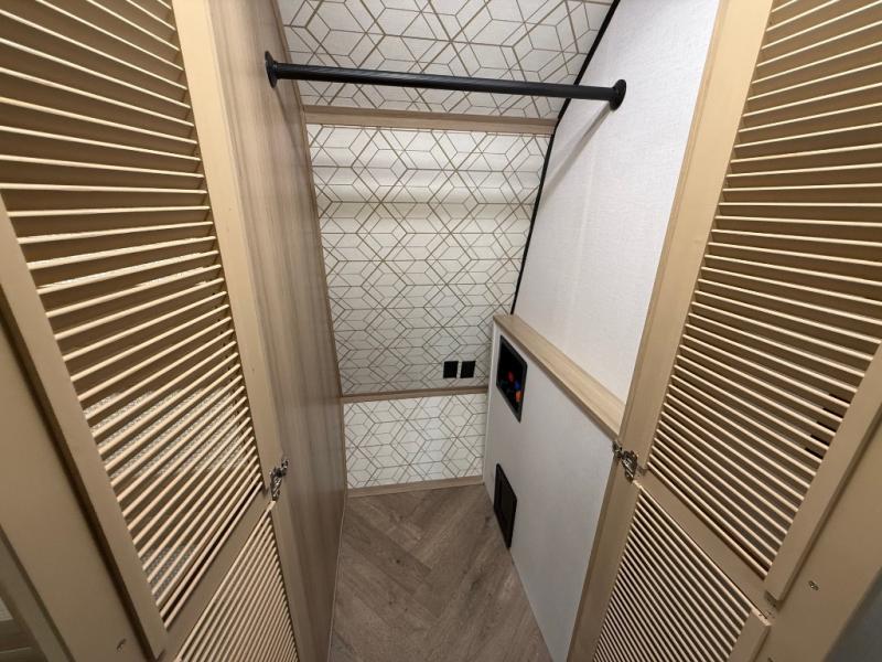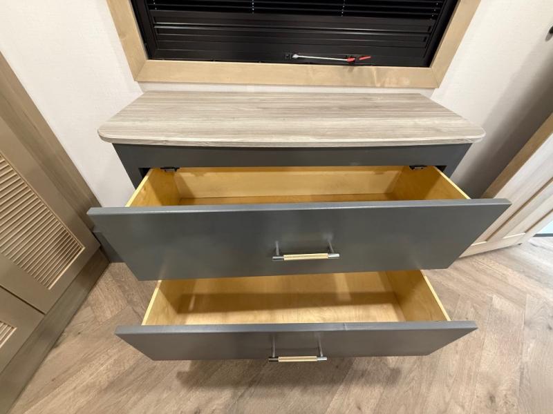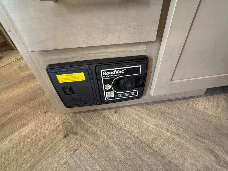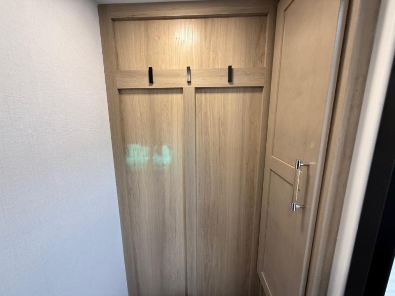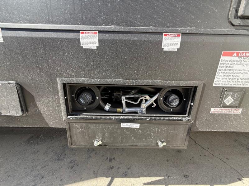 The whole family will love camping in this fifth wheel toy hauler! The front private bedroom has a king bed slide for more interior space, a Smart LED TV, a front large wardrobe, plus washer and dryer prep. Freshen up each morning in the full bathroom with the fiberglass one-piece shower then head to the kitchen to fry up some eggs on the four-burner range and bake some cinnamon rolls in the 24" stainless steel oven. Grab a cold cup of orange juice from the 20-cu. ft. 12-volt refrigerator and enjoy it along with the eggs at the dinette table or in the 15' garage on one of the dual opposing sofas with cupholders. The L-shaped hide-a-bed sofa is conveniently across from the entertainment center with a 50" Smart LED TV and fireplace. As you head into the 15' garage area, you will notice a loft with a twin bed, a queen bed above the opposing sofas, Adjust-A-Track frame welded tie downs, and one of the dual entry doors to the unit!