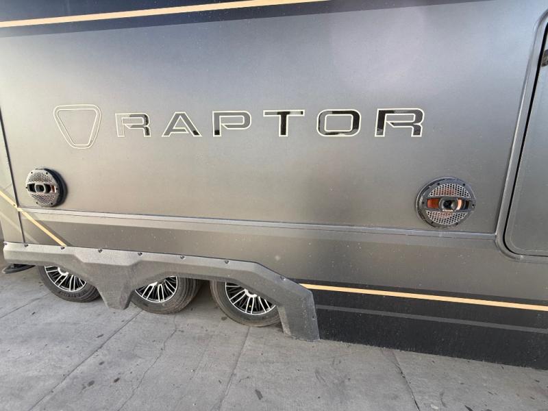 Experience a breath of fresh air with one of these Keystone RV Raptor fifth wheel toy haulers! Their rugged construction consists of a one-piece Alpha Super Flex TPO roof membrane, Dyna Span floor decking, and 5,000 lb. frame-welded tie- downs to keep your toys in place as you travel. Some unexpected conveniences you will appreciate include an Omni-Chill A/C system to keep you cool on those hot summer days, a Furrion backup camera, MaxTurn™ technology with a Helux™ pin box, and a Generation 3 iN-Command smart automation system with Global Connect to make life easier. There is also designer style vinyl flooring throughout, along with new ceiling treatment with LED accent lighting, beach wood and white cabinetry, and many more interior comforts!