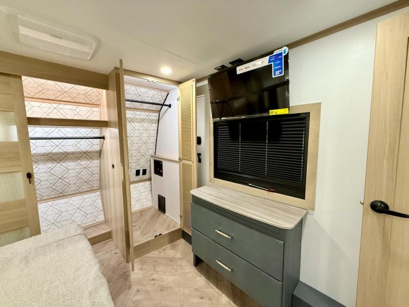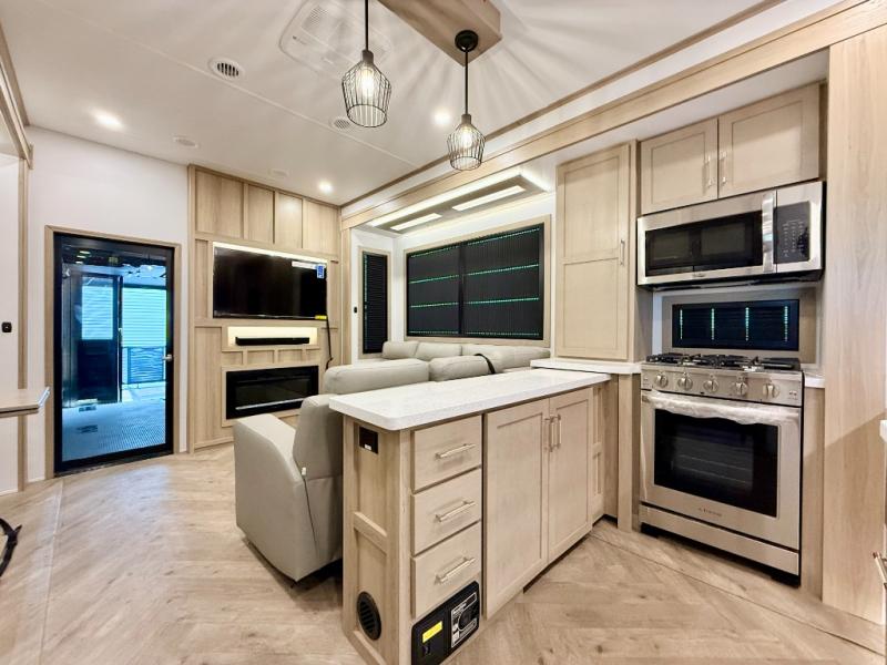 The whole family will love camping in this fifth wheel toy hauler! The front private bedroom has a king bed slide for more interior space, a Smart LED TV, a front large wardrobe, plus washer and dryer prep. Freshen up each morning in the full bathroom with the fiberglass one-piece shower then head to the kitchen to fry up some eggs on the four burner Lusso range and bake some cinnamon rolls in the 24" stainless steel oven. Grab a cold cup of orange juice from the 20 cu. ft. 12 volt refrigerator and enjoy it along with the eggs at the dinette table or in the 14' garage on one of the dual opposing sofas with cupholders. The L-shaped hide-a-bed sofa is conveniently across from the entertainment center with a 50" Smart LED TV and fireplace. As you head into the 14' garage area, you will notice a HappiJac bed with a 32" x 74" mattress, a queen bed above the opposing sofas, Raptor exclusive frame welded tie downs, and one of the dual entry doors to the unit!