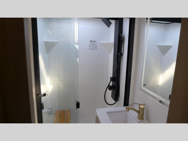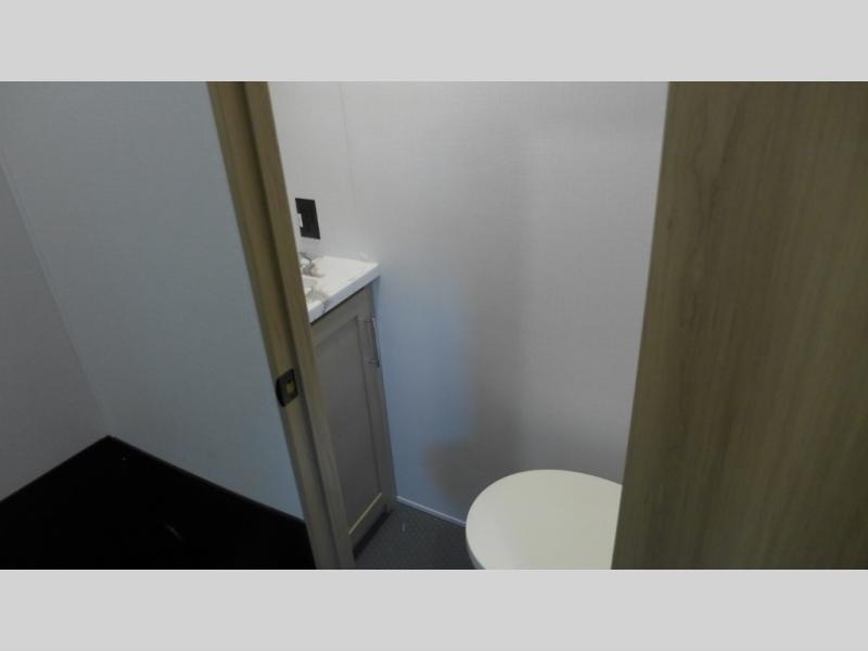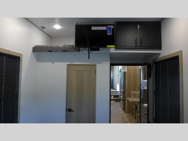 The whole family will love camping in this fifth wheel toy hauler! The front private bedroom has a king bed slide for more interior space, a Smart LED TV, a front large wardrobe, plus washer and dryer prep. Freshen up each morning in the full bathroom with the fiberglass one-piece shower then head to the kitchen to fry up some eggs on the four-burner range and bake some cinnamon rolls in the 24" stainless steel oven. Grab a cold cup of orange juice from the 20-cu. ft. 12-volt refrigerator and enjoy it along with the eggs at the dinette table or in the 13' garage on one of the dual opposing sofas. The L-shaped hide-a-bed sofa is conveniently across from the entertainment center with a 50" Smart LED TV and fireplace. As you head into the 13' garage area, you will notice a HappiJac bed with a queen-size top bed, a loft with a twin bed, plus a convenient half bath!