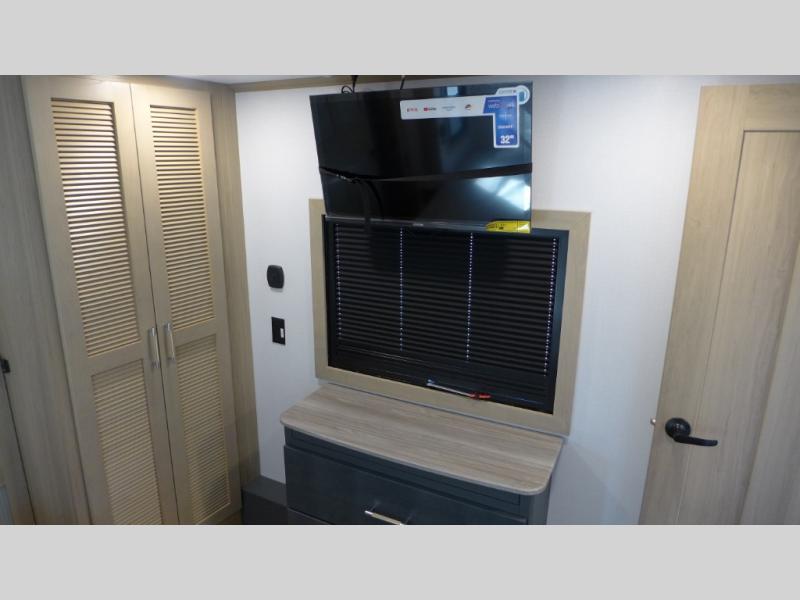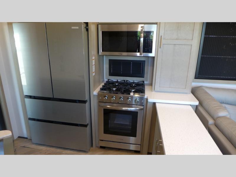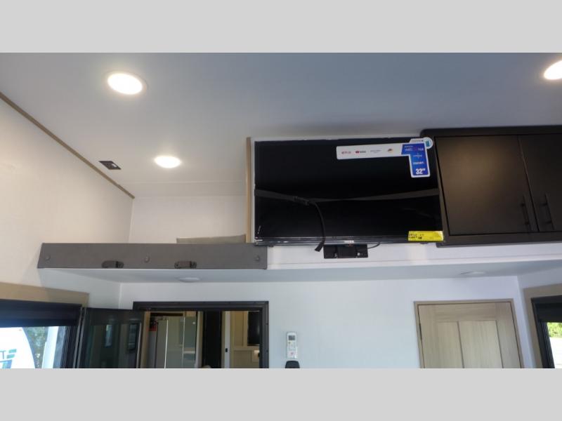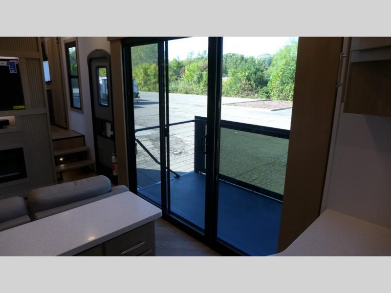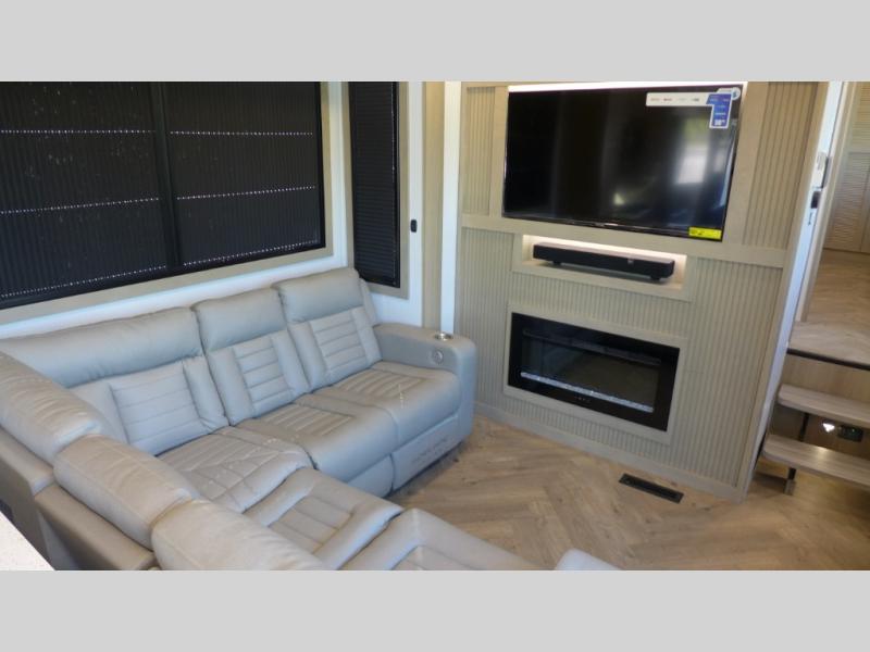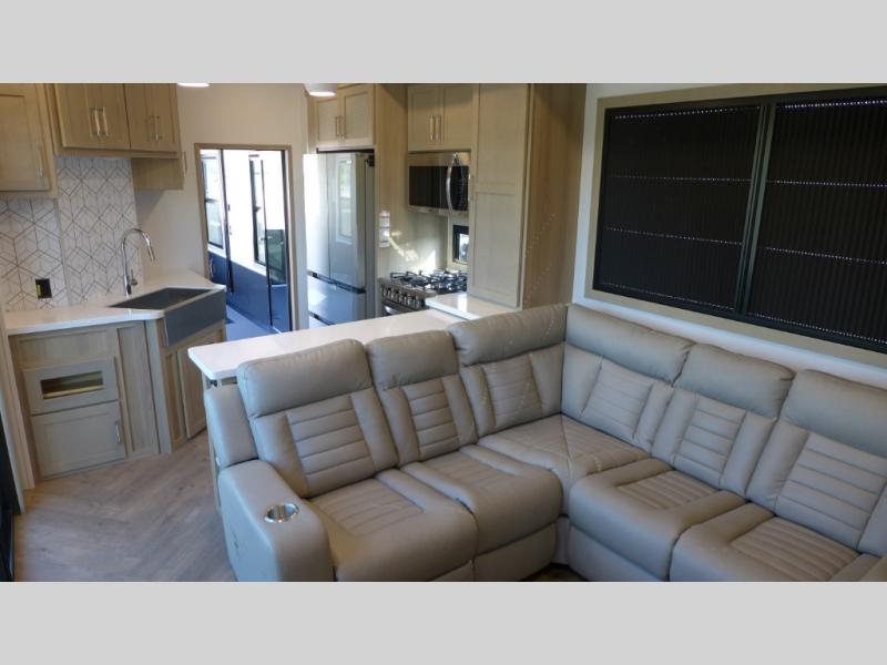 Everyone will love camping in this fifth wheel toy hauler! The front private bedroom has a king bed slide for more interior space, a Smart LED TV, a front large master closet, plus washer and dryer prep. Freshen up each morning in the full bathroom with the fiberglass one-piece shower then head to the kitchen to fry up some eggs on the four-burner range and bake a tasty treat in the 24" stainless steel oven. Grab a cold one from the 20-cu. ft.12-volt refrigerator and even enjoy it outdoors thanks to the three awnings. The L-shaped sofa is conveniently across from the entertainment center with a 50" Smart LED TV and fireplace. As you head into the garage area, you will notice a loft with a twin bed, a queen bed above the opposing sofas, and one of the dual entry doors to the unit!