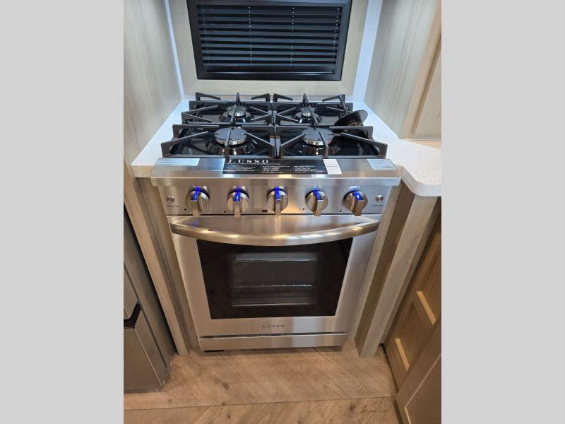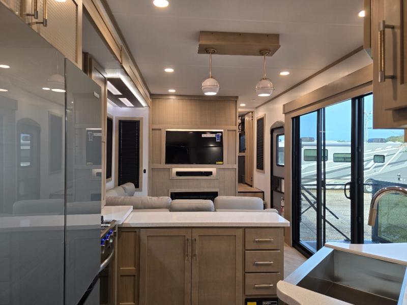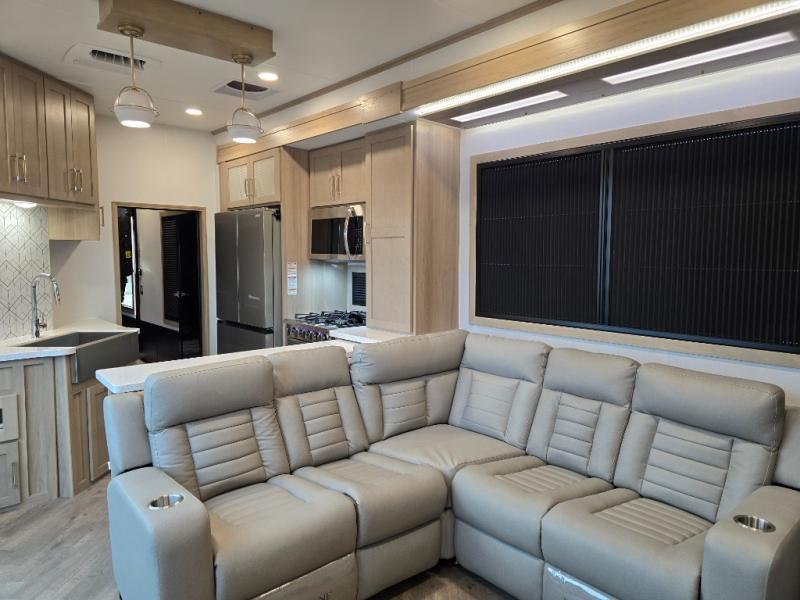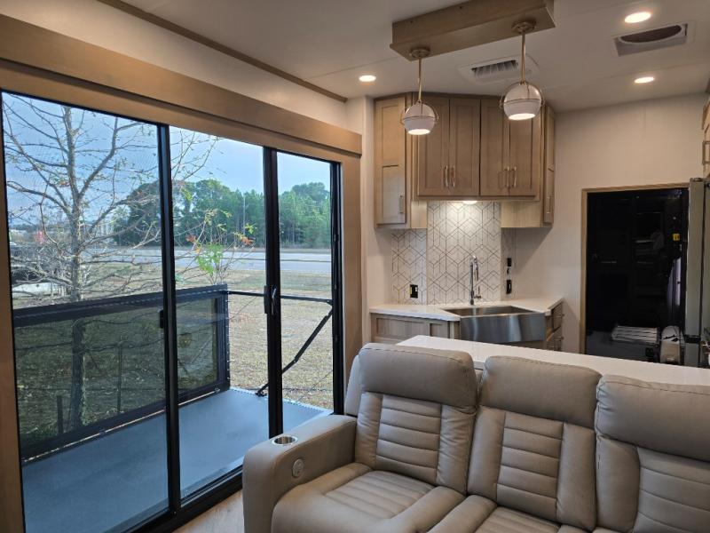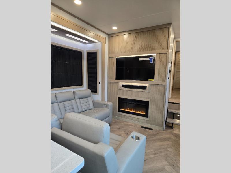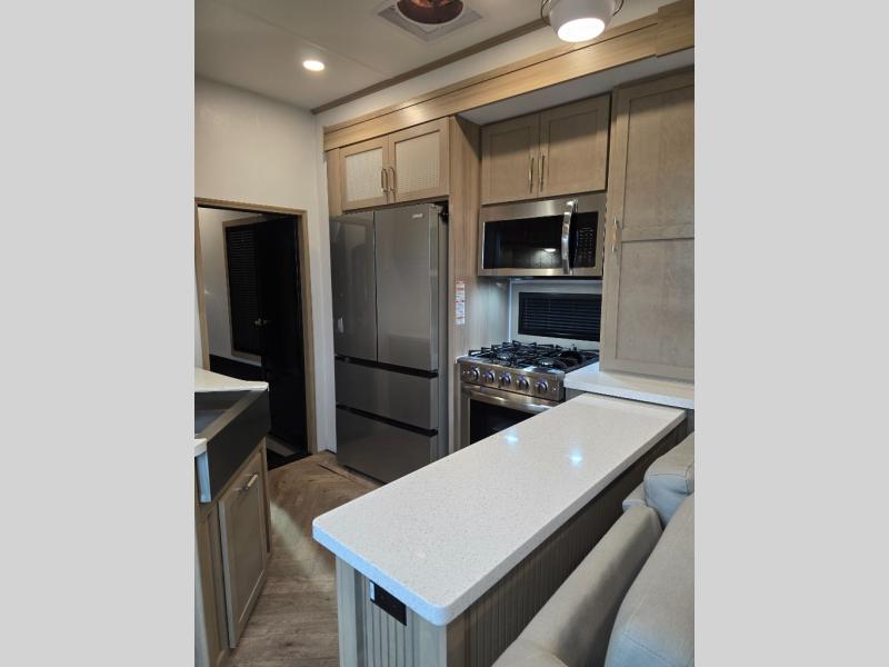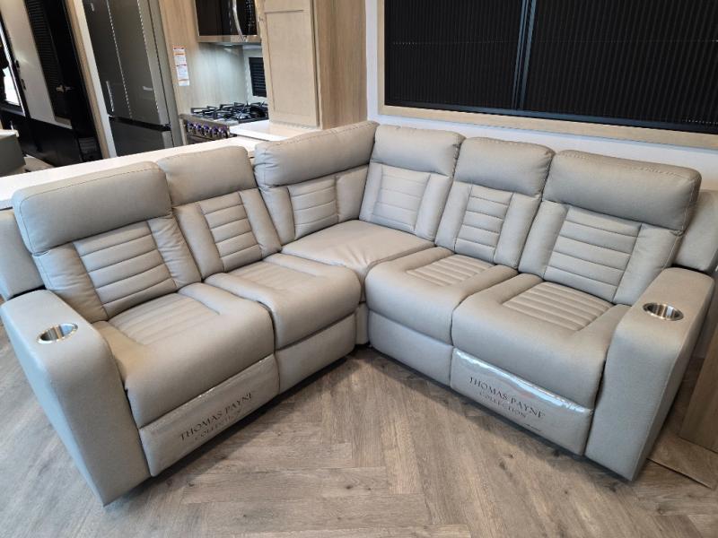 Interior comforts that don’t compromise: Designer vinyl flooring, solid-surface countertops, residential-style cabinetry, and premium furnishings like power-recline furniture, plus full kitchens and modern entertainment systems — blending luxury with rugged practicality.