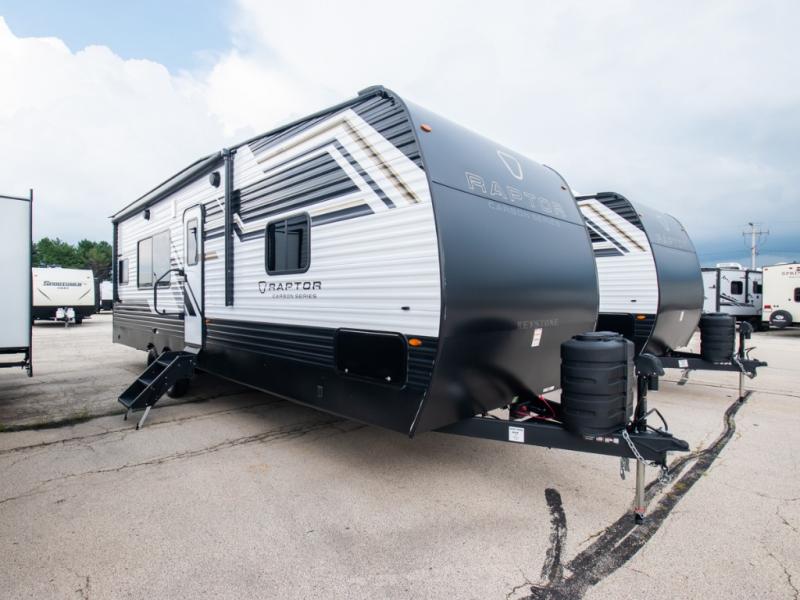 Each Raptor Carbon Series toy hauler travel trailer is built with a 10" I-beam frame, laminated sidewalls with double-welded aluminum construction, plus Dexter E-Z lube 6,000 lb. axles with self-adjusting brakes, electric stabilizer jacks for easy setup, and MORyde step above steps for stability on any type of ground you camp on. On the interior, designer style vinyl flooring throughout, pull-down window shades for privacy at night, and LED lighting throughout. You will appreciate the Girard tankless on-demand water heater for showering both inside and out, and you can also customize your trailer by adding a few options if you wish. The optional patio package will provide you with a raised outdoor living area to enjoy, and the optional SolarFlex protect 220 allows you the ability to decide how you want to camp. Choose your favorite model today!