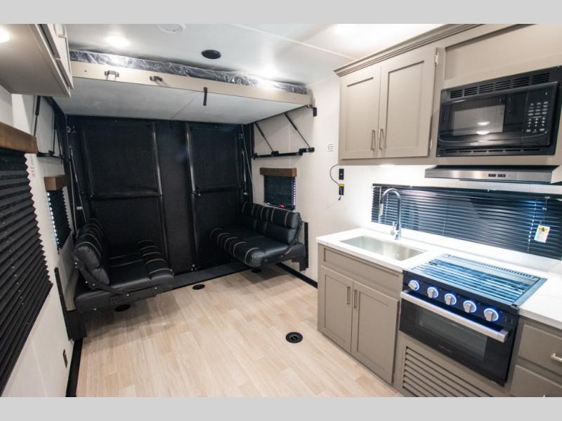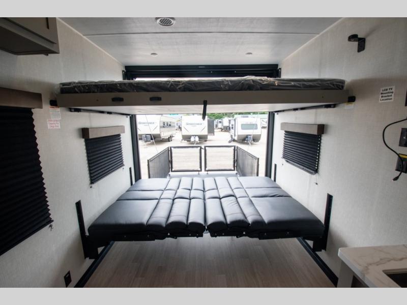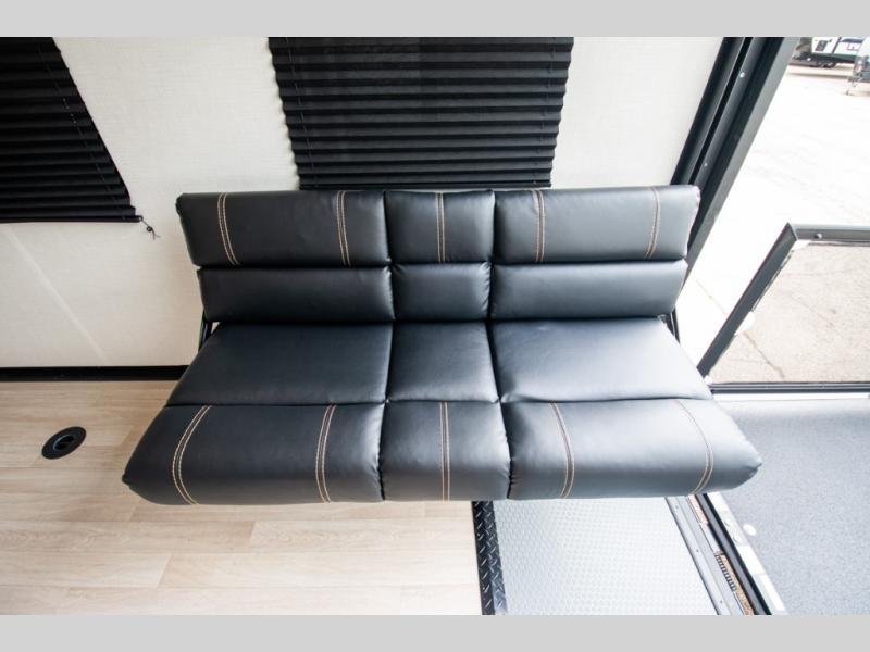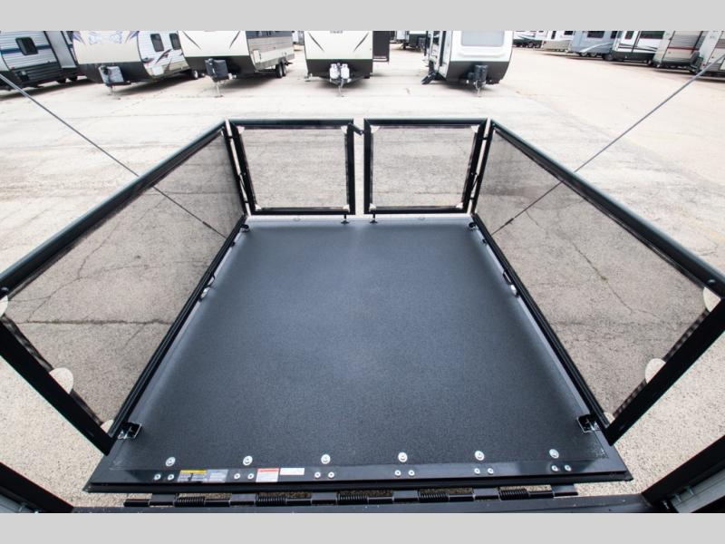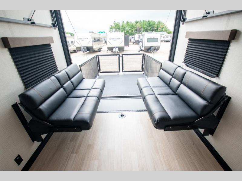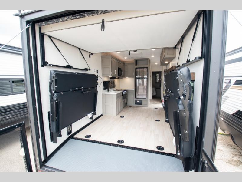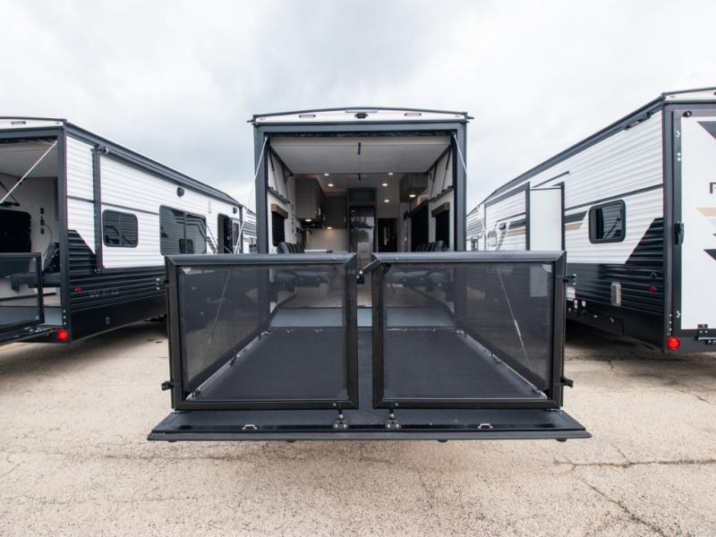 Load up your favorite off-road riding toys and head to your favorite trails, dunes, or competition rally with family and friends. This unit sleeps six with the RV queen bed in front and the dual roll over sofas and bonus bunk in back. The 13' garage with 5K inter-lock system tie downs will get all of your cargo safely to your destination. Once in camp, the rear ramp door will help you easily unload and then set up the sofas with table in between. A full kitchen allows you to refuel your bodies easily by providing a three burner range and 17" black oven, a 10.7 cu. ft. 12V refrigerator for your perishables, and a residential microwave oven to heat up leftovers. The full bath will allow everyone to easily clean up after a full day of fun, and you will enjoy the private front bedroom with an RV queen bed and a full closet for all of your things. On the outside, an 18' power awning provides added living space, or you might like to add the optional patio package for a raised extension of your unit giving you an outdoor space to enjoy.
