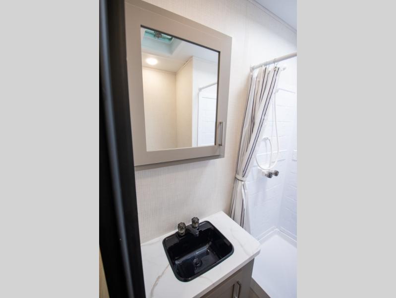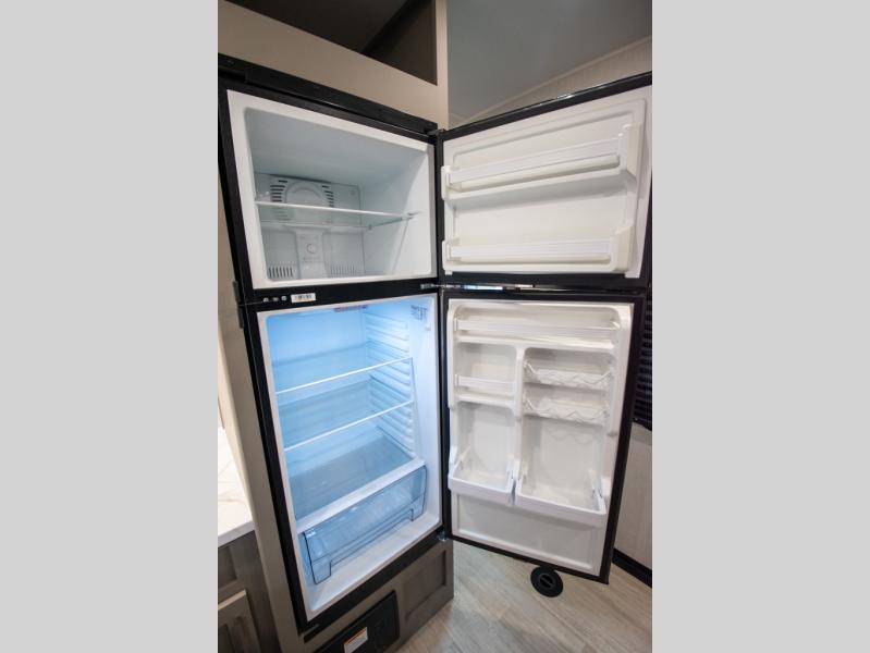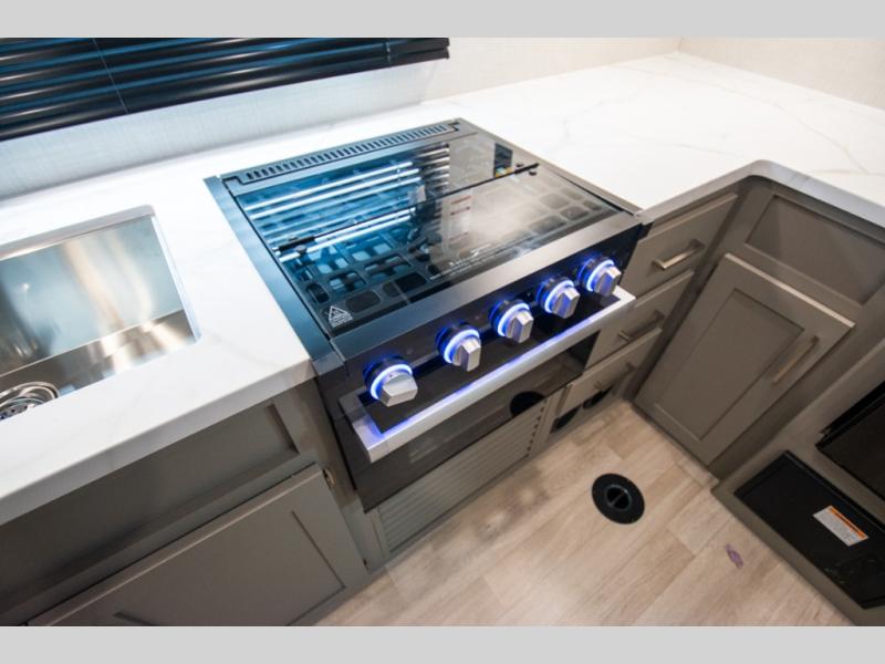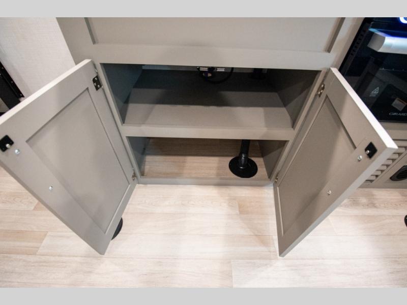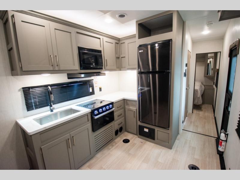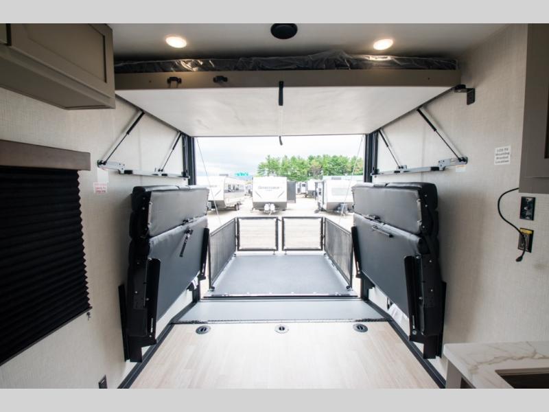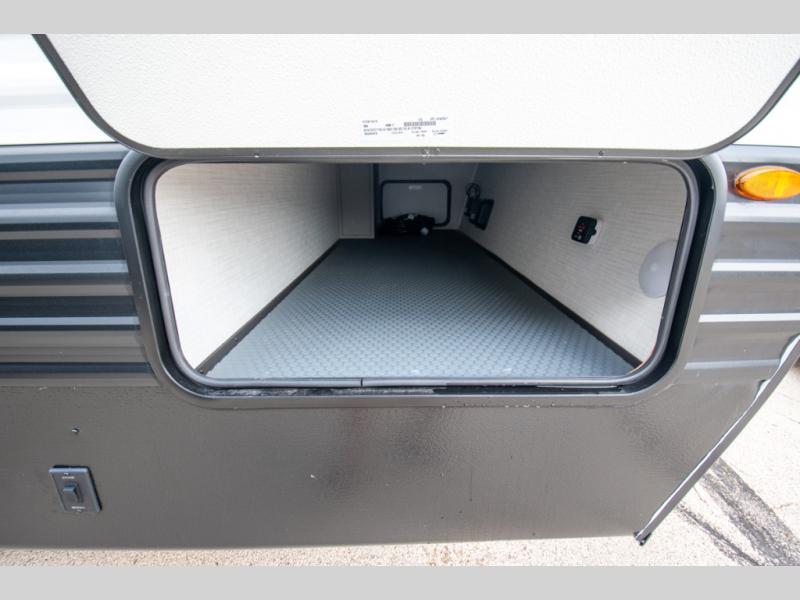 Load up your favorite off-road riding toys and head to your favorite trails, dunes, or competition rally with family and friends. This unit sleeps six with the RV queen bed in front and the dual roll over sofas and bonus bunk in back. The 13' garage with 5K inter-lock system tie downs will get all of your cargo safely to your destination. Once in camp, the rear ramp door will help you easily unload and then set up the sofas with table in between. A full kitchen allows you to refuel your bodies easily by providing a three burner range and 17" black oven, a 10.7 cu. ft. 12V refrigerator for your perishables, and a residential microwave oven to heat up leftovers. The full bath will allow everyone to easily clean up after a full day of fun, and you will enjoy the private front bedroom with an RV queen bed and a full closet for all of your things. On the outside, an 18' power awning provides added living space, or you might like to add the optional patio package for a raised extension of your unit giving you an outdoor space to enjoy.