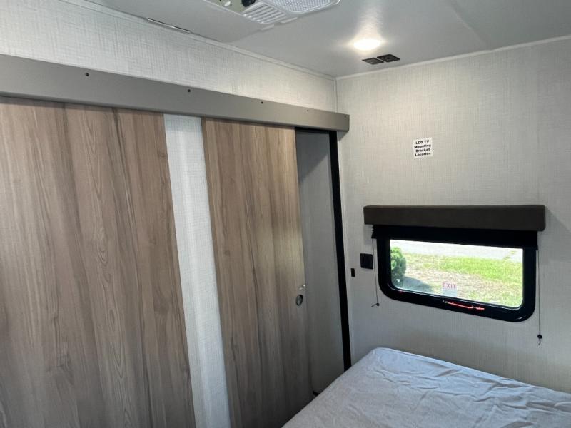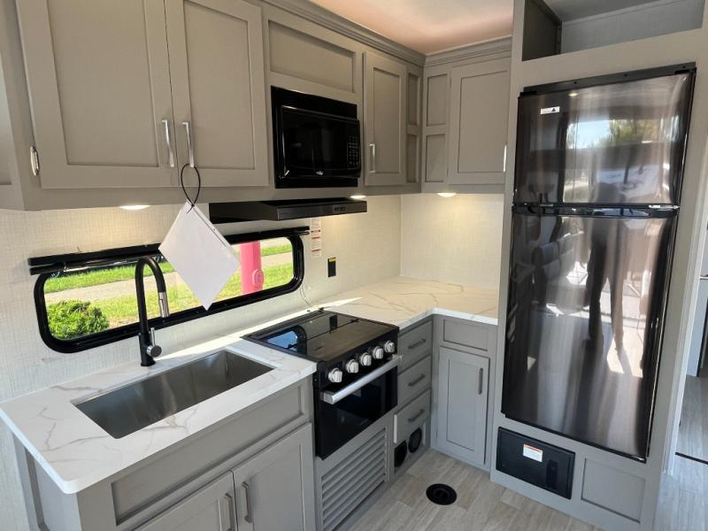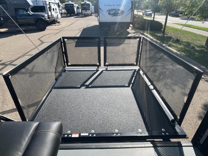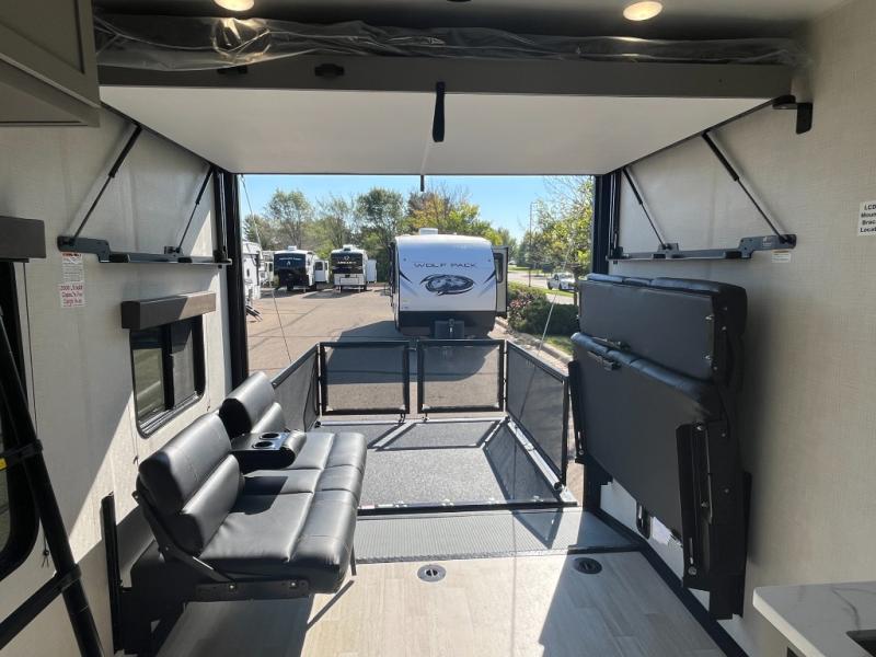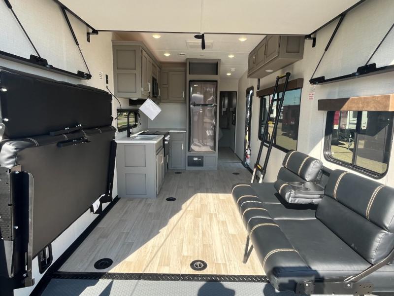 Load up your favorite off-road riding toys and head to your favorite trails, dunes, or competition rally with family and friends. This unit sleeps six with the RV queen bed in front and the dual roll over sofas and bonus bunk in back. The 13' garage with 5K inter-lock system tie downs will get all of your cargo safely to your destination. Once in camp, the rear ramp door will help you easily unload and then set up the sofas with table in between. A full kitchen allows you to refuel your bodies easily by providing a three burner range and 17" black oven, a 10.7 cu. ft. 12V refrigerator for your perishables, and a residential microwave oven to heat up leftovers. The full bath will allow everyone to easily clean up after a full day of fun, and you will enjoy the private front bedroom with an RV queen bed and a full closet for all of your things. On the outside, an 18' power awning provides added living space, or you might like to add the optional patio package for a raised extension of your unit giving you an outdoor space to enjoy.