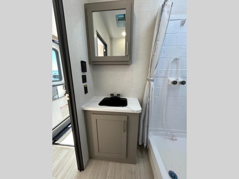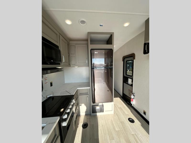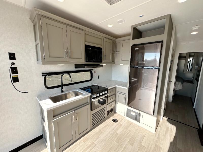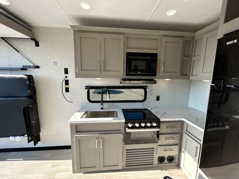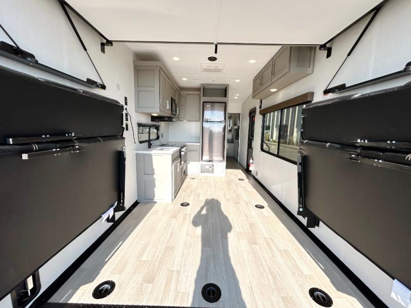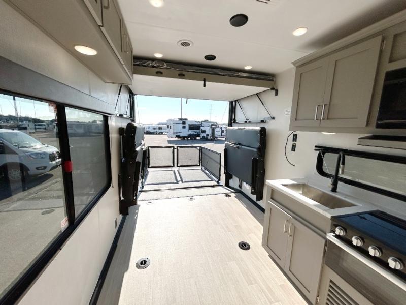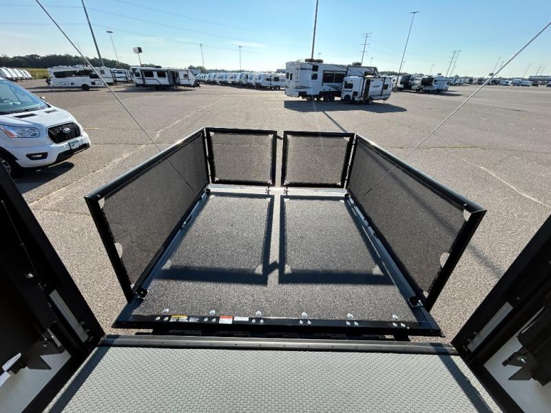 Load up your favorite off-road riding toys and head to your favorite trails, dunes, or competition rally with family and friends. This unit sleeps six with the RV queen bed in front and the dual roll over sofas and bonus bunk in back. The 13' garage with 5K inter-lock system tie downs will get all of your cargo safely to your destination. Once in camp, the rear ramp door will help you easily unload and then set up the sofas with table in between. A full kitchen allows you to refuel your bodies easily by providing a three burner range and 17" black oven, a 10.7 cu. ft. 12V refrigerator for your perishables, and a residential microwave oven to heat up leftovers. The full bath will allow everyone to easily clean up after a full day of fun, and you will enjoy the private front bedroom with an RV queen bed and a full closet for all of your things. On the outside, an 18' power awning provides added living space, or you might like to add the optional patio package for a raised extension of your unit giving you an outdoor space to enjoy.