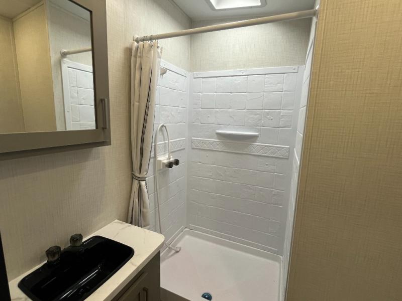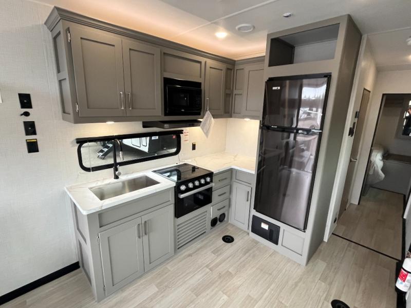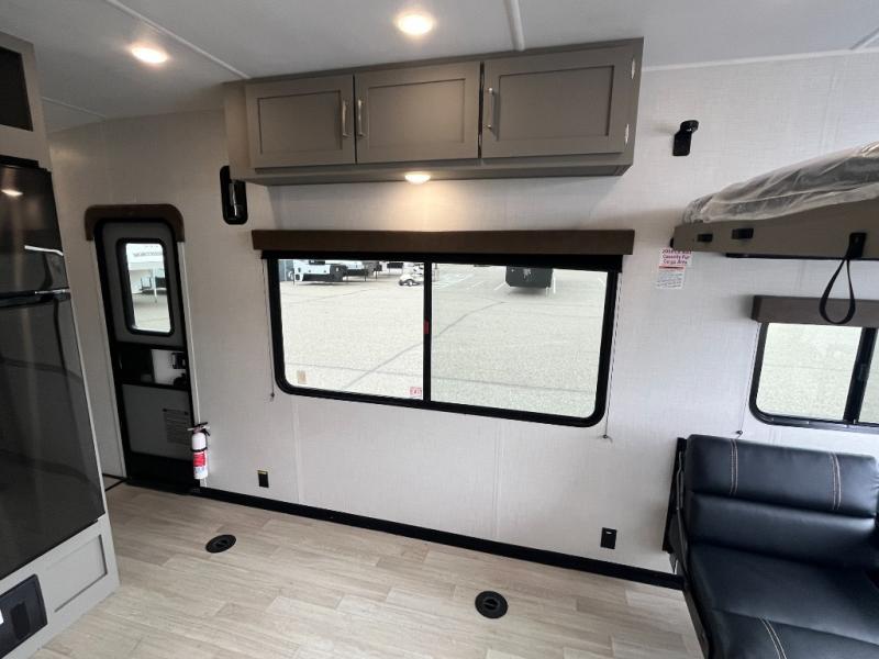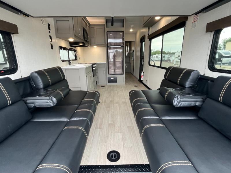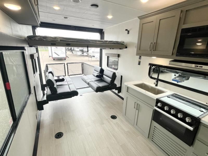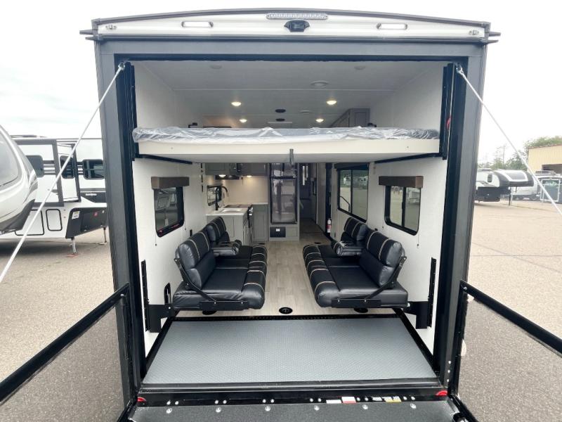 Load up your favorite off-road riding toys and head to your favorite trails, dunes, or competition rally with family and friends. This unit sleeps six with the RV queen bed in front and the dual roll over sofas and bonus bunk in back. The 13' garage with 5K inter-lock system tie downs will get all of your cargo safely to your destination. Once in camp, the rear ramp door will help you easily unload and then set up the sofas with table in between. A full kitchen allows you to refuel your bodies easily by providing a three burner range and 17" black oven, a 10.7 cu. ft. 12V refrigerator for your perishables, and a residential microwave oven to heat up leftovers. The full bath will allow everyone to easily clean up after a full day of fun, and you will enjoy the private front bedroom with an RV queen bed and a full closet for all of your things. On the outside, an 18' power awning provides added living space, or you might like to add the optional patio package for a raised extension of your unit giving you an outdoor space to enjoy.