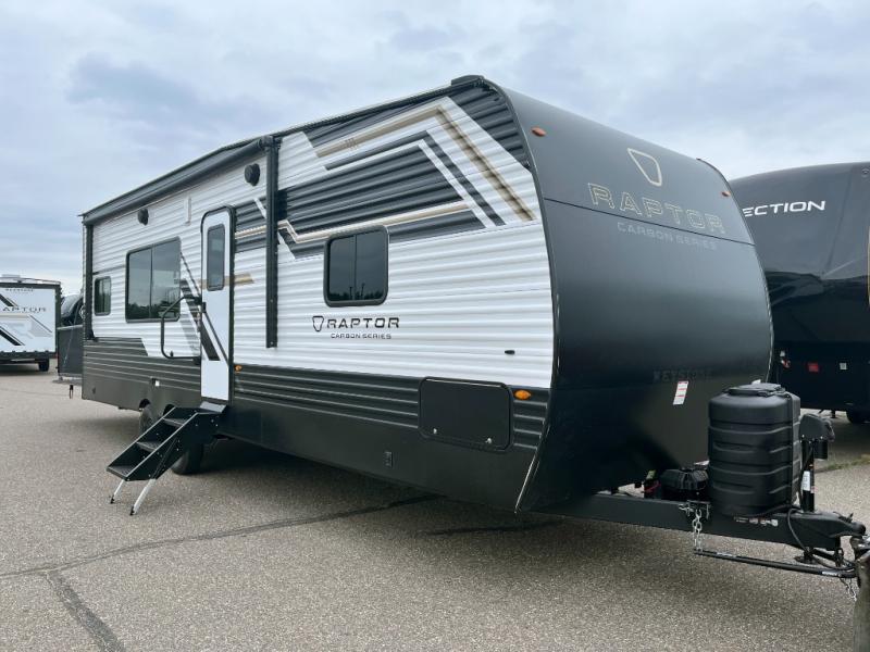Each Raptor Carbon Series toy hauler travel trailer is built with a 10" I-beam frame, laminated sidewalls with double-welded aluminum construction, plus Dexter E-Z lube 6,000 lb. axles with self-adjusting brakes, electric stabilizer jacks for easy setup, and MORyde step above steps for stability on any type of ground you camp on. On the interior, designer style vinyl flooring throughout, pull-down window shades for privacy at night, and LED lighting throughout. You will appreciate the Girard tankless on-demand water heater for showering both inside and out, and you can also customize your trailer by adding a few options if you wish. The optional patio package will provide you with a raised outdoor living area to enjoy, and the optional SolarFlex protect 220 allows you the ability to decide how you want to camp. Choose your favorite model today!