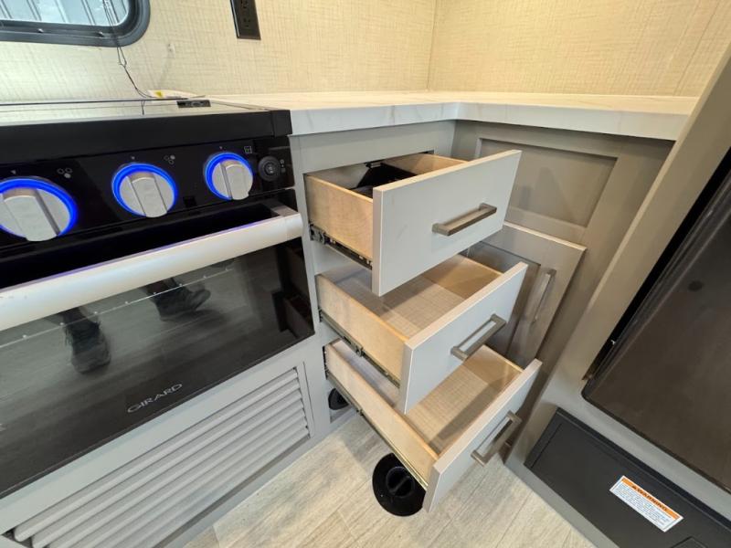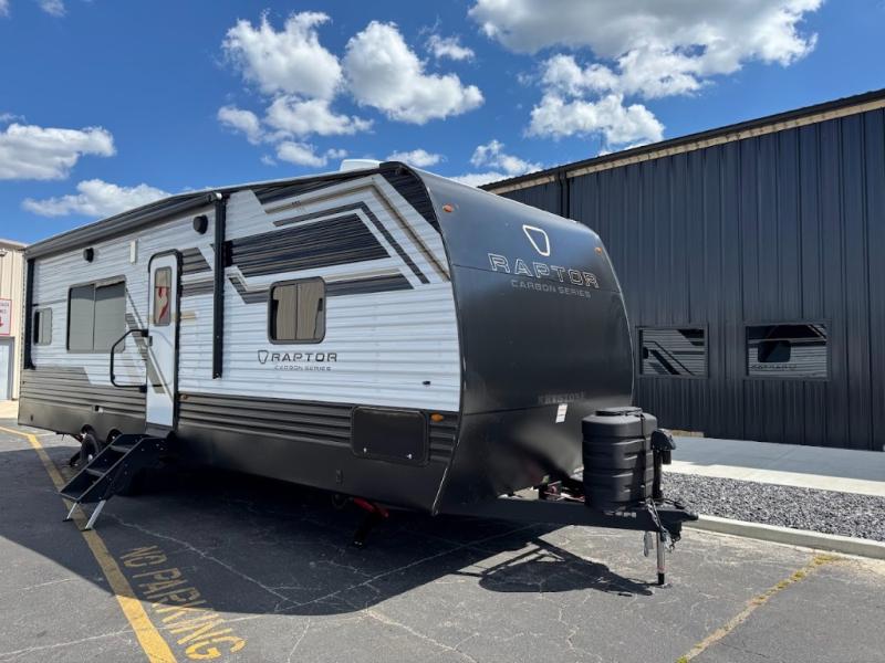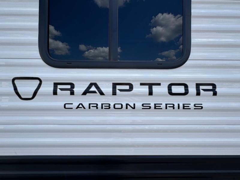 Each Raptor Carbon Series toy hauler travel trailer is built with a 10" I-beam frame, laminated sidewalls with double-welded aluminum construction, plus Dexter E-Z lube 6,000 lb. axles with self-adjusting brakes, electric stabilizer jacks for easy setup, and MORyde step above steps for stability on any type of ground you camp on. On the interior, designer style vinyl flooring throughout, pull-down window shades for privacy at night, and LED lighting throughout. You will appreciate the Girard tankless on-demand water heater for showering both inside and out, and you can also customize your trailer by adding a few options if you wish. The optional patio package will provide you with a raised outdoor living area to enjoy, and the optional SolarFlex protect 220 allows you the ability to decide how you want to camp. Choose your favorite model today!