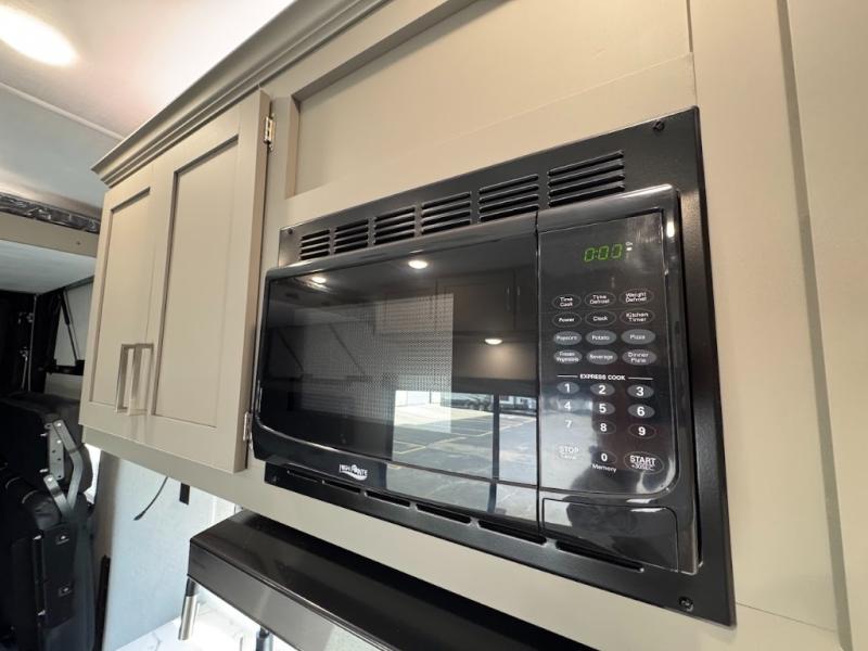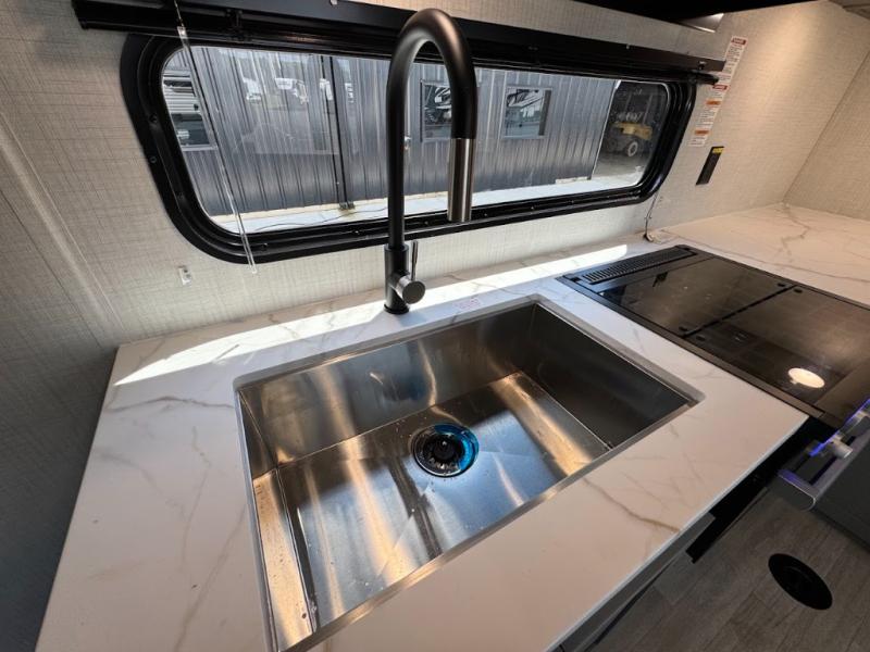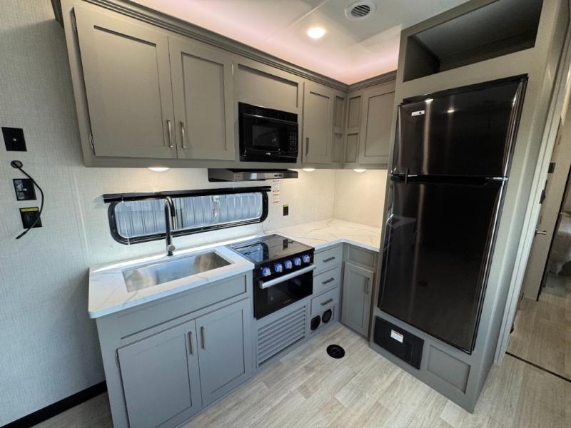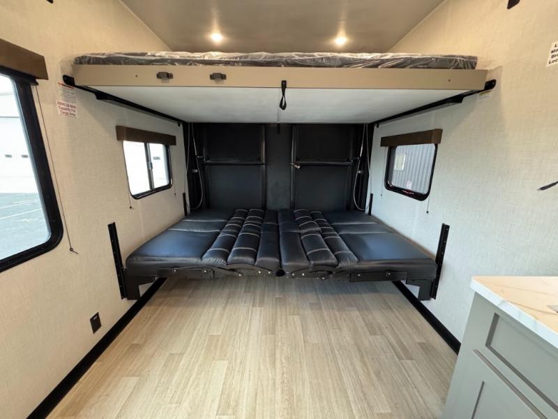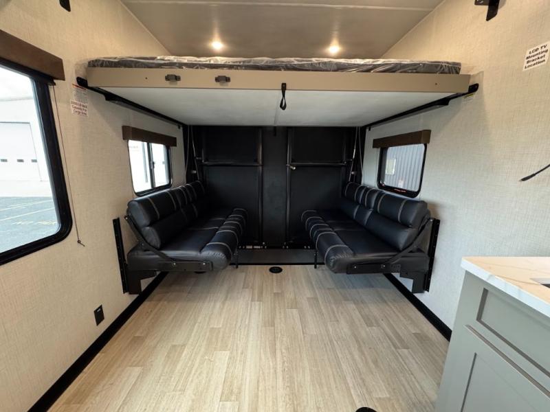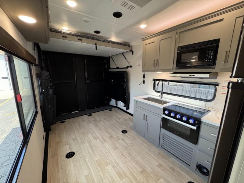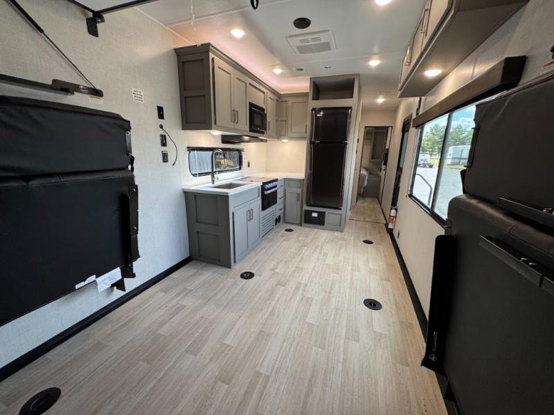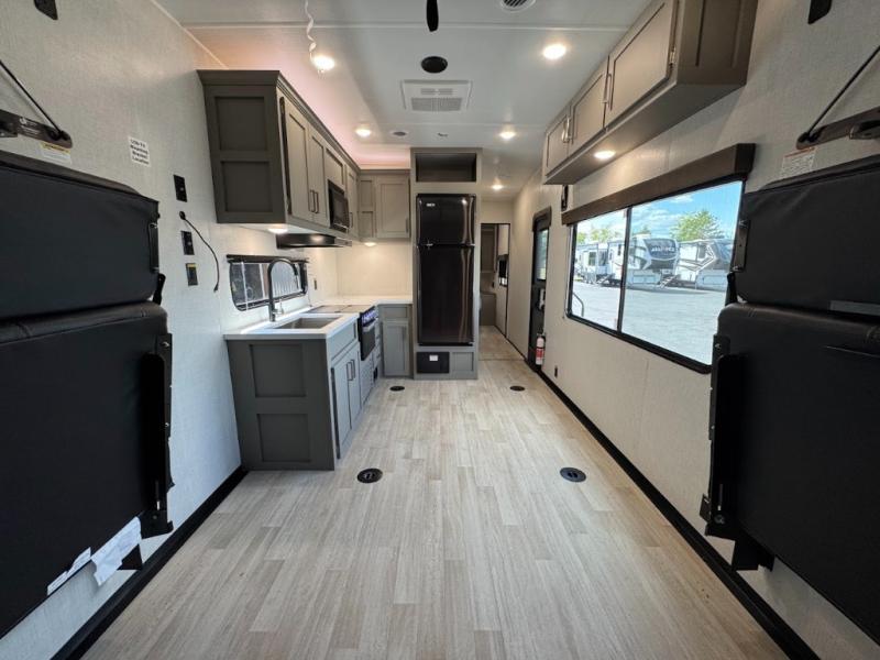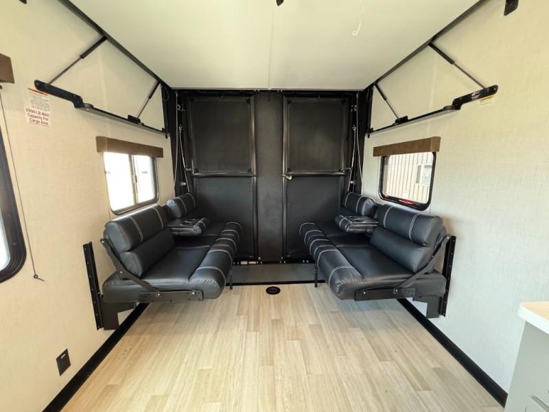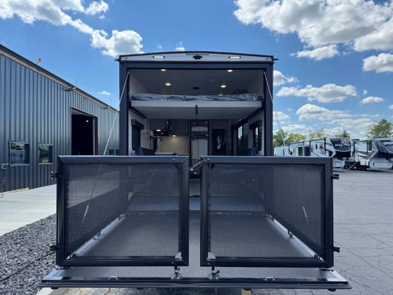 Load up your favorite off-road riding toys and head to your favorite trails, dunes, or competition rally with family and friends. This unit sleeps six with the RV queen bed in front and the dual roll over sofas and bonus bunk in back. The 13' garage with 5K inter-lock system tie downs will get all of your cargo safely to your destination. Once in camp, the rear ramp door will help you easily unload and then set up the sofas with table in between. A full kitchen allows you to refuel your bodies easily by providing a three burner range and 17" black oven, a 10.7 cu. ft. 12V refrigerator for your perishables, and a residential microwave oven to heat up leftovers. The full bath will allow everyone to easily clean up after a full day of fun, and you will enjoy the private front bedroom with an RV queen bed and a full closet for all of your things. On the outside, an 18' power awning provides added living space, or you might like to add the optional patio package for a raised extension of your unit giving you an outdoor space to enjoy.