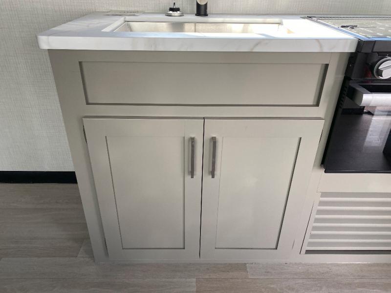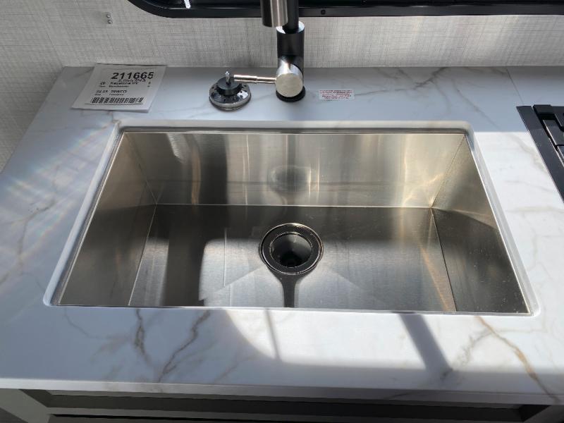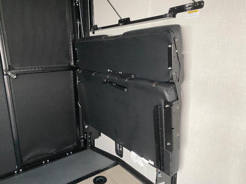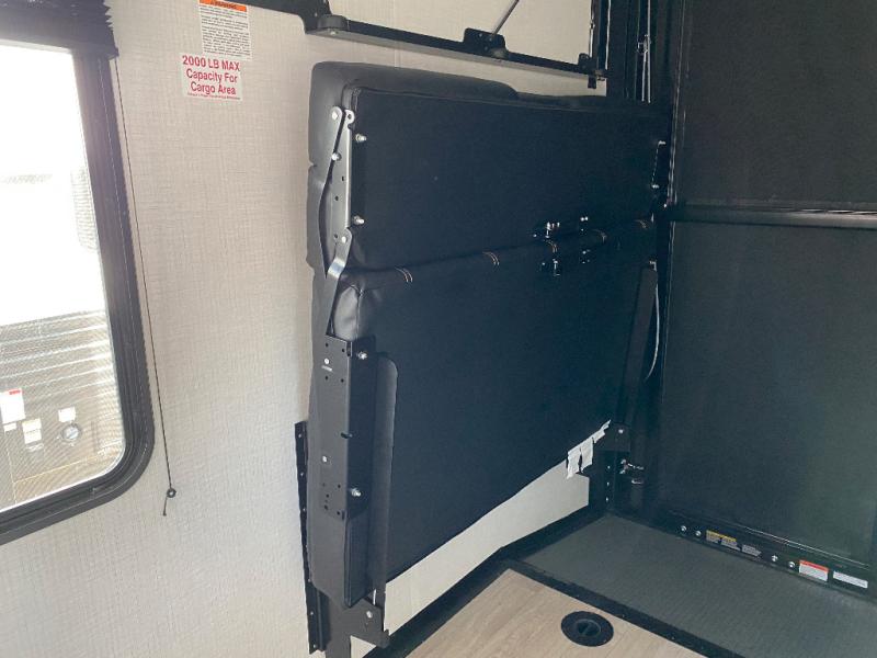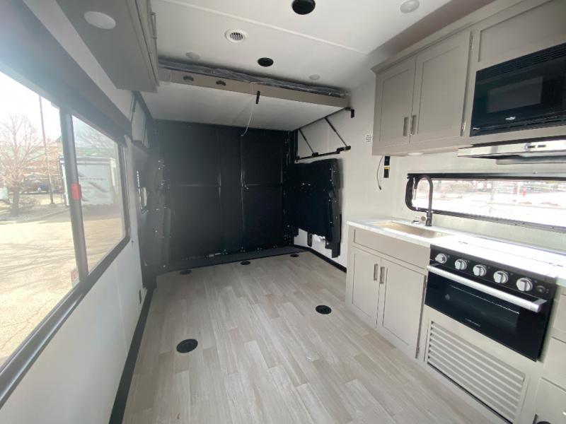Load up your favorite off-road riding toys and head to your favorite trails, dunes, or competition rally with family and friends. This unit sleeps six with the RV queen bed in front and the dual roll over sofas and bonus bunk in back. The 13' garage with 5K inter-lock system tie downs will get all of your cargo safely to your destination. Once in camp, the rear ramp door will help you easily unload and then set up the sofas with table in between. A full kitchen allows you to refuel your bodies easily by providing a three-burner range and 17" black oven, a 12V refrigerator for your perishables, and a microwave oven to heat up leftovers. The full bath will allow everyone to easily clean up after a full day of fun, and you will enjoy the private front bedroom with an RV queen bed and a full closet for all of your things.