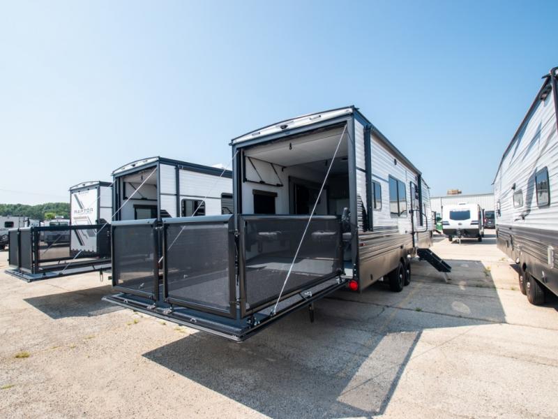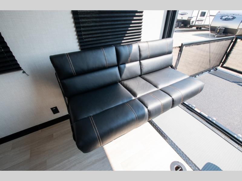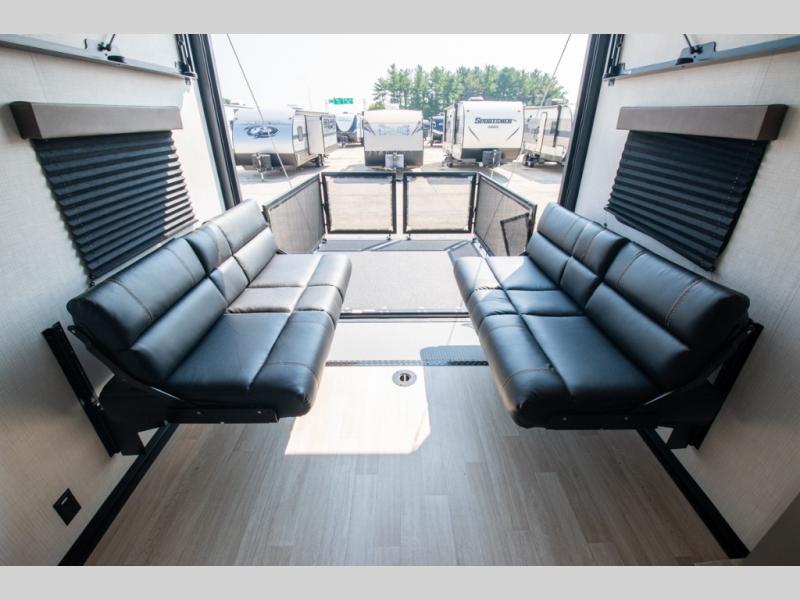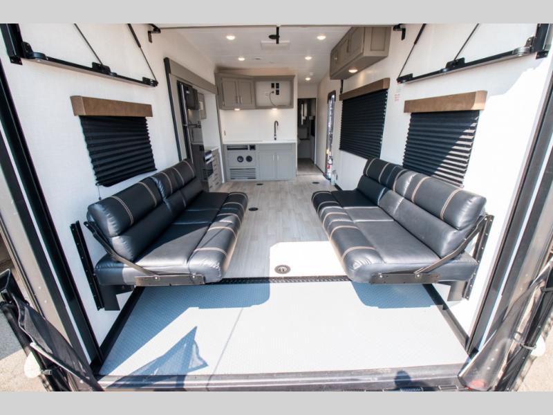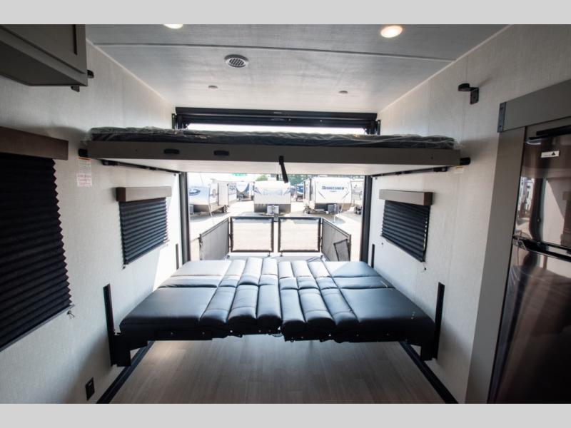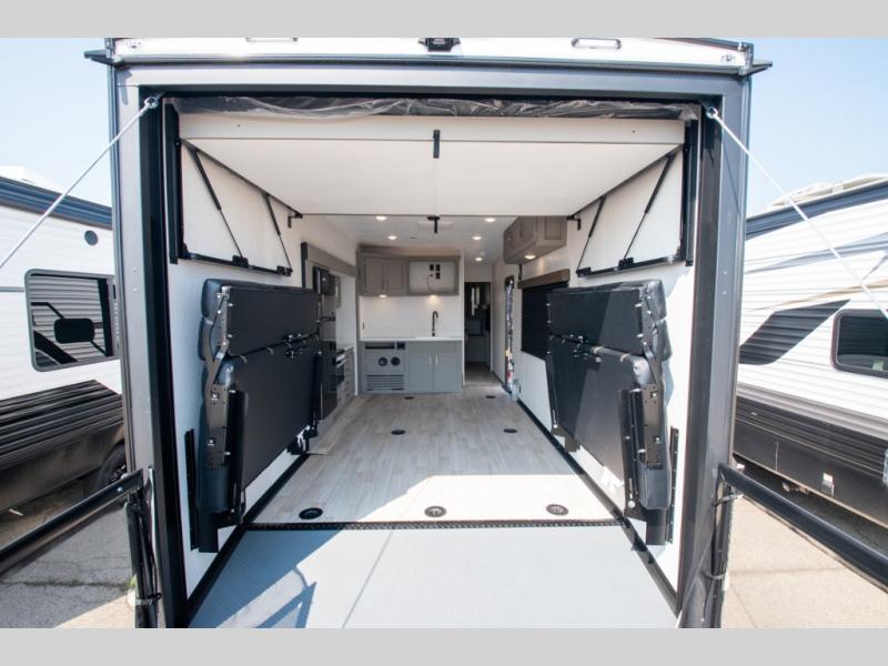 Enjoy a weekend of fun with family and friends with this wide open concept toy hauler featuring 15' of garage space for your toys! This unit sleeps six with the RV queen bed in front and the dual roll over sofas and bonus bunk in back. The 15' garage with 5K inter-lock system tie downs will get all of your cargo safely to your destination. Once in camp, the rear ramp door will help you easily unload and then set up the sofas with table in between. The kitchen slide featuring a hutch allows you to refuel your bodies easily by providing a three burner range and 17" black oven, a 10.7 cu. ft. 12V refrigerator for your perishables, and a residential microwave oven to warm up leftovers. The full bath will allow everyone to easily clean up after a full day of fun, and you will enjoy the private front bedroom with an RV queen bed and a full closet for all of your things. On the outside, an 18' power awning provides added living space, or you might like to add the optional patio packaged for a raised extension of your unit giving you an outdoor space to hang out and enjoy some fresh air between rides.
