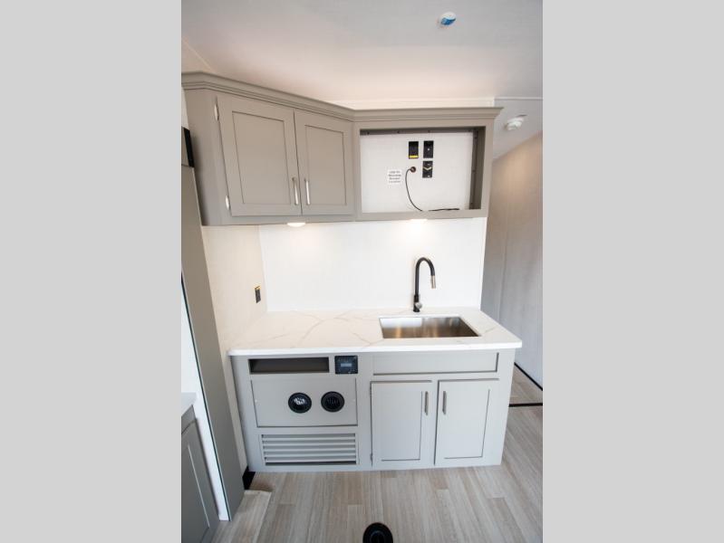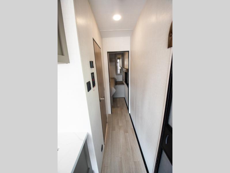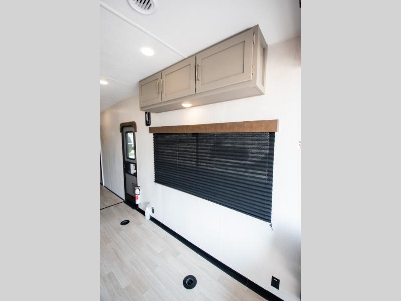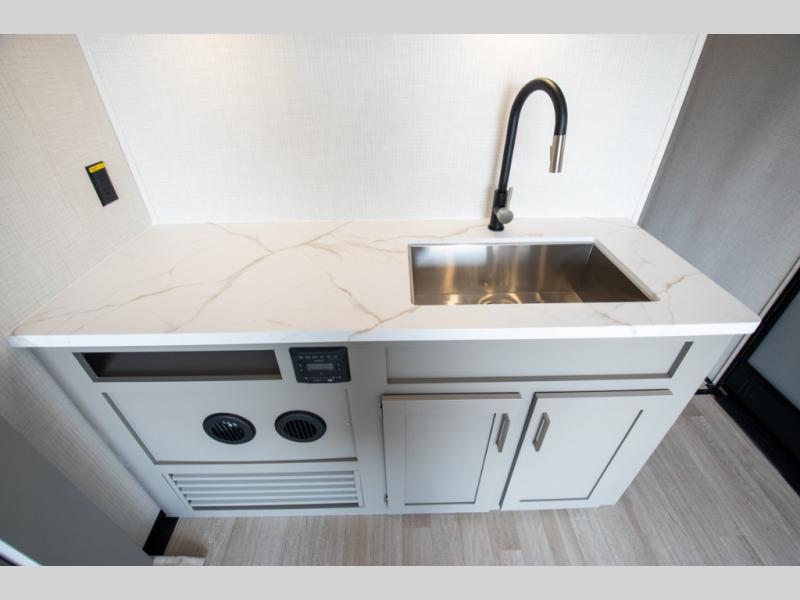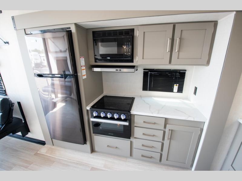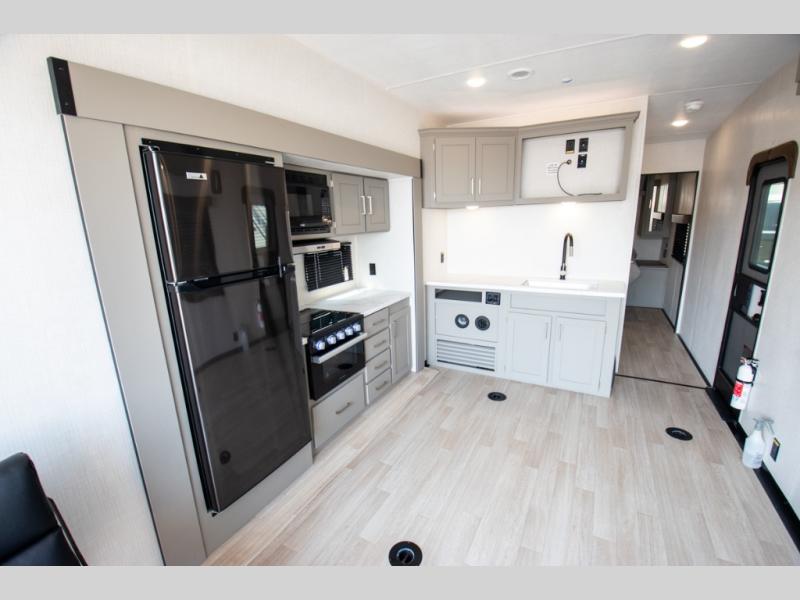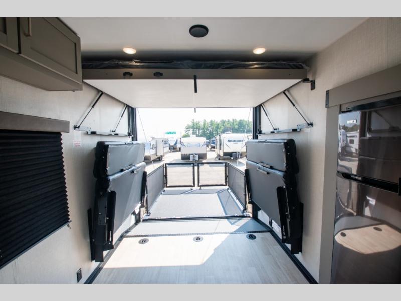 Enjoy a weekend of fun with family and friends with this wide open concept toy hauler featuring 15' of garage space for your toys! This unit sleeps six with the RV queen bed in front and the dual roll over sofas and bonus bunk in back. The 15' garage with 5K inter-lock system tie downs will get all of your cargo safely to your destination. Once in camp, the rear ramp door will help you easily unload and then set up the sofas with table in between. The kitchen slide featuring a hutch allows you to refuel your bodies easily by providing a three burner range and 17" black oven, a 10.7 cu. ft. 12V refrigerator for your perishables, and a residential microwave oven to warm up leftovers. The full bath will allow everyone to easily clean up after a full day of fun, and you will enjoy the private front bedroom with an RV queen bed and a full closet for all of your things. On the outside, an 18' power awning provides added living space, or you might like to add the optional patio packaged for a raised extension of your unit giving you an outdoor space to hang out and enjoy some fresh air between rides.