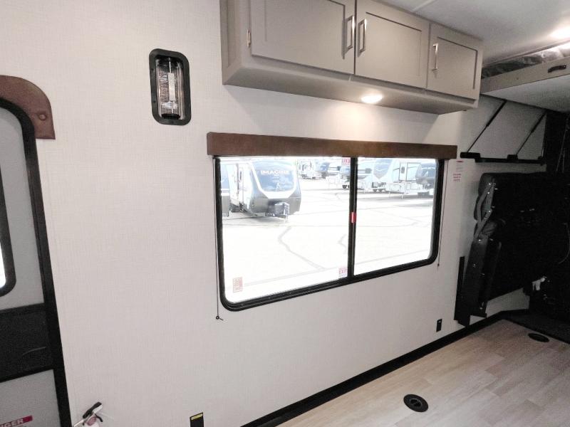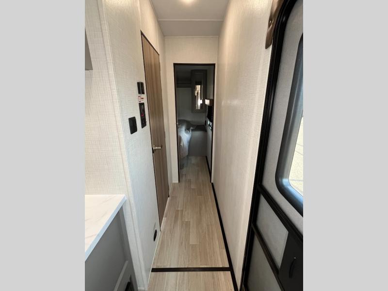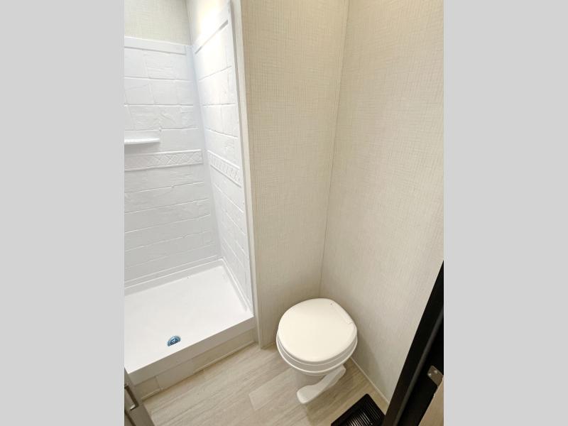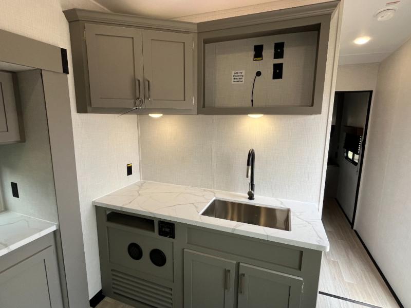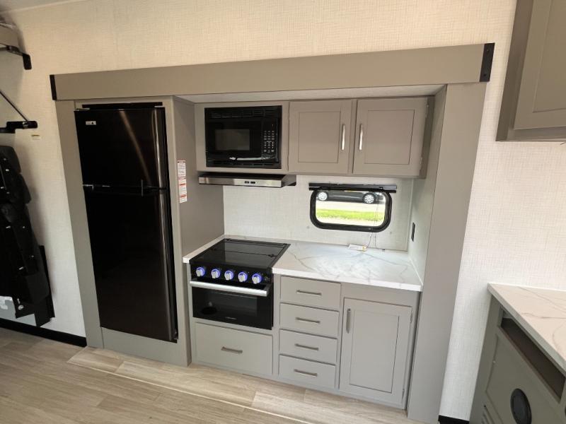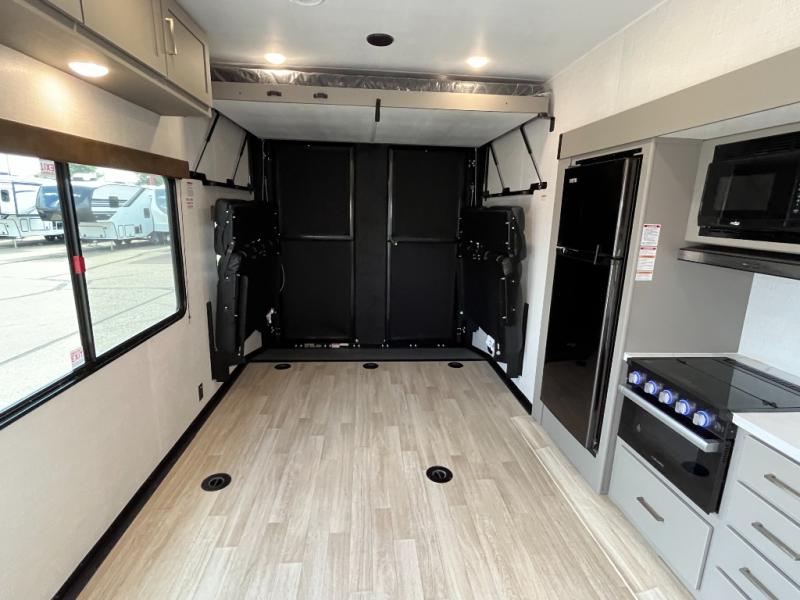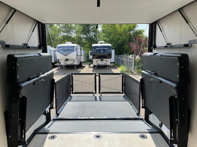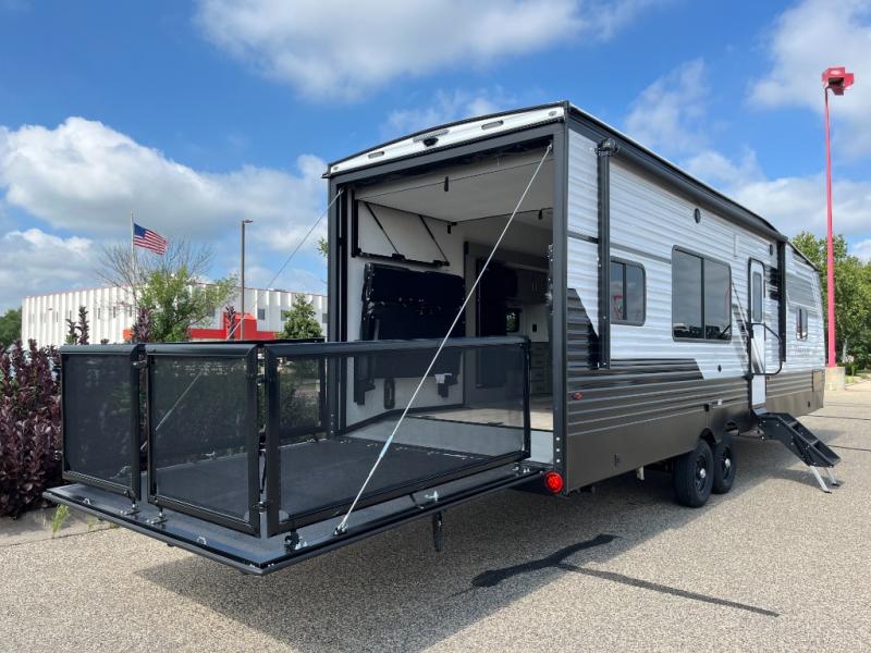 Enjoy a weekend of fun with family and friends with this wide open concept toy hauler featuring 15' of garage space for your toys! This unit sleeps six with the RV queen bed in front and the dual roll over sofas and bonus bunk in back. The 15' garage with 5K inter-lock system tie downs will get all of your cargo safely to your destination. Once in camp, the rear ramp door will help you easily unload and then set up the sofas with table in between. The kitchen slide featuring a hutch allows you to refuel your bodies easily by providing a three burner range and 17" black oven, a 10.7 cu. ft. 12V refrigerator for your perishables, and a residential microwave oven to warm up leftovers. The full bath will allow everyone to easily clean up after a full day of fun, and you will enjoy the private front bedroom with an RV queen bed and a full closet for all of your things. On the outside, an 18' power awning provides added living space, or you might like to add the optional patio packaged for a raised extension of your unit giving you an outdoor space to hang out and enjoy some fresh air between rides.
