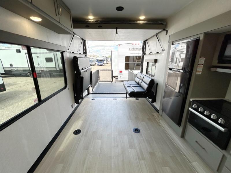 Enjoy a weekend of fun with family and friends with this wide open concept toy hauler featuring 15' of garage space for your toys! This unit sleeps six with the RV queen bed in front and the dual roll over sofas and bonus bunk in back. The 15' garage with 5K inter-lock system tie downs will get all of your cargo safely to your destination. Once in camp, the rear ramp door will help you easily unload and then set up the sofas with table in between. The kitchen slide featuring a hutch allows you to refuel your bodies easily by providing a three burner range and 17" black oven, a 10.7 cu. ft. 12V refrigerator for your perishables, and a residential microwave oven to warm up leftovers. The full bath will allow everyone to easily clean up after a full day of fun, and you will enjoy the private front bedroom with an RV queen bed and a full closet for all of your things. On the outside, an 18' power awning provides added living space, or you might like to add the optional patio packaged for a raised extension of your unit giving you an outdoor space to hang out and enjoy some fresh air between rides.