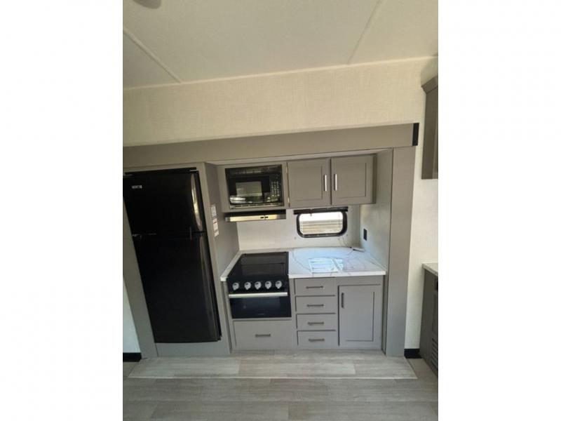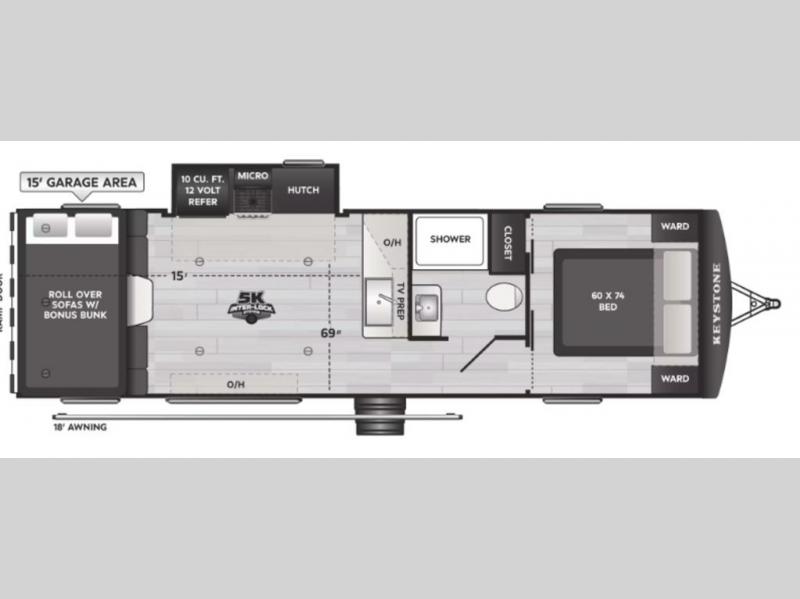 Load up your favorite off-road riding toys and head to your favorite trails, dunes, or competition rally with family and friends. This unit sleeps six with the RV queen bed in front and the dual roll over sofas and bonus bunk in back. The 13' garage with 5K inter-lock system tie downs will get all of your cargo safely to your destination. Once in camp, the rear ramp door will help you easily unload and then set up the sofas with table in between. A full kitchen allows you to refuel your bodies easily by providing a three burner range and 17" black oven, a 10.7 cu. ft. 12V refrigerator for your perishables, and a residential microwave oven to heat up leftovers. The full bath will allow everyone to easily clean up after a full day of fun, and you will enjoy the private front bedroom with an RV queen bed and a full closet for all of your things. On the outside, an 18' power awning provides added living space, or you might like to add the optional patio package for a raised extension of your unit giving you an outdoor space to enjoy.