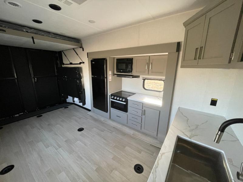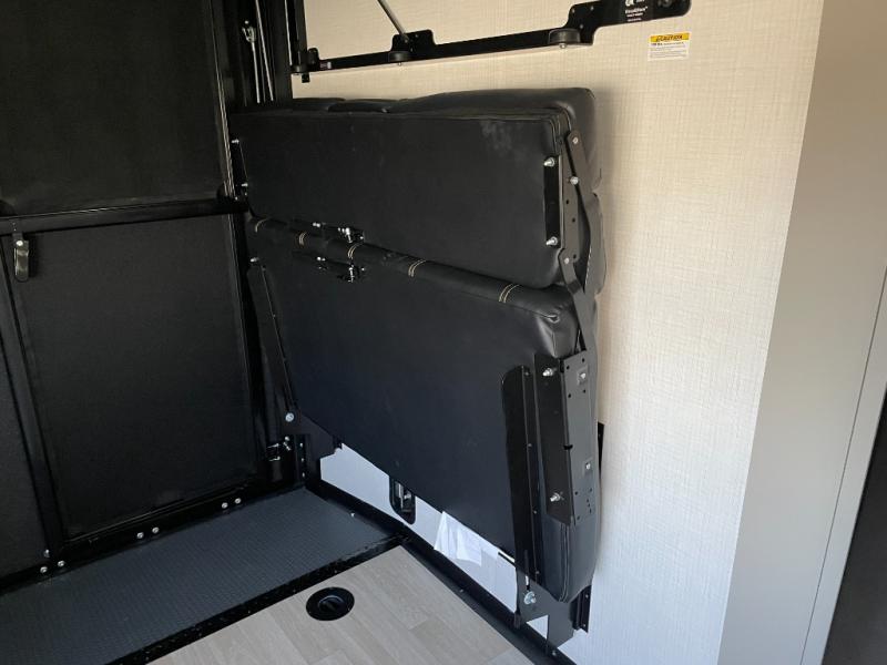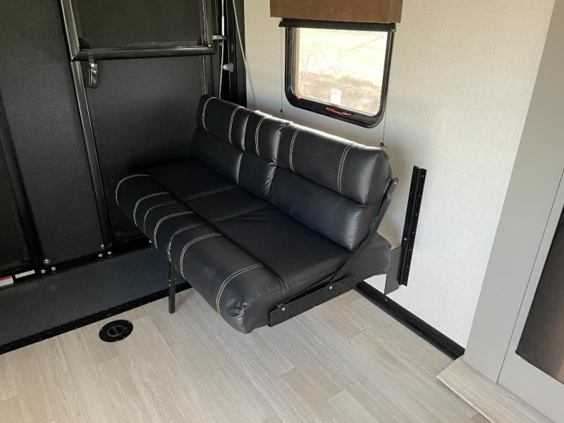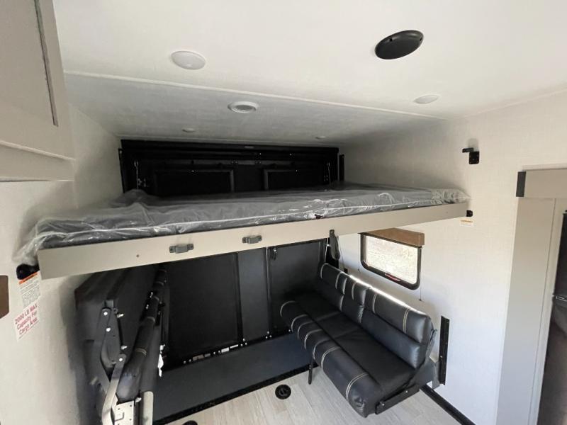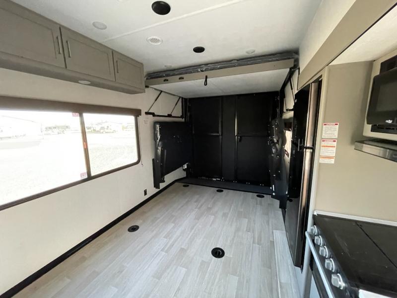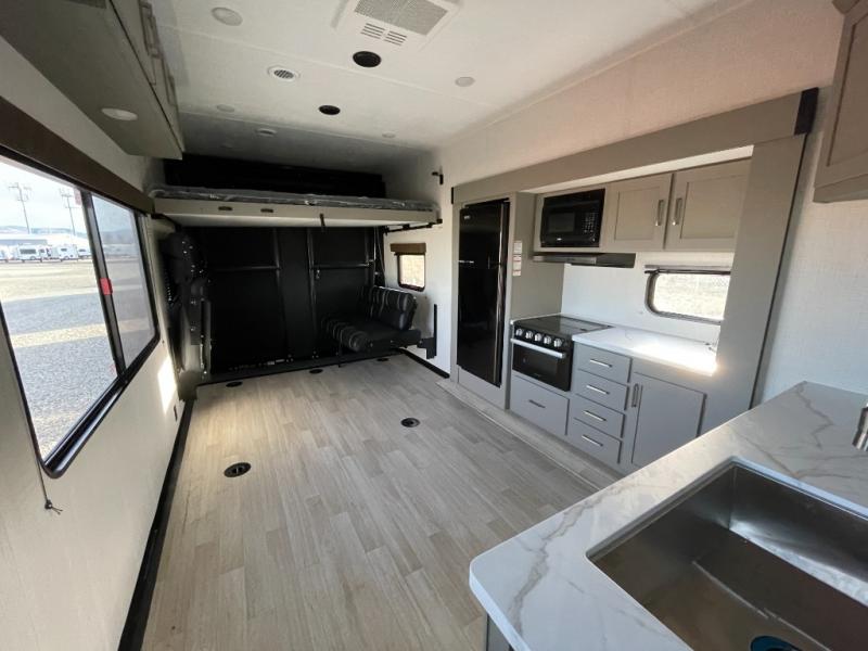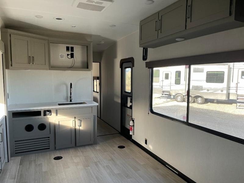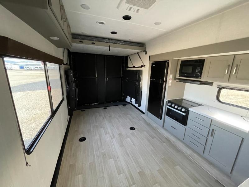 Enjoy a weekend of fun with family and friends with this wide open concept toy hauler featuring 15' of garage space for your toys! This unit sleeps six with the RV queen bed in front and the dual roll over sofas and bonus bunk in back. The 15' garage with 5K inter-lock system tie downs will get all of your cargo safely to your destination. Once in camp, the rear ramp door will help you easily unload and then set up the sofas with table in between. The kitchen slide featuring a hutch allows you to refuel your bodies easily by providing a three burner range and 17" black oven, a 10.7 cu. ft. 12V refrigerator for your perishables, and a residential microwave oven to warm up leftovers. The full bath will allow everyone to easily clean up after a full day of fun, and you will enjoy the private front bedroom with an RV queen bed and a full closet for all of your things. On the outside, an 18' power awning provides added living space, or you might like to add the optional patio packaged for a raised extension of your unit giving you an outdoor space to hang out and enjoy some fresh air between rides.
