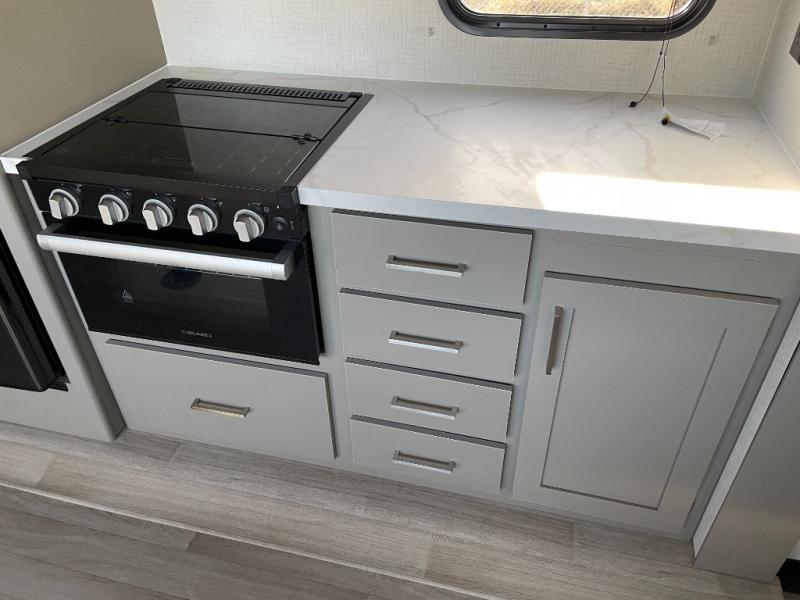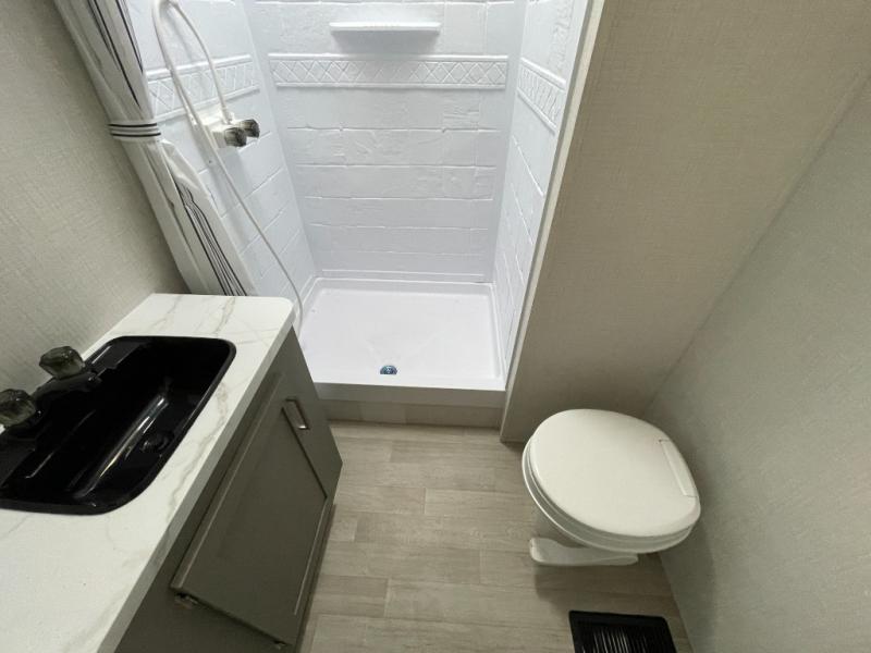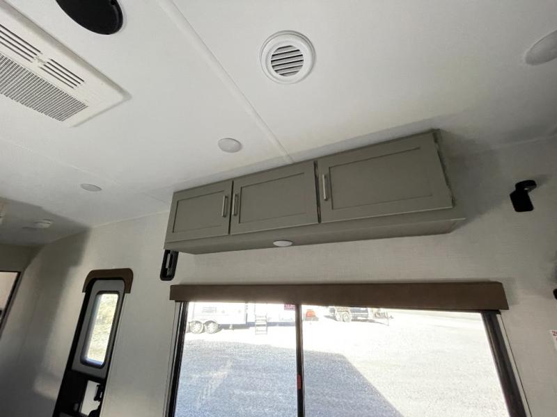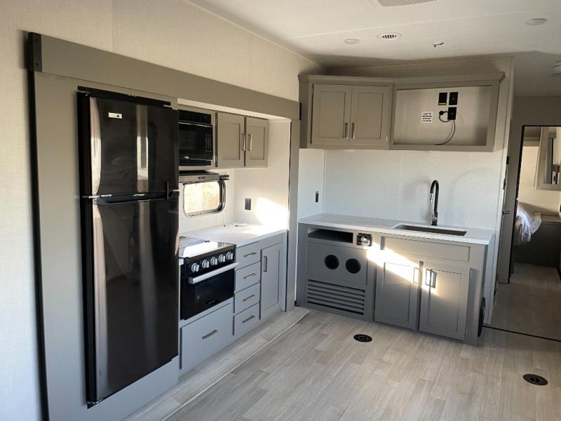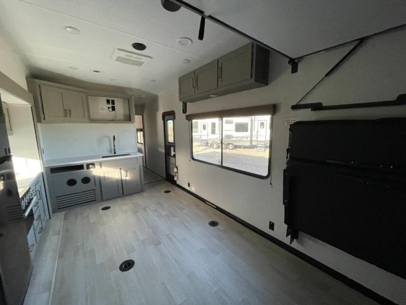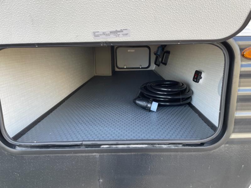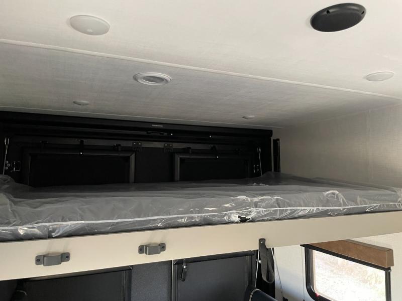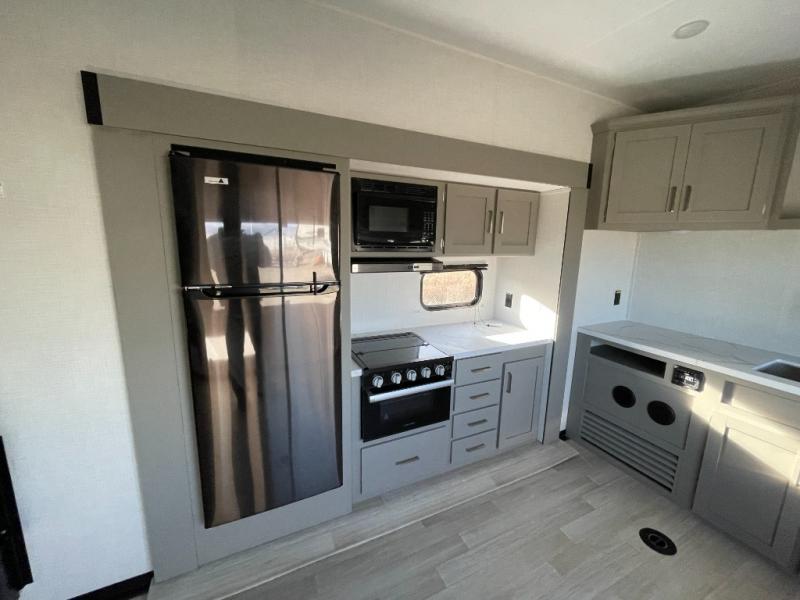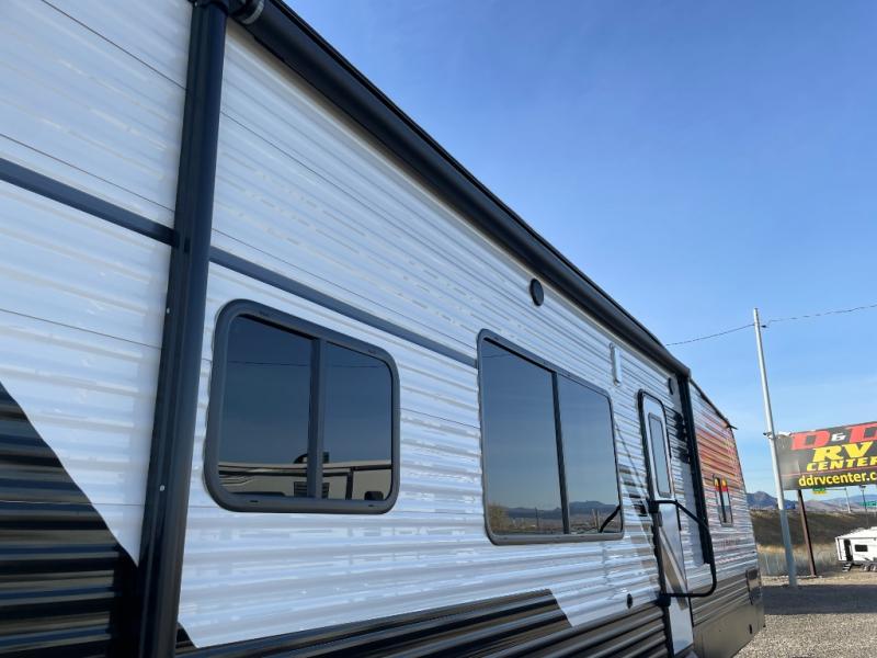 Enjoy a weekend of fun with family and friends with this wide open concept toy hauler featuring 15' of garage space for your toys! This unit sleeps six with the RV queen bed in front and the dual roll over sofas and bonus bunk in back. The 15' garage with 5K inter-lock system tie downs will get all of your cargo safely to your destination. Once in camp, the rear ramp door will help you easily unload and then set up the sofas with table in between. The kitchen slide featuring a hutch allows you to refuel your bodies easily by providing a three burner range and 17" black oven, a 10.7 cu. ft. 12V refrigerator for your perishables, and a residential microwave oven to warm up leftovers. The full bath will allow everyone to easily clean up after a full day of fun, and you will enjoy the private front bedroom with an RV queen bed and a full closet for all of your things. On the outside, an 18' power awning provides added living space, or you might like to add the optional patio packaged for a raised extension of your unit giving you an outdoor space to hang out and enjoy some fresh air between rides.
