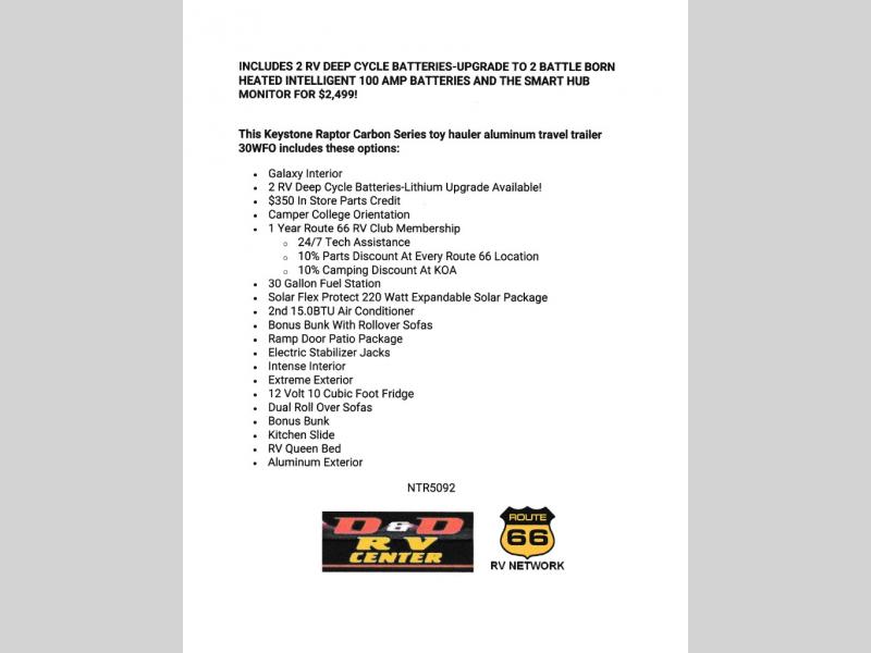 This Keystone Raptor Carbon Series toy hauler aluminum travel trailer 30WFO includes these options: