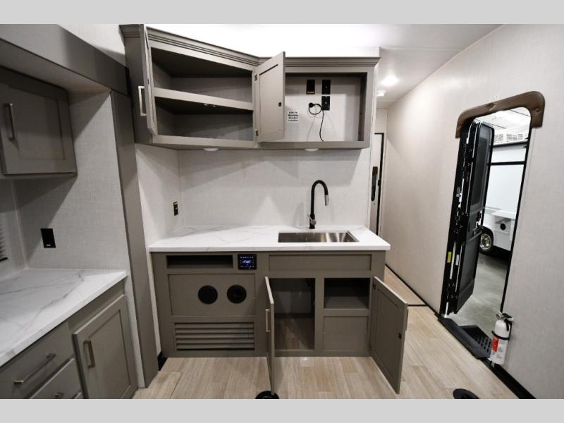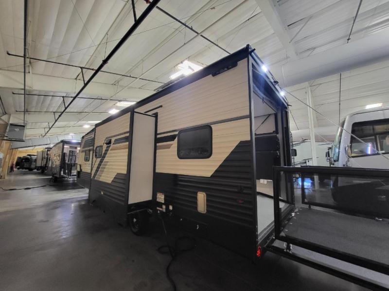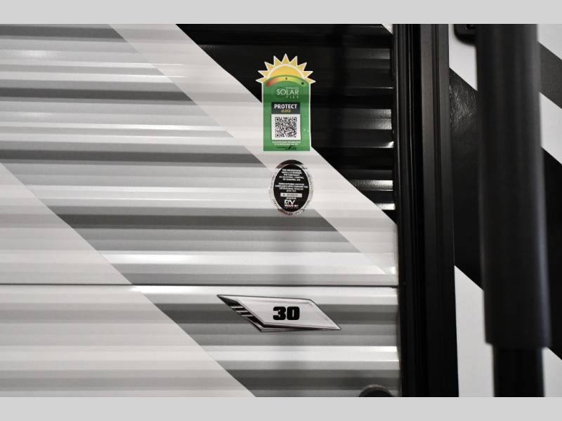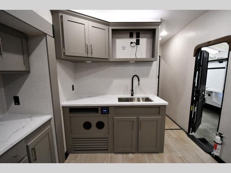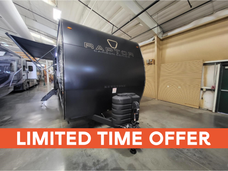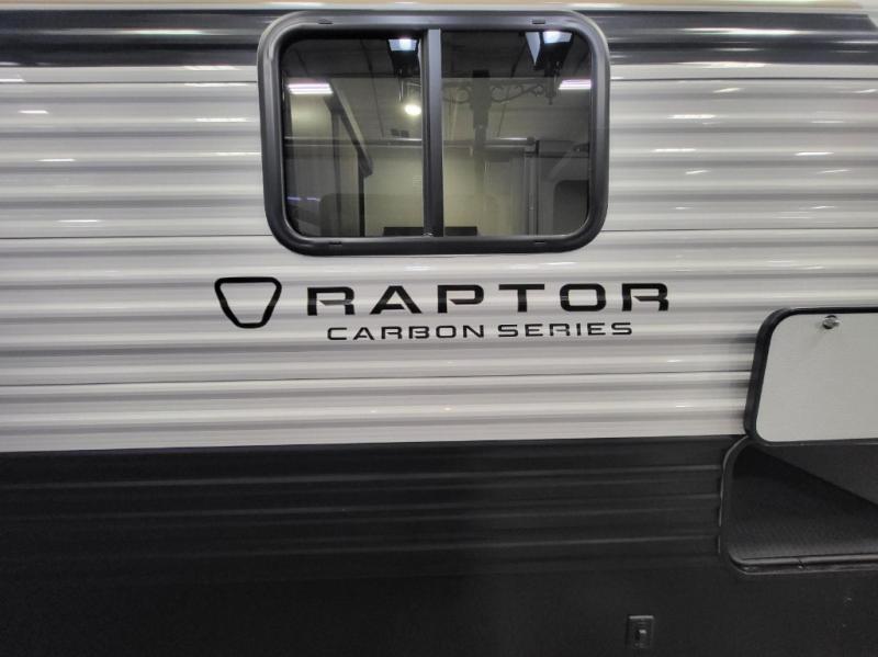 Each Raptor Carbon Series toy hauler travel trailer is built with a 10" I-beam frame, and aluminum sidewalls, a SuperFlex roof membrane, and new sleek exterior graphics! There is also a lighted pass-through storage outside, along with a hot/cold shower, MORryde StepAbove entry steps, and an exterior convenience center for all your hookups. Head inside to find refreshed interior decor, pull-down window shades, soft-close hardwood cabinetry with hidden hinges, and pressed countertops to name a few comforts!