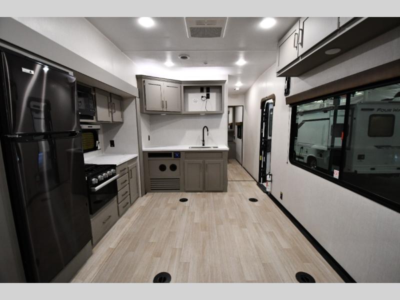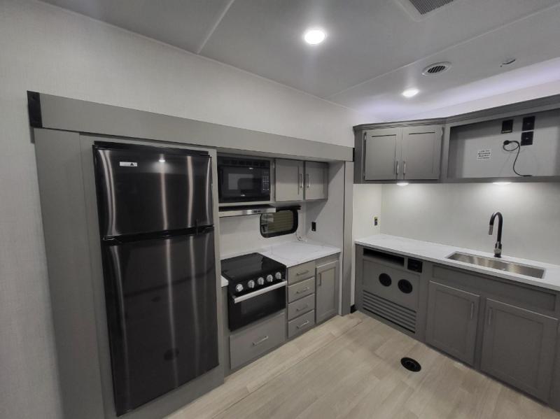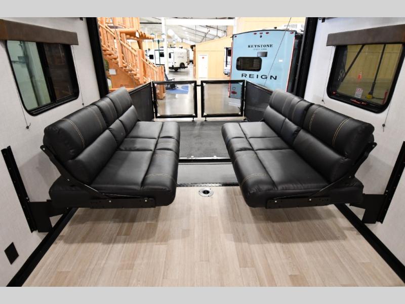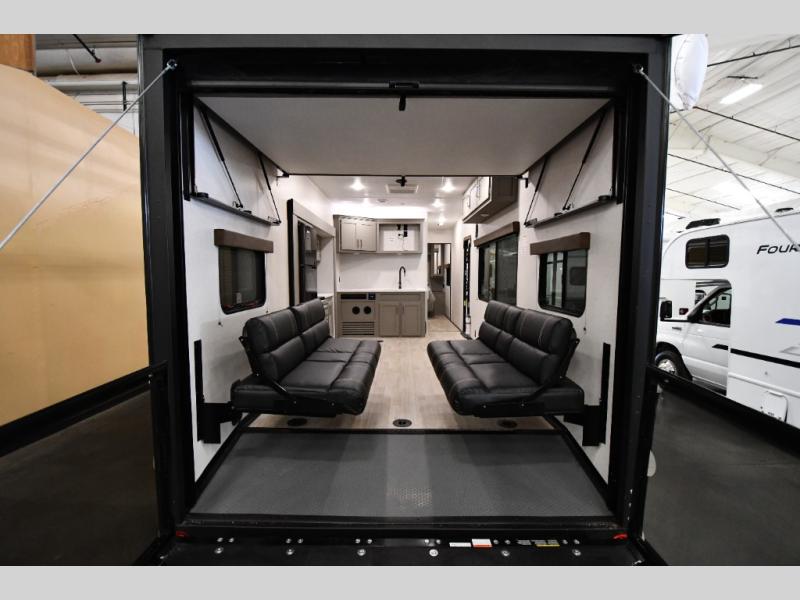 Enjoy a weekend of fun with family and friends with this wide-open concept toy hauler featuring 15' of garage space for your toys! This unit sleeps six with the RV queen bed in front and the dual roll over sofas and bonus bunk in back. The 15' garage with 5K inter-lock system tie downs will get all of your cargo safely to your destination. Once in camp, the rear ramp door will help you easily unload and then set up the sofas with table in between. The kitchen slide featuring a hutch allows you to refuel your bodies easily by providing a three-burner range and 17" black oven, a 12V refrigerator for your perishables, and a microwave oven to warm up leftovers. The full bath will allow everyone to easily clean up after a full day of fun, and you will enjoy the private front bedroom with an RV queen bed and a full closet for all of your things.