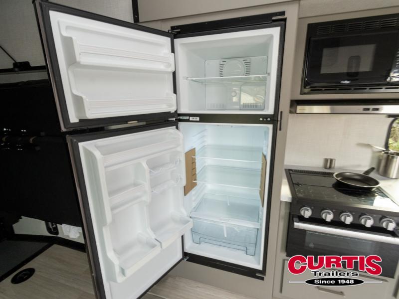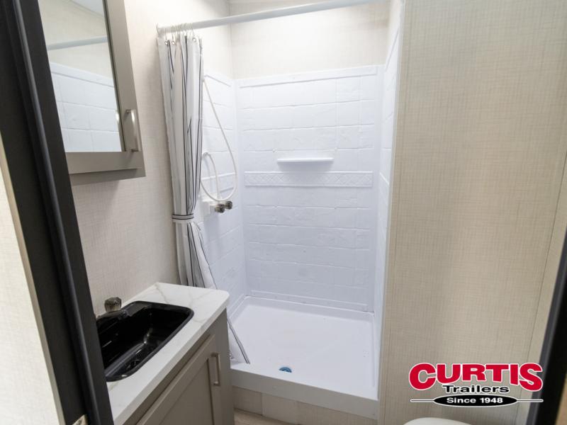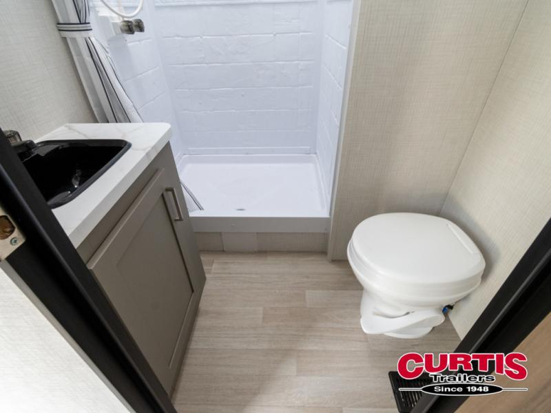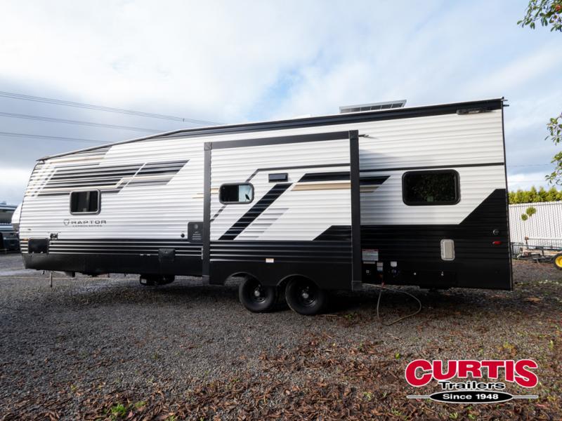 Each Raptor Carbon Series toy hauler travel trailer is built with a 10" I-beam frame, and aluminum sidewalls, a SuperFlex roof membrane, and new sleek exterior graphics! There is also a lighted pass-through storage outside, along with a hot/cold shower, MORryde StepAbove entry steps, and an exterior convenience center for all your hookups. Head inside to find refreshed interior decor, pull-down window shades, soft-close hardwood cabinetry with hidden hinges, and pressed countertops to name a few comforts!