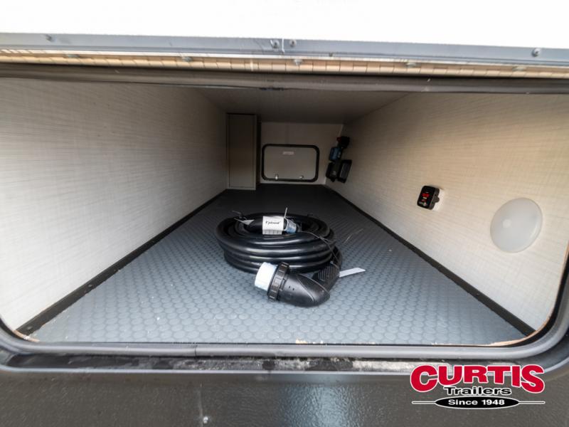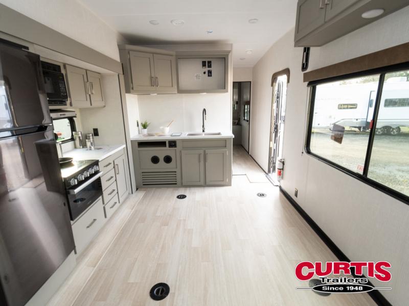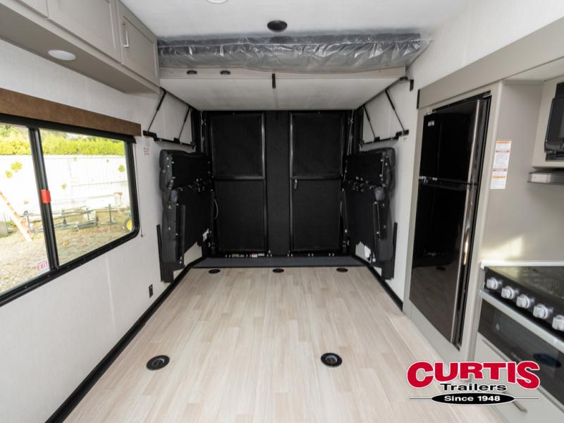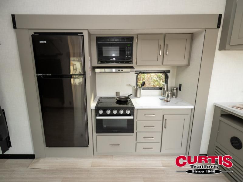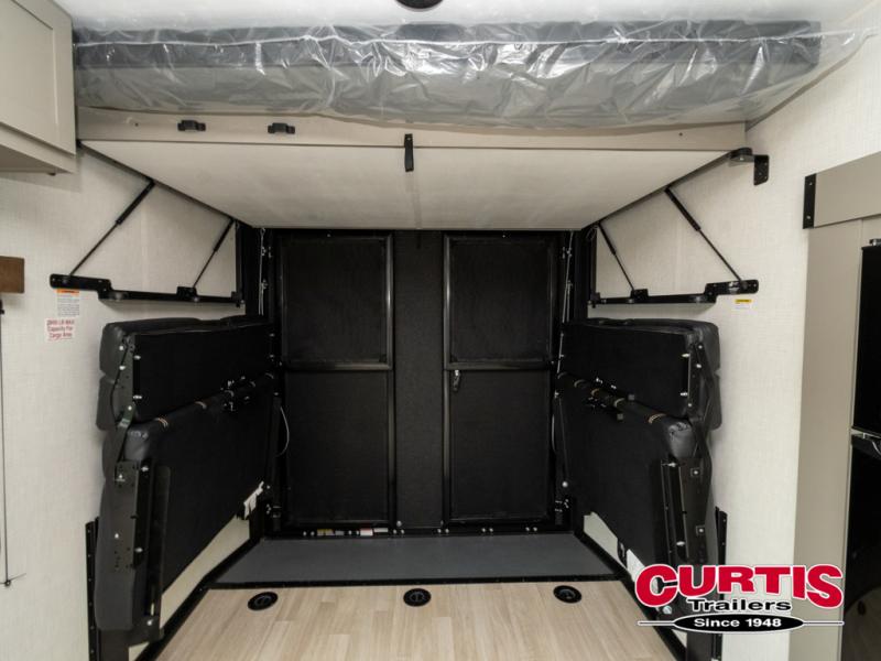 Enjoy a weekend of fun with family and friends with this wide-open concept toy hauler featuring 15' of garage space for your toys! This unit sleeps six with the RV queen bed in front and the dual roll over sofas and bonus bunk in back. The 15' garage with 5K inter-lock system tie downs will get all of your cargo safely to your destination. Once in camp, the rear ramp door will help you easily unload and then set up the sofas with table in between. The kitchen slide featuring a hutch allows you to refuel your bodies easily by providing a three-burner range and 17" black oven, a 12V refrigerator for your perishables, and a microwave oven to warm up leftovers. The full bath will allow everyone to easily clean up after a full day of fun, and you will enjoy the private front bedroom with an RV queen bed and a full closet for all of your things.