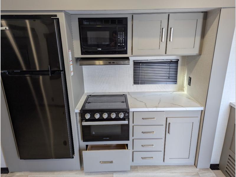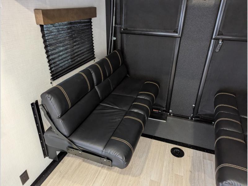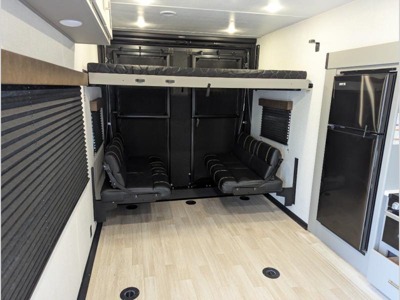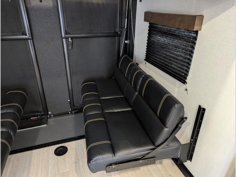 Enjoy a weekend of fun with family and friends with this wide-open concept toy hauler featuring 15' of garage space for your toys! This unit sleeps six with the RV queen bed in front and the dual roll over sofas and bonus bunk in back. The 15' garage with 5K inter-lock system tie downs will get all of your cargo safely to your destination. Once in camp, the rear ramp door will help you easily unload and then set up the sofas with table in between. The kitchen slide featuring a hutch allows you to refuel your bodies easily by providing a three-burner range and 17" black oven, a 12V refrigerator for your perishables, and a microwave oven to warm up leftovers. The full bath will allow everyone to easily clean up after a full day of fun, and you will enjoy the private front bedroom with an RV queen bed and a full closet for all of your things.