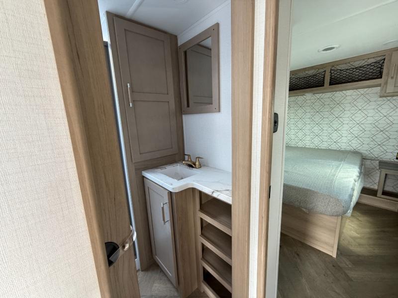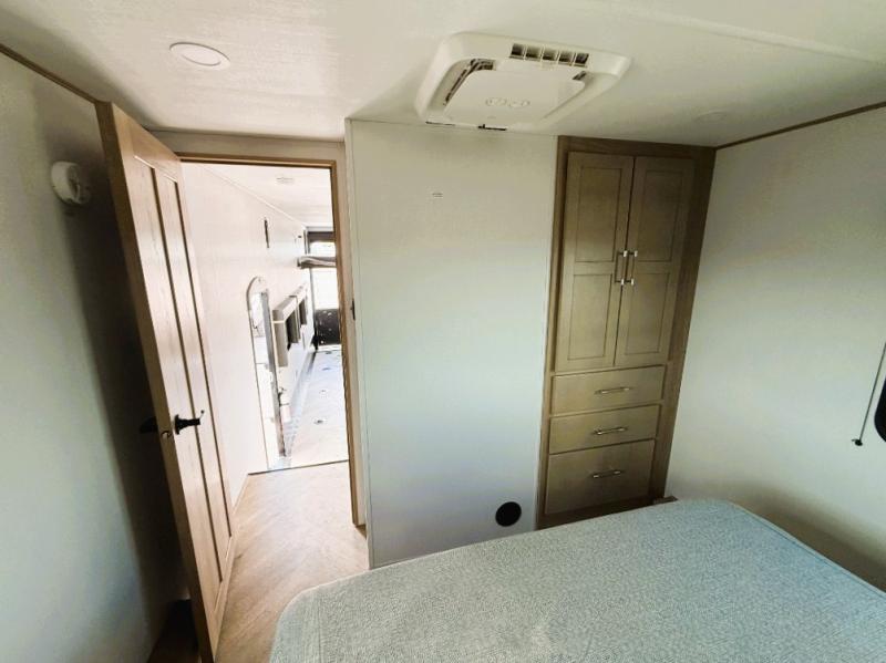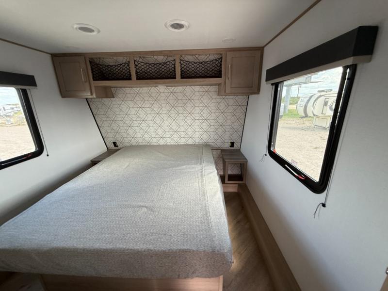 Load up your toys in the 15' 8" garage of this toy hauler! Once you arrive at the campground and unload the bikes, you can relax on the sofa with a top queen bed. There is also a flip-up countertop in the garage for added counterspace when you need it. The full kitchen will let you make meals each day, and the 10-cu. ft. 12V refrigerator will help you keep food stocked. A full bath is ready for you to freshen up each day, and a front private bedroom with a residential queen bed is sure to bring comfort. There are also dual nightstands, a wardrobe, and overhead storage so everything has a place!