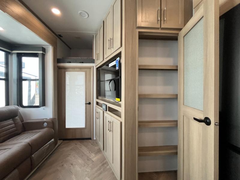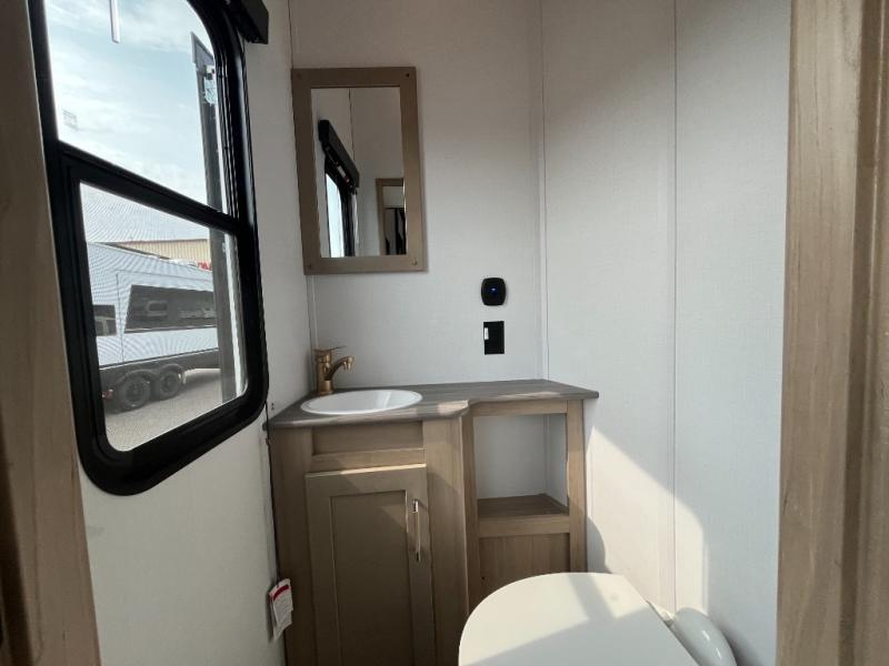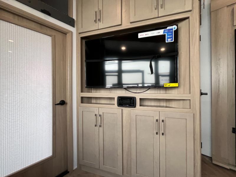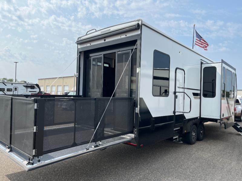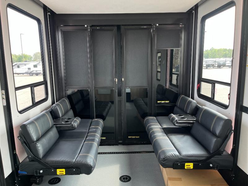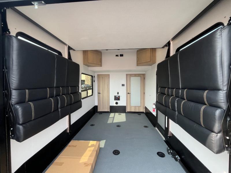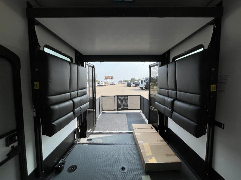 Load up your off-road toys for fun on the trails and comfort when you return to your campsite! You can relax on the sofa with recliners within a slide out in the main living and kitchen area or in the garage on the dual opposing sofas underneath the electric bed. Someone might even head up to the loft with a twin bed to take a nap. And there is a half bath in the 13' separate garage which will come in handy when your friends join you. You might even like to add a washer/dryer option in the garage to keep everything clean while away from home. The cook will love the large farmhouse style sink, the appliances to make meals, the pantry to store lots of goodies, and the peninsula countertop. And don't forget about the entertainment center with a 50" LED TV with surround sound. The full bathroom is next to the front bedroom which offers a king bed, wireless phone chargers and plenty of storage for your clothing including a slide out wardrobe.