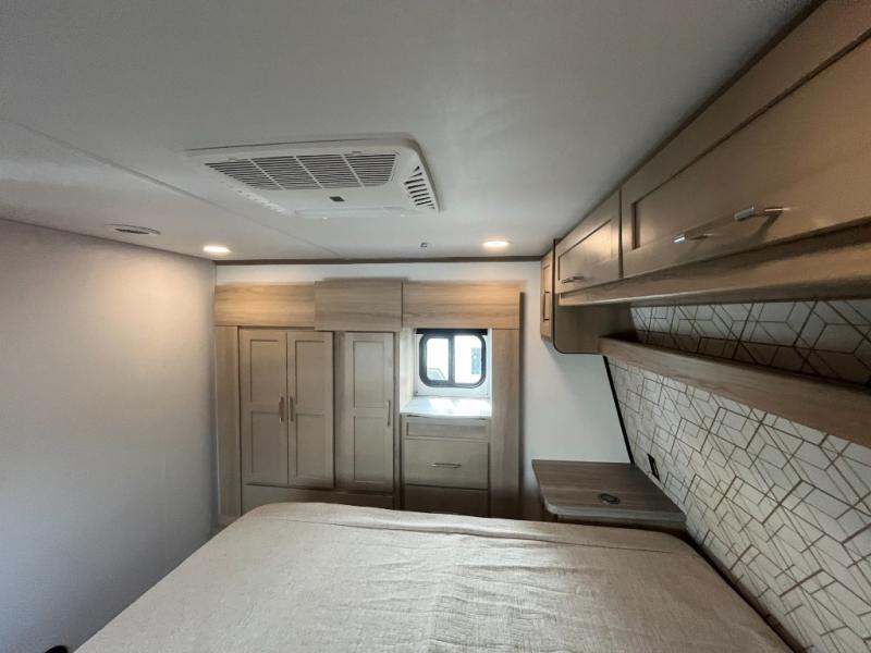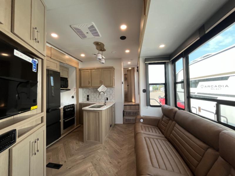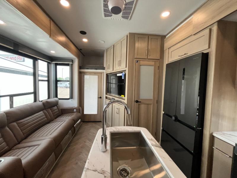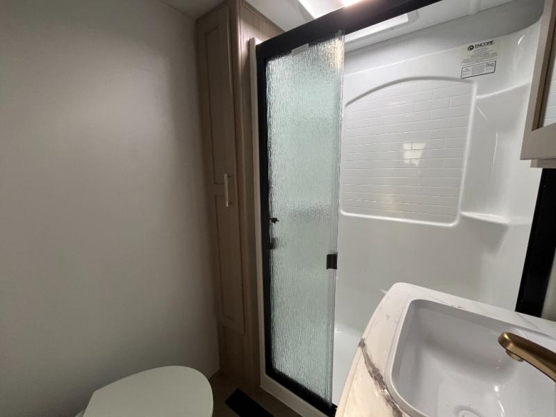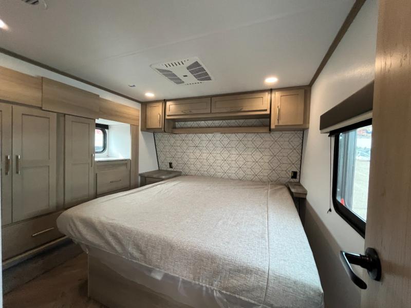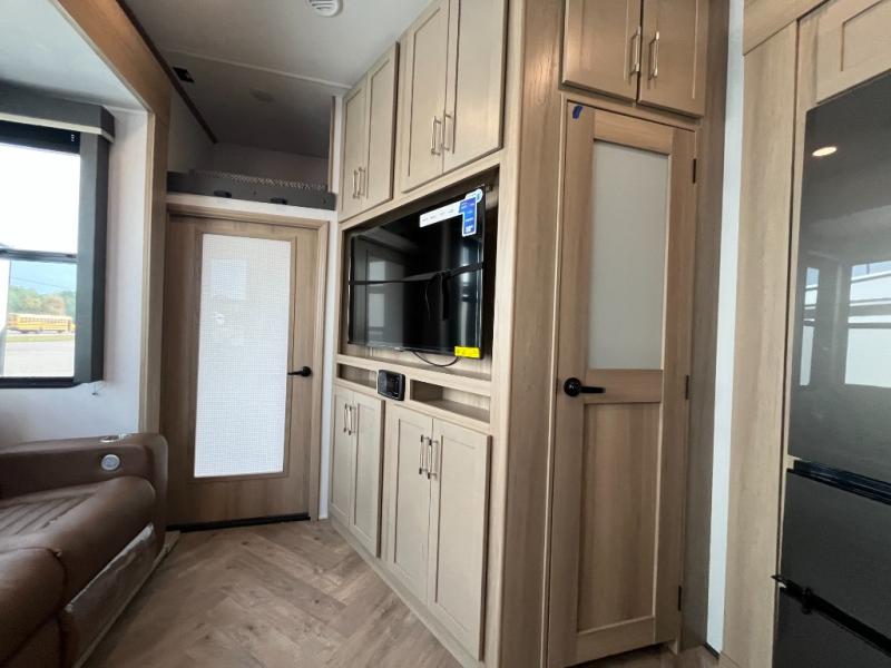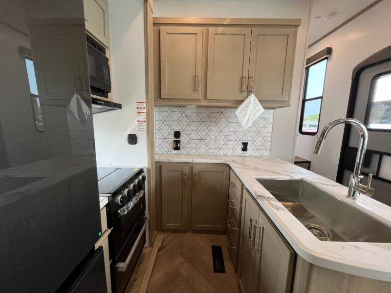 Load up your off-road toys for fun on the trails and comfort when you return to your campsite! You can relax on the sofa with recliners within a slide out in the main living and kitchen area or in the garage on the dual opposing sofas underneath the electric bed. Someone might even head up to the loft with a twin bed to take a nap. And there is a half bath in the 13' separate garage which will come in handy when your friends join you. You might even like to add a washer/dryer option in the garage to keep everything clean while away from home. The cook will love the large farmhouse style sink, the appliances to make meals, the pantry to store lots of goodies, and the peninsula countertop. And don't forget about the entertainment center with a 50" LED TV with surround sound. The full bathroom is next to the front bedroom which offers a king bed, wireless phone chargers and plenty of storage for your clothing including a slide out wardrobe.