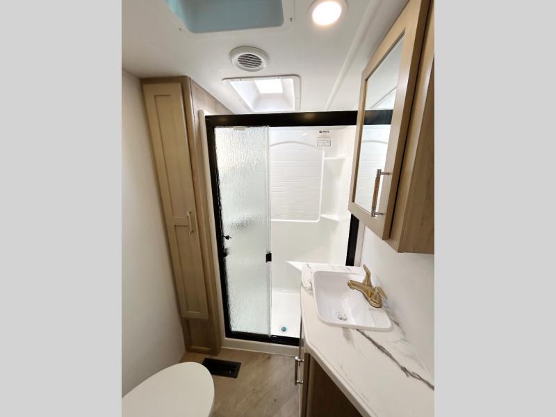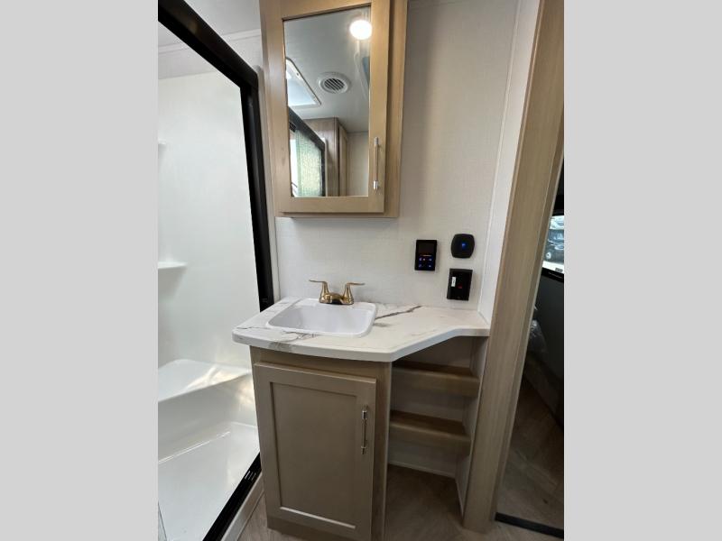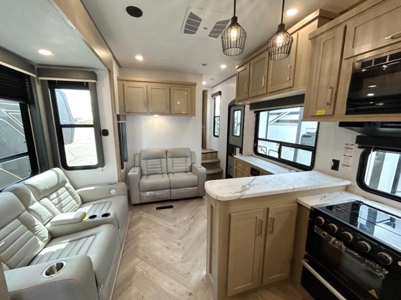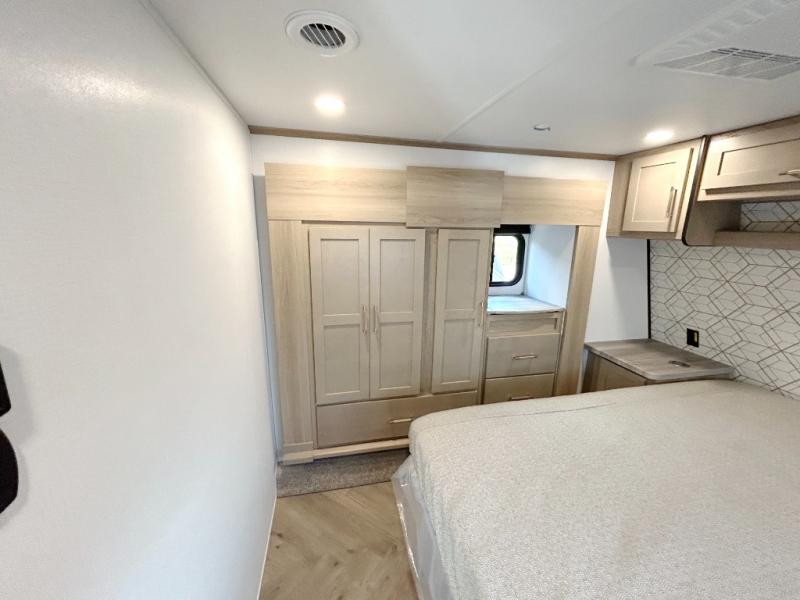 Trips to the lake with friends and family just got better with this toy hauler in tow! Once you've unloaded your toys from the 13' separate garage, head out to kick up some mud! The full bath with a 40" x 28" shower will be waiting for you when you return, and you can turn the garage into living space with its dual opposing sofas. There is also an electric bed here plus a loft with a twin bed for guests to sleep on. The combined kitchen and living area is also a place where everyone can gather thanks to the two double-seat sofas and raised bar with flip-up seats. And you'll find the front private bedroom to be ultra cozy with its king bed, slide out wardrobe with drawers, plus two additional wardrobes on either side of the bed. There is even nightstands with wireless phone chargers; how convenient!