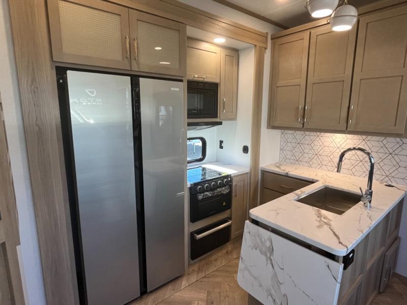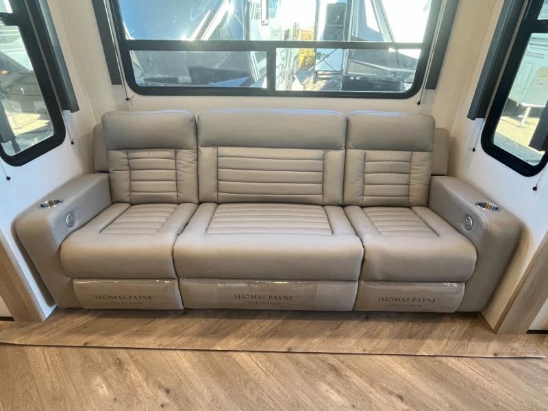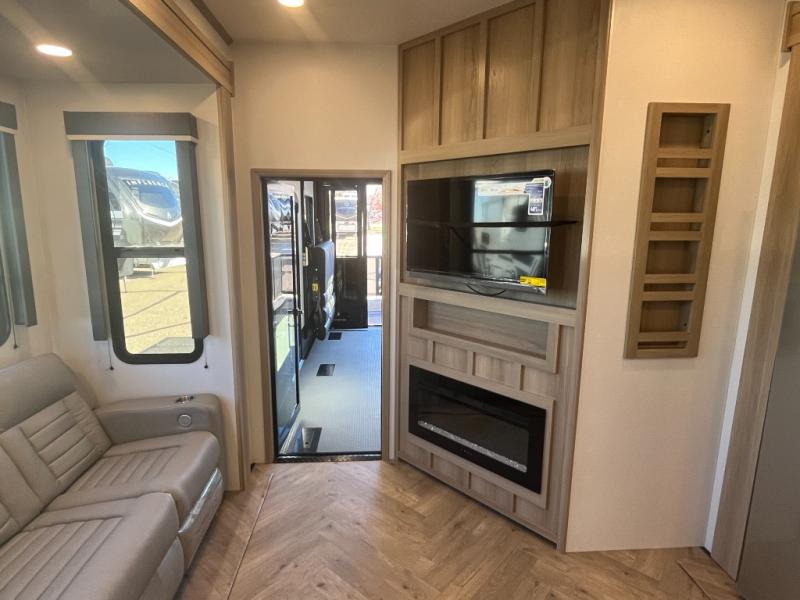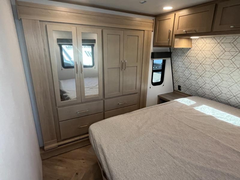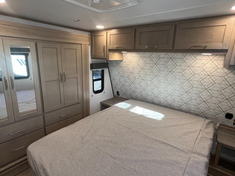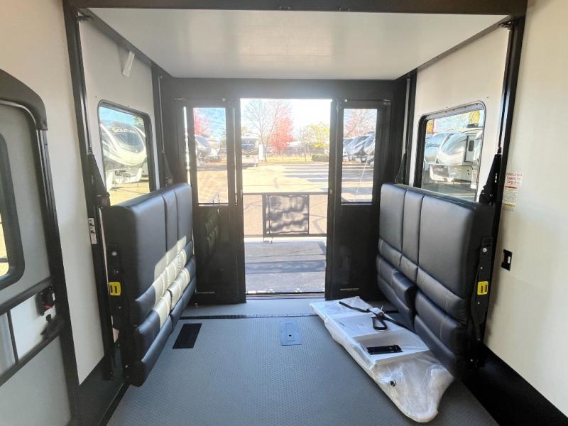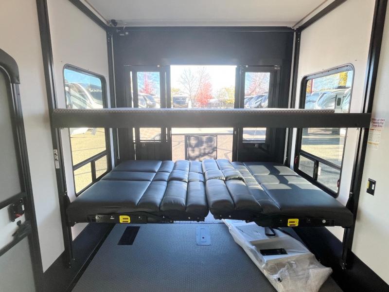 Featuring a spacious king bed with nightstands on each side, this front private bedroom will be your favorite spot to rest! The wardrobe with drawers provides ample storage for your clothes and personal items, helping you stay organized on the road. The bath and a half layout provides convenience and flexibility, ensuring that everyone has their own space to get ready in the morning. The living area is a vibrant hub of entertainment, featuring a reclining sofa with lumbar support and a tilting headrest. The state-of-the-art entertainment center with smart LED TV provides endless hours of fun, while the microwave and sink make meal prep a snap. Further, the garage is designed for ultimate adventure, with ample space for your favorite toys and an electric bed with dual opposing sofas that convert into a comfortable sleeping area.
