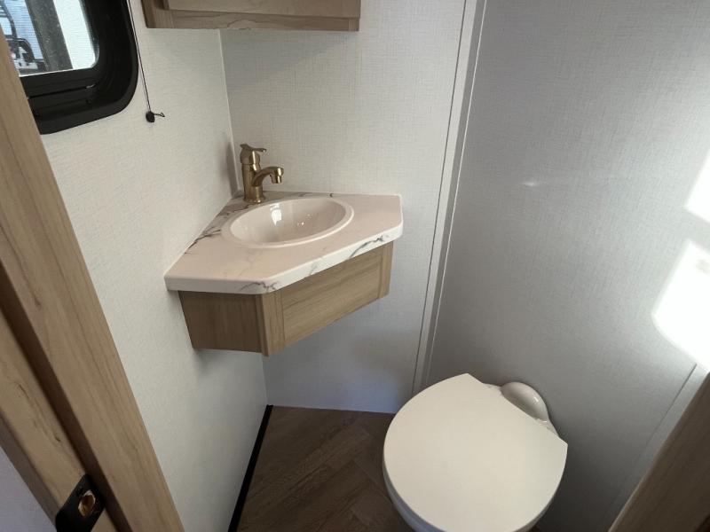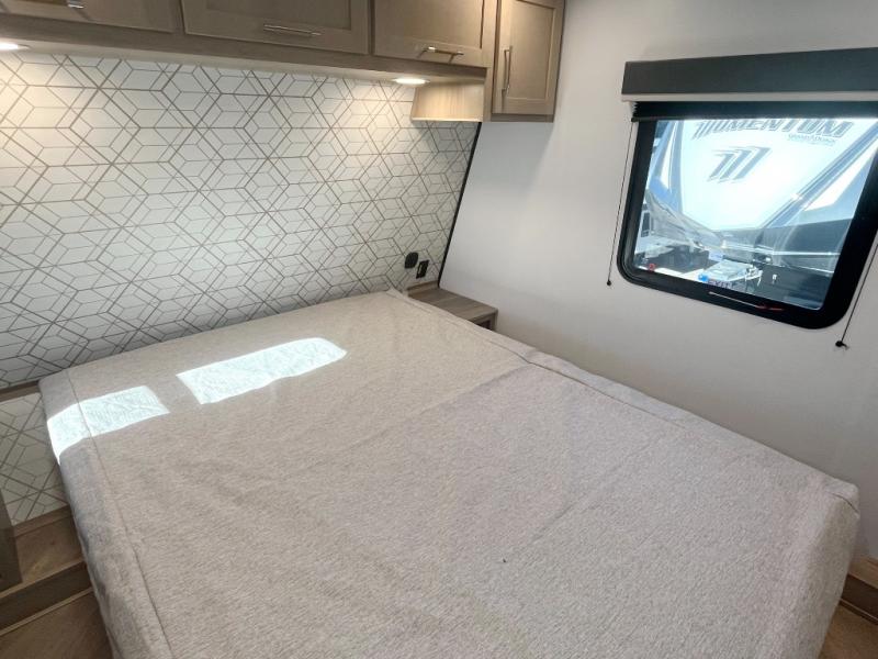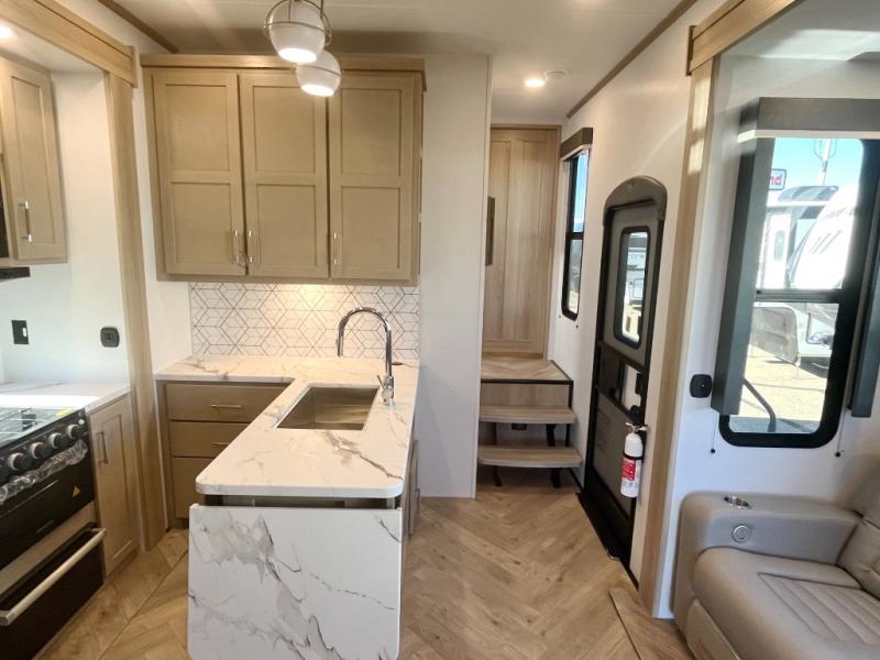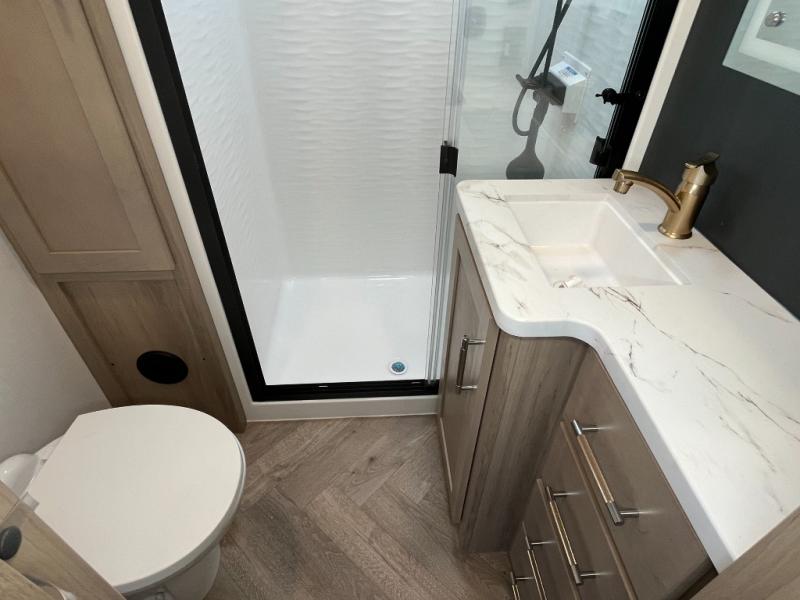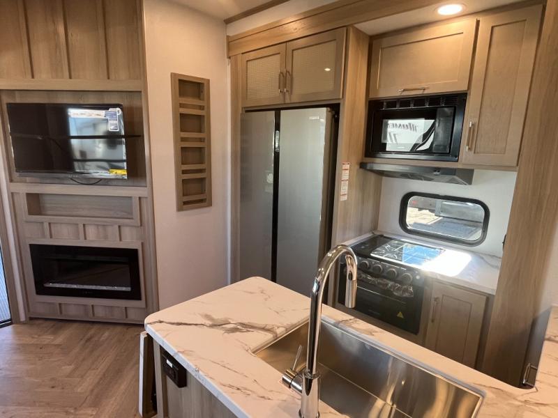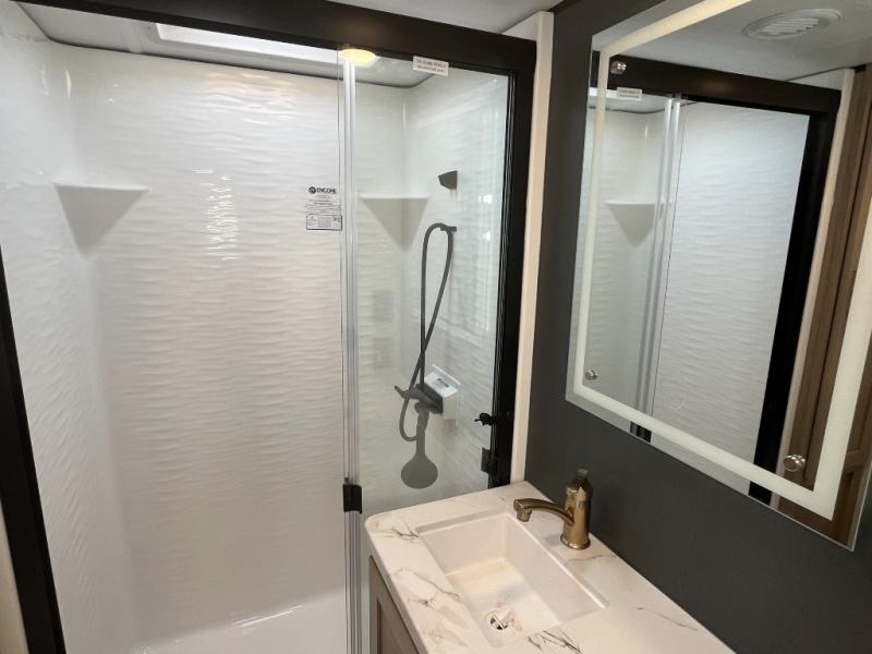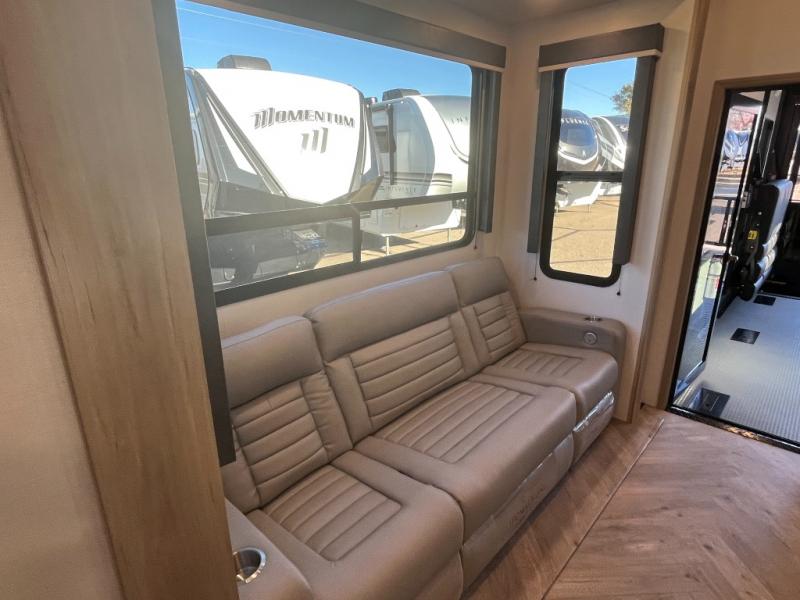 Featuring a spacious king bed with nightstands on each side, this front private bedroom will be your favorite spot to rest! The wardrobe with drawers provides ample storage for your clothes and personal items, helping you stay organized on the road. The bath and a half layout provides convenience and flexibility, ensuring that everyone has their own space to get ready in the morning. The living area is a vibrant hub of entertainment, featuring a reclining sofa with lumbar support and a tilting headrest. The state-of-the-art entertainment center with smart LED TV provides endless hours of fun, while the microwave and sink make meal prep a snap. Further, the garage is designed for ultimate adventure, with ample space for your favorite toys and an electric bed with dual opposing sofas that convert into a comfortable sleeping area.