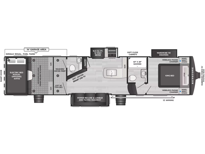 Load up your off-road toys for fun on the trails and comfort when you return to your campsite! You can relax on the sofa with recliners within a slide out in the main living and kitchen area or in the garage on the dual opposing sofas underneath the electric bed. Someone might even head up to the loft with a twin bed to take a nap. And there is a half bath in the 13' separate garage which will come in handy when your friends join you. You might even like to add a washer/dryer option in the garage to keep everything clean while away from home. The cook will love the large farmhouse style sink, the appliances to make meals, the pantry to store lots of goodies, and the peninsula countertop. And don't forget about the entertainment center with a 50" LED TV with surround sound. The full bathroom is next to the front bedroom which offers a king bed, wireless phone chargers and plenty of storage for your clothing including a slide out wardrobe.